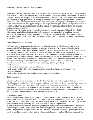 Innowacyjny Klaster Turystyczny w Norwegii Innowacyjny Klaster Turystyki Górskiej w Norwegii zlokalizowany w Płd-Zachodniej części Norwegii. Składa się z 7 turystycznych lokalizacji: Geilo, Hemsedel, Golsfjellet, Vradal, Gausta/Rjukan, Rauland i Hovden. Obszar ten pokrywa 3 „starostw" Buskerud, Telemark i East-Adger. Przez wiele lat region ten cieszył się dużą popularnością ze strony mieszkańców Skandynawii ze względu na doskonałe warunki do uprawiania sportów zimowych. Przez ostatnie ok. 15 lat podjęto szereg działań, których celem było zwiększenie atrakcyjności regionu dla turystów zimowych. Rozwinęła się infrastruktura w postaci hoteli, wyciągów narciarskich itd., tym samym tworząc kompleksową ofertę dla turystów krajowych i zagranicznych. W 2008 r. ok. 1,2 mln turystów odwiedziło ten region w okresie zimowym. W latach 2004-2007 odnotowano niewielki spadek liczby turystów w sezonie zimowym. Jest to wynikiem rosnącej konkurencji pomiędzy regionami europejskimi. Obniżone koszty przelotów, odkrywanie nowych celów turystycznych oraz popyt na sprawdzoną ofertę turystyczną wpłynęło na wyższą konkurencję w branży. Potencjał gospodarczy skupienia Te 3 wspomniane obszary skupiają łącznie 500 000 mieszkańców, a 7 lokalizacji zatrudnia w turystyce ok. 23% ludności zatrudnionej w sektorze prywatnym. W wybranych lokalizacjach zatrudnienie sięga nawet 40%. W latach 2000-2005 wzrosło zatrudnienie o ok. 4,5%. W porównaniu z innymi regionami turystyki zimowej wzrost zatrudnienia jest stosunkowo niewielki. Np. w Drangedal, Trysil, Oppdal i Grong średni wzrost zatrudnienia w tym samym okresie wyniósł 23%. Niepokojącym zjawiskiem mającym miejsce w regionie tych 3 gmin był obserwowany istotny ok. 20% spadek liczby turystów w okresie letnim. Przeprowadzone badanie pilotażowe pokazało, że klaster tworzą głównie firmy sektora MSP charakteryzujące się niską zdolności do innowacji. Zidentyfikowane 4 główne bariery rozwoju innowacyjnej turystyki letniej: - brak kapitału, - brak wymiany informacji pomiędzy aktorami, - brak wiedzy nt. turystów oraz jak opracowywać , sprzedawać nowe produkty na rynku międzynarodowym, - brak struktury w odniesieniu do planowania rozwoju infrastruktury. Historia powstania Inicjatywa utworzenie Innowacyjnego Klastra Turystyki Górskiej w Norwegii zrodziła się w 2003 r. Wśród podmiotów zainteresowanych znalazły się firmy, instytucje publiczne oraz instytucje naukowe z 3 gmin. Wówczas rozpoczęto prace nad możliwością utworzenia klastra, które celem miało być w szczególności przyciągnięcie turystów w okresie letnim. Pierwszym krokiem, który podjęto była analiza potencjału, która wskazała, że w klastrze znajdują się partnerzy reprezentujący wszystkie sfery tzw. potrójnej helisy czyli biznesu, administracji oraz nauki. Źródła finansowania Inicjatywa klastrowa była i jest finansowana ze źródeł zewnętrznych i wewnętrznych. Partnerzy otrzymali dofinansowanie w wysokości 1 mln euro z norweskiego programu ARENA w 2004 r. na okres 3 lat. Łącznie budżet w ciągu tych 3 lata sięgnął poziomu 3,7 mln euro. Z tej kwoty ok. 1,4 mln euro stanowiło wkład prywatny a 1,3 mln euro inne finansowanie publiczne. W 2008 r. inicjatywa planowała złożyć kolejny projekt, którego celem było utworzenie z inicjatywy Norweskiego Centrum Doskonałości, co umożliwiłoby pozyskanie finansowania na kolejne 10 lat. Jedna z miejscowości zdecydowała się nie brać udziału w projekcie i wycofała. Tym samym, zarząd uznał, że struktura klastra została na tyle osłabiona, że bezcelowe będzie składanie tego projektu. Struktura organizacyjna Klaster tworzą podmioty reprezentujące wszystkie obszary potrójnej helisy: biznes, nauka i administracja. Łącznie w Innowacyjnym Klastrze Turystyki Górskiej znajduje się ok. 100 podmiotów. Większość z nich to przedsiębiorstwa (86). Zdecydowanie w strukturze przeważają małe firmy zatrudniające do 50 osób. Ponad 1/3 tych firm to hotele oraz inne rodzaje miejsc noclegowych. 20 firm reprezentuje działalność aktywną, 9 firm pracuje w obszarze sprzedaży i marketingu, a 23 to różnorakie firmy usługowe (catering, transport, lokalni producenci żywności, rzemiosło itp.). Jeśli chodzi o organizację wewnętrzną od 2006 r. zmieniono koncepcję w tym zakresie. Prezes Komitetu Zarządzającego jest przedstawiciel biznesu. Komitet Sterujący składa się z 11 członków, w tym 6 z biznesu, 2 z instytucji badawczych, 1 osoba pochodzi z Norweskiej rady ds. Badań, 1 z Innovation Norway oraz przedstawiciel trzech gmin, czyli z administracji. Działania i efekty Celem Norweskiego Klastra Turystyki Górskiej jest rozwój turystyki górskiej w opłacalny, całoroczny produkt. Celem strategii jest wzmocnienie współpracy pomiędzy członkami poprzez organizowanie spotkań oraz platform współpracy. W strategii w 2004 r. wskazano na 4 kluczowe obszary działania: - sieciowanie i rozwój wiedzy w ramach klastra, - przedsiębiorczość i rozwój produktów, - konceptualizacja i sprzedaż, - warunki ramowe. W 2008 r. podsumowano kolejny okres działalności klastra, w którym podjęto ponad 40 działań projektowych. Działania te związane były z: analizą m.in. rynkową (16), rozwojem projektu (15), organizacją warsztatów/seminariów/szkoleń (6), organizacją konferencji (5), organizacją wyjazdów studyjnych (5). Plany na przyszłość Najważniejszym elementem planowanej przyszłości jest znalezienie nowych źródeł finansowania projektu. We wrześniu skończył się okres realizacji projektu ARENA. W roku 2009 r. nastąpił pewien rozłam w inicjatywie, związany z wycofaniem się z realizacji projektu Centrum Doskonałości jednej z lokalizacji. Obecnie wyzwaniem stojącym przed inicjatywą jest zdobycie projektu kontynuowanie działalności na rzecz klastra.