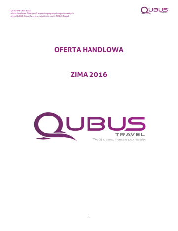 QT-02-09-OHZ/2015 oferta handlowa ZIMA 2016 imprez turystycznych organizowanych przez QUBUS Group Sp. z o.o., właściciela marki QUBUS Travel OFERTA HANDLOWA ZIMA 2016 1 QT-02-09-OHZ/2015 oferta handlowa ZIMA 2016 imprez turystycznych organizowanych przez QUBUS Group Sp. z o.o., właściciela marki QUBUS Travel INFORMACJE DOTYCZĄCE WSZYSTKICH OFERT WYPOCZYNKU DZIECI I MŁODZIEŻY SZKOLNEJ ZNAJDUJĄCYCH SIĘ PONIŻEJ 1. Organizatorem Turystyki, i młodzieży szkolnej jest: posiadającym niezbędne uprawnienia do organizacji wypoczynku dzieci QUBUS Group Sp. z o.o. 40-208 Katowice, ul. Ścigały 10 NIP 954-274-52-73 REGON 243377021 KRS 0000477970 wpisana do Rejestru Organizatorów Turystyki i Pośredników Turystycznych Marszałka Województwa Śląskiego pod numerem 1016, posiadająca gwarancję ubezpieczeniową AXA Towarzystwa Ubezpieczeń i Reasekuracji S.A. w Warszawie, Departamentu Ubezpieczeń Turystycznych Oddziału Regionalnego w Katowicach, prowadząca działalność turystyczną pod nazwą QUBUS Travel. 2. 3. 4. 5. 6. Każda forma wypoczynku, organizowana przez QUBUS Group Sp. z o.o. z siedzibą w Katowicach jest rejestrowana w Śląskim Kuratorium Oświaty, a najpóźniej na 10 dni przed rozpoczęciem danej formy wypoczynku (danego turnusu) zaświadczenie o zarejestrowaniu turnusu jest udostępniane do wglądu dla Rodziców w siedzibie firmy lub przesyłane na życzenie Rodzica mailem na wskazany adres e-mail. Zgłoszenie wypoczynku do bazy wypoczynku, prowadzonej przez Ministra Edukacji Narodowej, można sprawdzić na stronie internetowej www.wypoczynek.men.gov.pl, wpisując odpowiednie dane dot. organizatora (woj. śląskie, powiat m.Katowice) oraz związane z miejscem wypoczynku. Informacje dotyczące transportu organizatora: miasta, z których organizowany jest transport na poszczególne formy wypoczynku, wpisane są do druku Umowy o świadczenie usług turystycznych. Miejsce oraz godzina zbiórki w danym mieście publikowane są na stronie internetowej www.szkolatropicieli.pl najpóźniej na 7 dni przed rozpoczęciem turnusu – zawsze w zakładce „Strefa Rodzica”. Informacja zawiera również dane dotyczące środka transportu, trasy oraz osoby odpowiedzialnej, z ramienia organizatora, za przeprowadzenie transportu - jej imię, nazwisko oraz numer telefonu. Transport własny Rodzica: w dokumencie informujemy również Rodziców, niekorzystających z transportu organizatora, o której należy przywieźć dziecko do zamku w pierwszym dniu wypoczynku oraz o której należy dziecko odebrać w ostatnim dniu wypoczynku. Informacja dotycząca rozpoczęcia i zakończenia każdej formy wypoczynku (każdego turnusu): każdy turnus rozpoczyna się obiadem w pierwszym dniu turnusu, a kończy śniadaniem w dniu ostatnim, dodatkowo w ostatnim dniu uczestnik, korzystający z transportu organizatora, otrzymuje suchy prowiant na drogę powrotną (w postaci np.: bułki z serem, batonika 0,5 l wody mineralnej niegazowanej). Dokładne godziny pierwszego i ostatniego posiłku turnusu są publikowane w informacji transportowej najpóźniej na 7 dni przed rozpoczęciem danego turnusu. Przypominamy, że dzień pierwszy i ostatni przeznaczony jest na czynności organizacyjne, a nie właściwy wypoczynek. Informacja dotycząca kontaktu rodzica/prawnego opiekuna z uczestnikiem wypoczynku: rodzic/prawny opiekun może kontaktować się ze swoim dzieckiem (uczestnikiem wypoczynku) na telefon komórkowy dziecka w czasie, kiedy uczestnik przebywa w swoim pokoju (telefony komórkowe uczestnicy mają obowiązek pozostawiania w pokoju, za wyjątkiem wycieczek). Rodzic/prawny opiekun może kontaktować się ze swoim dzieckiem przez telefon służbowy kierownika turnusu w czasie posiłków, gdy wszyscy uczestnicy są w jednym miejscu. Rodzic/prawny opiekun może zasięgnąć informacji o swoim dziecku wyłącznie od kierownika turnusu o określonych godzinach. Numery telefonów poszczególnych wychowawców nie będą udostępniane. Numer telefonu kierownika turnusu oraz szczegółowe zasady kontaktu będą podane w informacji transportowej, która zostanie opublikowana najpóźniej na 7 dni przed rozpoczęciem danego turnusu – w zakładce „Strefa Rodzica” na stronie www.szkolatropicieli.pl Niniejsza oferta handlowa stanowi integralną część Umowy o świadczenie usług turystycznych. 2 QT-02-09-OHZ/2015 oferta handlowa ZIMA 2016 imprez turystycznych organizowanych przez QUBUS Group Sp. z o.o., właściciela marki QUBUS Travel Drogi Rodzicu! Zanim podpiszesz Umowę, zapoznaj się z ofertą wybranej imprezy turystycznej (zimowiska), przedstaw ją dziecku i upewnij się, że mu się podoba. Następnie przeczytaj dokładnie Ogólne warunki uczestnictwa oraz Regulamin imprez turystycznych i przedyskutuj z dzieckiem punkty, które go dotyczą. Po podpisaniu Umowy wpłać zaliczkę w wysokości 300,00 zł, a pozostałą wymagalną kwotę na 21 dni przed turnusem. Pamiętaj o wysłaniu Karty Kwalifikacyjnej uczestnika! Dane do przelewu: QUBUS GROUP Sp. z o.o. 40-208 Katowice, ul. Ścigały 10 Numer konta bankowego: ALIOR BANK 11 2490 0005 0000 4600 5848 3177 w tytule: imię i nazwisko uczestnika oraz KOD turnusu __________________________________________________________________________________________________________ INFORMACJE DLA RODZICÓW KORZYSTAJĄCYCH Z DOFINANSOWANIA DO WYPOCZYNKU Z ZAKŁADOWEGO FUNDUSZU ŚWIADCZEŃ SOCJLANYCH I/LUB INNYCH DOFINANSOWAŃ Szanowni Rodzice uczestników niezwykłych kolonii, zimowisk i obozów w polskich zamkach! Przedstawiam informacje dla tych z Państwa, którzy korzystają z różnego rodzaju dofinansowań. 1. Organizator Turystyki QUBUS Group Sp. z o. o. z siedzibą w Katowicach wystawia zaświadczenia o udziale dziecka w zorganizowanym wypoczynku, jako że jest uprawnionym przedsiębiorcą do organizowania tego typu imprez turystycznych. 2. Zaświadczenia wydaje się na prośbę Rodzica, przesłanej mailem na adres [email protected]. Prośba powinna zawierać d