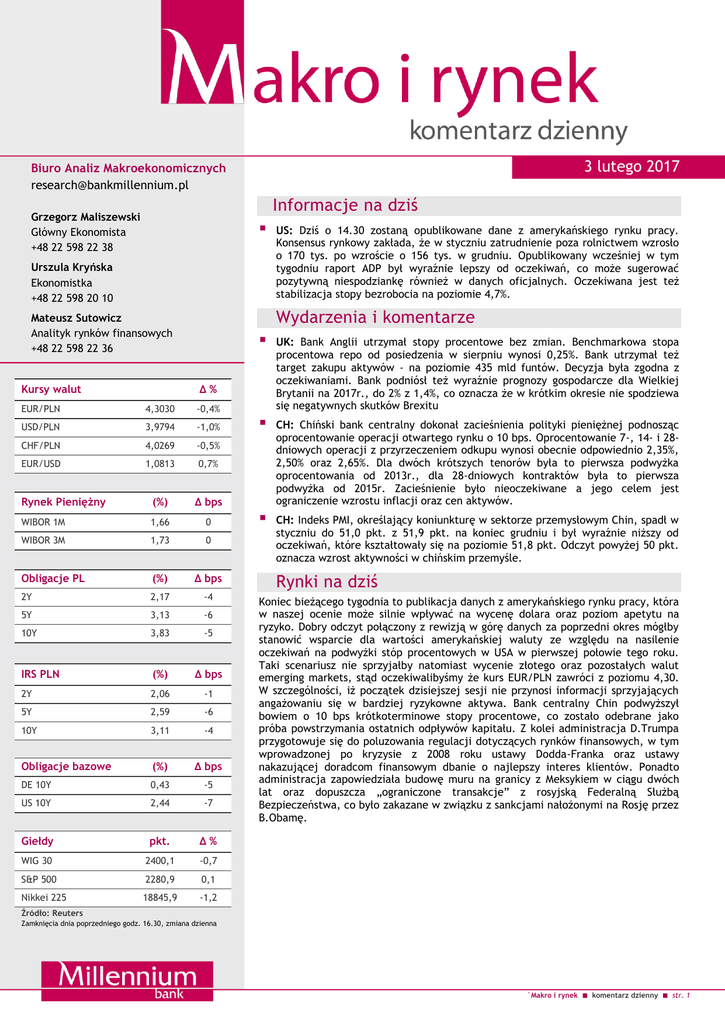 3 lutego 2017 Biuro Analiz Makroekonomicznych [email protected] Informacje na dziś Grzegorz Maliszewski Główny Ekonomista +48 22 598 22 38 Urszula Kryńska Ekonomistka +48 22 598 20 10 Wydarzenia i komentarze Mateusz Sutowicz Analityk rynków finansowych +48 22 598 22 36 Kursy walut US: Dziś o 14.30 zostaną opublikowane dane z amerykańskiego rynku pracy. Konsensus rynkowy zakłada, że w styczniu zatrudnienie poza rolnictwem wzrosło o 170 tys. po wzroście o 156 tys. w grudniu. Opublikowany wcześniej w tym tygodniu raport ADP był wyraźnie lepszy od oczekiwań, co może sugerować pozytywną niespodziankę również w danych oficjalnych. Oczekiwana jest też stabilizacja stopy bezrobocia na poziomie 4,7%. UK: Bank Anglii utrzymał stopy procentowe bez zmian. Benchmarkowa stopa procentowa repo od posiedzenia w sierpniu wynosi 0,25%. Bank utrzymał też target zakupu aktywów - na poziomie 435 mld funtów. Decyzja była zgodna z oczekiwaniami. Bank podniósł też wyraźnie prognozy gospodarcze dla Wielkiej Brytanii na 2017r., do 2% z 1,4%, co oznacza że w krótkim okresie nie spodziewa się negatywnych skutków Brexitu CH: Chiński bank centralny dokonał zacieśnienia polityki pieniężnej podnosząc oprocentowanie operacji otwartego rynku o 10 bps. Oprocentowanie 7-, 14- i 28dniowych operacji z przyrzeczeniem odkupu wynosi obecnie odpowiednio 2,35%, 2,50% oraz 2,65%. Dla dwóch krótszych tenorów była to pierwsza podwyżka oprocentowania od 2013r., dla 28-dniowych kontraktów była to pierwsza podwyżka od 2015r. Zacieśnienie było nieoczekiwane a jego celem jest ograniczenie wzrostu inflacji oraz cen aktywów. CH: Indeks PMI, określający koniunkturę w sektorze przemysłowym Chin, spadł w styczniu do 51,0 pkt. z 51,9 pkt. na koniec grudniu i był wyraźnie niższy od oczekiwań, które kształtowały się na poziomie 51,8 pkt. Odczyt powyżej 50 pkt. oznacza wzrost aktywności w chińskim przemyśle. Δ% EUR/PLN 4,3030 -0,4% USD/PLN 3,9794 -1,0% CHF/PLN 4,0269 -0,5% EUR/USD 1,0813 0,7% Rynek Pieniężny (%) Δ bps WIBOR 1M 1,66 0 WIBOR 3M 1,73 0 Obligacje PL (%) Δ bps 2Y 2,17 -4 5Y 3,13 -6 10Y 3,83 -5 IRS PLN (%) Δ bps 2Y 2,06 -1 5Y 2,59 -6 10Y 3,11 -4 Obligacje bazowe (%) Δ bps DE 10Y 0,43 -5 US 10Y 2,44 -7 Giełdy pkt. Δ% WIG 30 2400,1 -0,7 S&P 500 2280,9 0,1 Nikkei 225 18845,9 -1,2 Rynki na dziś Koniec bieżącego tygodnia to publikacja danych z amerykańskiego rynku pracy, która w naszej ocenie może silnie wpływać na wycenę dolara oraz poziom apetytu na ryzyko. Dobry odczyt połączony z rewizją w górę danych za poprzedni okres mógłby stanowić wsparcie dla wartości amerykańskiej waluty ze względu na nasilenie oczekiwań na podwyżki stóp procentowych w USA w pierwszej połowie tego roku. Taki scenariusz nie sprzyjałby natomiast wycenie złotego oraz pozostałych walut emerging markets, stąd oczekiwalibyśmy że kurs EUR/PLN zawróci z poziomu 4,30. W szczególności, iż początek dzisiejszej sesji nie przynosi informacji sprzyjających angażowaniu się w bardziej ryzykowne aktywa. Bank centralny Chin podwyższył bowiem o 10 bps krótkoterminowe stopy procentowe, co zostało odebrane jako próba powstrzymania ostatnich odpływów kapitału. Z kolei administracja D.Trumpa przygotowuje się do poluzowania regulacji dotyczących rynków finansowych, w tym wprowadzonej po kryzysie z 2008 roku ustawy Dodda-Franka oraz ustawy nakazującej doradcom finansowym dbanie o najlepszy interes klientów. Ponadto administracja zapowiedziała budowę muru na granicy z Meksykiem w ciągu dwóch lat oraz dopuszcza „ograniczone transakcje” z rosyjską Federalną Służbą Bezpieczeństwa, co było zakazane w związku z sankcjami nałożonymi na Rosję przez B.Obamę. Źródło: Reuters Zamknięcia dnia poprzedniego godz. 16.30, zmiana dzienna `Makro i rynek komentarz dzienny str. 1 Rynek krajowy Kursy walutowe EUR/PLN i EUR/USD 4,50 1,13 4,45 1,11 4,40 1,09 4,35 1,07 4,30 1,05 4,25 1,03 EURPLN EURUSD /prawa skala/ Źródło: Reuters Rentowności polskich obligacji [%] Czwartek był pierwszą od ponad tygodnia sesją, która zakończyła się wzrostem notowań kursu EUR/PLN. Po dotarciu do poziomu 4,30 – będącego jednocześnie 3miesięcznym minimum – notowania nieznacznie zawróciły. Z kolei para USD/PLN kontynuowała wczoraj spadek napędzana osłabieniem dolara na międzynarodowym rynku. W rezultacie notowania osiągnęły najniższy poziom od początku listopada tj. 3,97. Na krajowym rynku długu wydarzeniem dnia była aukcja, na której – zgodnie z oczekiwaniami – Ministerstwo Finansów bez problemu pozyskało pełną maksymalną pulę i zdecydowało ponadto o ogłoszeniu przetargu uzupełniającego. Początkowo MinFin sprzedał obligacje OK0419/PS0422/WZ0126/WZ1122/DS0727 za łącznie 5,0 mld PLN przy popycie 12,5 mld PLN. Na przetargu uzupełniającym natomiast sprzedano ten sam wachlarz obligacji za łącznie 0,964 mld PLN przy popycie 2,525 mld PLN. Po wczorajszej aukcji resort sfinansował ok.39% tegorocznych potrzeb pożyczkowych. Na rynku wtórnym czwartek był dniem spadków rentowności krajowego długu w ślad za zniżkami obserwowanymi na rynkach bazowych. Najsilniej, bo o 6 bps do poziomu 3,13% obniżyła się dochodowość 5-latki. Niewiele mniej, bo o 5 bps do 3,83% zmalała natomiast rentowność 10-latki. Rynki zagraniczne 4,2 3,8 Przez zdecydowaną większość wczorajszej sesji notowania eurodolara zwyżkowały przejściowo wyznaczając poziom 1,0828. Źródłem słabości dolara było rozczarowanie części rynku brakiem wskazówek, co do możliwego tempa podwyżek stóp procentowych w USA tudzież niezaostrzeniem retoryki Fed podczas zakończonego w środę posiedzenia Rezerwy Federalnej. Z tego samego powodu wczorajsza sesja na rynku amerykańskiego długu zakończyła się, wynoszącym 7 bps, spadkiem dochodowości, po którym rentowność Treasuries wyniosła 2,44%. Zaledwie 2 bps mniejsza była zniżka dochodowości Bund