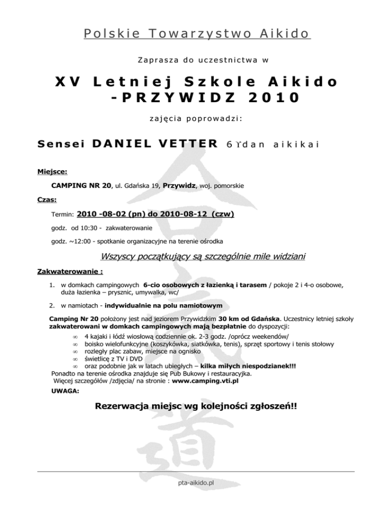Polskie Towarzystwo Aikido Zaprasza do uczestnictwa w XV Letniej Szkole Aikido -PRZYWIDZ 2010 zajęcia poprowadzi: Sensei DANIEL VETTER 6 ° d a n a i k i k a i Miejsce: CAMPING NR 20, ul. Gdańska 19, Przywidz, woj. pomorskie Czas: Termin: 2010 -08-02 (pn) do 2010-08-12 (czw) godz. od 10:30 - zakwaterowanie godz. ~12:00 - spotkanie organizacyjne na terenie ośrodka Wszyscy początkujący są szczególnie mile widziani Zakwaterowanie : 1. w domkach campingowych 6-cio osobowych z łazienką i tarasem / pokoje 2 i 4-o osobowe, duża łazienka – prysznic, umywalka, wc/ 2. w namiotach - indywidualnie na polu namiotowym Camping Nr 20 położony jest nad jeziorem Przywidzkim 30 km od Gdańska. Uczestnicy letniej szkoły zakwaterowani w domkach campingowych mają bezpłatnie do dyspozycji: • 4 kajaki i łódź wiosłową codziennie ok. 2-3 godz. /oprócz weekendów/ • boisko wielofunkcyjne (koszykówka, siatkówka, tenis), sprzęt sportowy i tenis stołowy • rozległy plac zabaw, miejsce na ognisko • świetlicę z TV i DVD • oraz podobnie jak w latach ubiegłych – kilka miłych niespodzianek!!! Ponadto na terenie ośrodka znajduje się Pub Bukowy i restauracyjka. Więcej szczegółów /zdjęcia/ na stronie : www.camping.vti.pl UWAGA: Rezerwacja miejsc wg kolejności zgłoszeń!! pta-aikido.pl Polskie Towarzystwo Aikido Koszty: - dla osób zakwaterowanych w domkach 6-cio osobowych – 900 zł - dla osób dojeżdżających, dochodzących lub zakwaterowanych indywidualnie w namiotach / bez wyżywienia/ – 300 zł - trening – 40 zł/dzień UWAGA: Opłata za pole namiotowe wg cennika ośrodka. Istnieje możliwość wykupienia całodziennego wyżywienia Zniżki: - dzieci do 7 lat domki 6-cio osobowe – 770 zł - dzieci od 7 /szkoła podstawowa/ domki 6-cio osobowe – 830 zł Dla osób nie uczestniczących w treningach /rodziny uczestników letniej szkoły / obowiązują poniższe stawki /nocleg + całodzienne wyżywienie/: - dla osób zakwaterowanych w domkach 6-cio osobowych – 650 zł - dla dzieci do 7 lat zakwaterowanych w domkach 6-cio osobowych – 520 zł - dla dzieci od 7 do 13 lat zakwaterowanych w domkach 6-cio osobowych – 580 zł Treningi: Przewidywane są 2-3 treningi dziennie w tym zajęcia z bronią (Jo, Bokken,Tanto): Sensei Daniel Vetter będzie prowadził zajęcia od 2 do 8 sierpnia, w pozostałe dni zajęcia poprowadzą instruktorzy PTA. Godziny zajęć zostaną podane po przyjeździe na spotkaniu organizacyjnym. Treningi odbywać się będą na sali gimnastycznej Gimnazjum w Przywidzu ok. 200 m od ośrodka (do dyspozycji: sala gimnastyczna, przebieralnia i wc) Uwagi: - Osoby uczestniczące w szkole zobowiązane są do indywidualnego ubezpieczenia się od NNW - W szkole mogą brać udział osoby pełnoletnie - Osoby niepełnoletnie mogą brać udział pod warunkiem zapewnienia im pełnoprawnej całodobowej opieki (towarzystwo rodziców, pełnoletniego rodzeństwa, opiekuna prawnego itp.) - Obóz zakończy się sesją egzaminacyjną na stopnie kyu − Zaliczki w wysokości: 350 zł (zakwaterowanie w Ośrodku) lub 200 zł (jeśli poza) należy wpłacić do 2010-05-25 na konto PTA: Lukas Bank: 63 1940 1076 3082 8520 0000 0000 W razie rezygnacji zaliczka nie podlega zwrotowi ! Kontakt w sprawach organizacyjnych i zgłoszenia: Andrzej Pruski [email protected] tel: 602439116 pta-aikido.pl