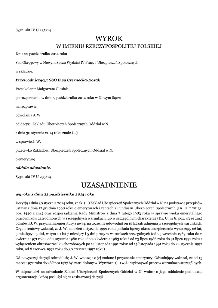 Sygn. akt IV U 235/14 WYROK W IMIENIU RZECZYPOSPOLITEJ POLSKIEJ Dnia 22 października 2014 roku Sąd Okręgowy w Nowym Sączu Wydział IV Pracy i Ubezpieczeń Społecznych w składzie: Przewodniczący: SSO Ewa Czernecka-Kozak Protokolant: Małgorzata Olesiak po rozpoznaniu w dniu 9 października 2014 roku w Nowym Sączu na rozprawie odwołania J. W. od decyzji Zakładu Ubezpieczeń Społecznych Oddział w N. z dnia 30 stycznia 2014 roku znak: (...) w sprawie J. W. przeciwko Zakładowi Ubezpieczeń Społecznych Oddział w N. o emeryturę oddala odwołanie. Sygn. akt IV U 235/14 UZASADNIENIE wyroku z dnia 22 października 2014 roku Decyzją z dnia 30 stycznia 2014 roku, znak: (...) Zakład Ubezpieczeń Społecznych Oddział w N. na podstawie przepisów ustawy z dnia 17 grudnia 1998 roku o emeryturach i rentach z Funduszu Ubezpieczeń Społecznych (Dz. U. z 2013r. poz. 1440 z zm.) oraz rozporządzenia Rady Ministrów z dnia 7 lutego 1983 roku w sprawie wieku emerytalnego pracowników zatrudnionych w szczególnych warunkach lub w szczególnym charakterze (Dz. U. nr 8, poz. 43 ze zm.) odmówił J. W. przyznania emerytury z uwagi na to, że nie udowodnił on 15 lat zatrudnienia w szczególnych warunkach. Organ rentowy wskazał, że J. W. na dzień 1 stycznia 1999 roku posiada łączny okres ubezpieczenia wynoszący 26 lat, 5 miesięcy i 5 dni, w tym 10 lat 7 miesięcy i 5 dni pracy w warunkach szczególnych (od 25 września 1969 roku do 2 kwietnia 1971 roku, od 2 stycznia 1980 roku do 20 kwietnia 1983 roku i od 23 lipca 1986 roku do 31 lipca 1992 roku z wyłączeniem okresów zasiłku chorobowych po 14 listopada 1991 roku: od 15 listopada 1991 roku do 24 stycznia 1992 roku, od 8 czerwca 1992 roku do 30 czerwca 1992 roku). Od powyższej decyzji odwołał się J. W. wnosząc o jej zmianę i przyznanie emerytury. Odwołujący wskazał, że od 15 marca 1972 roku do 28 lipca 1977 był zatrudniony w Wytwórni (...) w J. i wykonywał pracę w warunkach szczególnych. W odpowiedzi na odwołanie Zakład Ubezpieczeń Społecznych Oddział w N. wniósł o jego oddalenie podnosząc argumentację, którą posłużył się w zaskarżonej decyzji. Bezspornym w niniejszej sprawie było, że odwołujący się J. W., ur. (...), na dzień 1 stycznia 1999 roku udowodnił okres składkowy i nieskładkowy wynoszący 26 lat, 5 miesięcy i 5 dni, w tym 10 lat 7 miesięcy i 5 dni pracy w warunkach szczególnych (od 25 września 1969 roku do 2 kwietnia 1971 roku, od 2 stycznia 1980 roku do 20 kwietnia 1983 roku i od 23 lipca 1986 roku do 31 lipca 1992 roku z wyłączeniem okresów zasiłku chorobowych po 14 listopada 1991 roku). Odwołujący jest członkiem otwartego funduszu emerytalnego i złożył wniosek o przekazanie środków zgromadzonych na rachunku w otwartym funduszu emerytalnym za pośrednictwem ZUS na dochody budżetu państwa. J. W. złożył wniosek o przyznanie emerytury dnia 16 stycznia 2014 roku. Sąd ustalił następujący stan faktyczny: J. W. od 15 marca 1972 roku do 28 lipca 1977 roku był zatrudniony na podstawie umowy o pracę w pełnym wymiarze czasu pracy w Wytwórni (...) w J. na stanowisku formierza płyt. Płyty cementowo – wiórowe były wykorzystywane w budownictwie i służyły do ocieplania budynków. Do produkcji płyt używano cementu, wełny drzewnej, wody i chloru. Wełna drzewna (wióra drzewne) polewana była wodą z chlorem, następnie umieszczano ją w betoniarce i dodawano cement. Po wymieszaniu wylewano masę do formy i przenoszono do prasy. Pod prasą mieściło się dziewięć płyt ważących po ok. 50 kg, cześć z nich przenoszona była w rękach a ostatnie kilka płyt na głowie. Po uformowaniu, płyty były przewożone na wózkach do suszarni a po wyschnięciu przewożono je wózkami na plac. Na placu gotowe płyty ręcznie ładowano na samochód ciężarowy marki S., który przewoził je na bocznicę kolejową, tam ręcznie przeładowywano płyty z samochodu na wagony. Prace załadunkowe wykonywane były zazwyczaj co 2-3 dni i zajmowały około 5-6 godzin. Odwołujący wykonywał wszystkie wymienione wyżej czynności związane z produkcją i załadunkiem płyt wiórowo-cementowych. Pracownicy - ze względu na trudne warunki pracy - w ciągu dnia zmieniali się przy wykonywaniu poszczególnych czynności, np. kilka godzin pracowali przy betoniarce a następnie przechodzili do pracy przy prasie lub w suszarni albo do prac załadunkowych. Pracownicy produkcyjni kierowani byli również do rozładunku wagonów z cementem. Przy produkcji płyt panował duży hałas związany z pracą betoniarek, zapylenie w związku z wykorzystywaniem cementu i wełny drzewnej. Ze względu na używanie chloru do produkcji, prace wykonywane były w gumowych fartuchach i przy użyciu gumowych rękawic. Pracownicy otrzymywali mleko. Wszystkie czynności przy wytwarzaniu płyt wykonywane były ręcznie. Odwołujący nie pracował przy produkcji cementu i wełny drzewnej – składniki te były wytwarzane wcześniej i dostarczano je bezpośrednio do hali produkcyjnej. Wspólnie z odwołującym pracowali m.in. N. M. (w latach 1972-1979) przy obsłudze wełniarki i W. C. (1967-1964) na stanowisku formierza płyt. dowód: świadectwo pracy k. 4 akt ZUS, zeznania świadków zawarte w protokole rozprawy z 22.08.2014r.: W. C. od 03:36 min do 13:35 min i N. M. od 13:58 min do 21:55 min, oraz zeznania odwołującego zawarte w protokole rozprawy z 09.10.2014r. od 04:24 min do 20:20 min. Powyższy stan faktyczny Sąd ustalił na podstawie dokumentacji zgromadzonej w aktach sprawy, której wiarygodności i mocy dowodowej żadna ze stron nie kwestionowała w toku postępowania. Sąd oparł się również na zeznaniach odwołującego się oraz świadków: N. M. oraz W. C. uznając je za wiarygodne, spójne, logiczne i zgodne z pozostałym materiałem zgromadzonym w sprawie. Świadkowie pracowali wspólnie z odwołującym się i szczegółowo wskazali na czym polegał charakter jego pracy. Ich zeznania kore