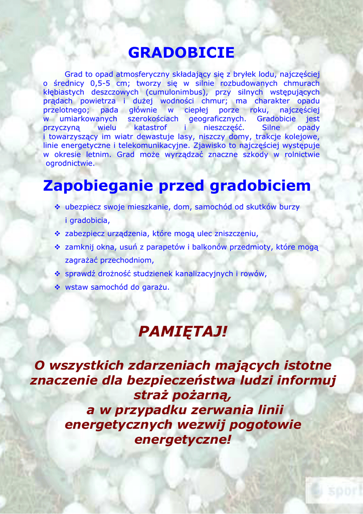GRADOBICIE Grad to opad atmosferyczny składający się z bryłek lodu, najczęściej o średnicy 0,5-5 cm; tworzy się w silnie rozbudowanych chmurach kłębiastych deszczowych (cumulonimbus), przy silnych wstępujących prądach powietrza i dużej wodności chmur; ma charakter opadu przelotnego; pada głównie w ciepłej porze roku, najczęściej w umiarkowanych szerokościach geograficznych. Gradobicie jest przyczyną wielu katastrof i nieszczęść. Silne opady i towarzyszący im wiatr dewastuje lasy, niszczy domy, trakcje kolejowe, linie energetyczne i telekomunikacyjne. Zjawisko to najczęściej występuje w okresie letnim. Grad może wyrządzać znaczne szkody w rolnictwie ogrodnictwie. Zapobieganie przed gradobiciem ubezpiecz swoje mieszkanie, dom, samochód od skutków burzy i gradobicia, zabezpiecz urządzenia, które mogą ulec zniszczeniu, zamknij okna, usuń z parapetów i balkonów przedmioty, które mogą zagrażać przechodniom, sprawdź drożność studzienek kanalizacyjnych i rowów, wstaw samochód do garażu. PAMIĘTAJ! O wszystkich zdarzeniach mających istotne znaczenie dla bezpieczeństwa ludzi informuj straż pożarną, a w przypadku zerwania linii energetycznych wezwij pogotowie energetyczne!