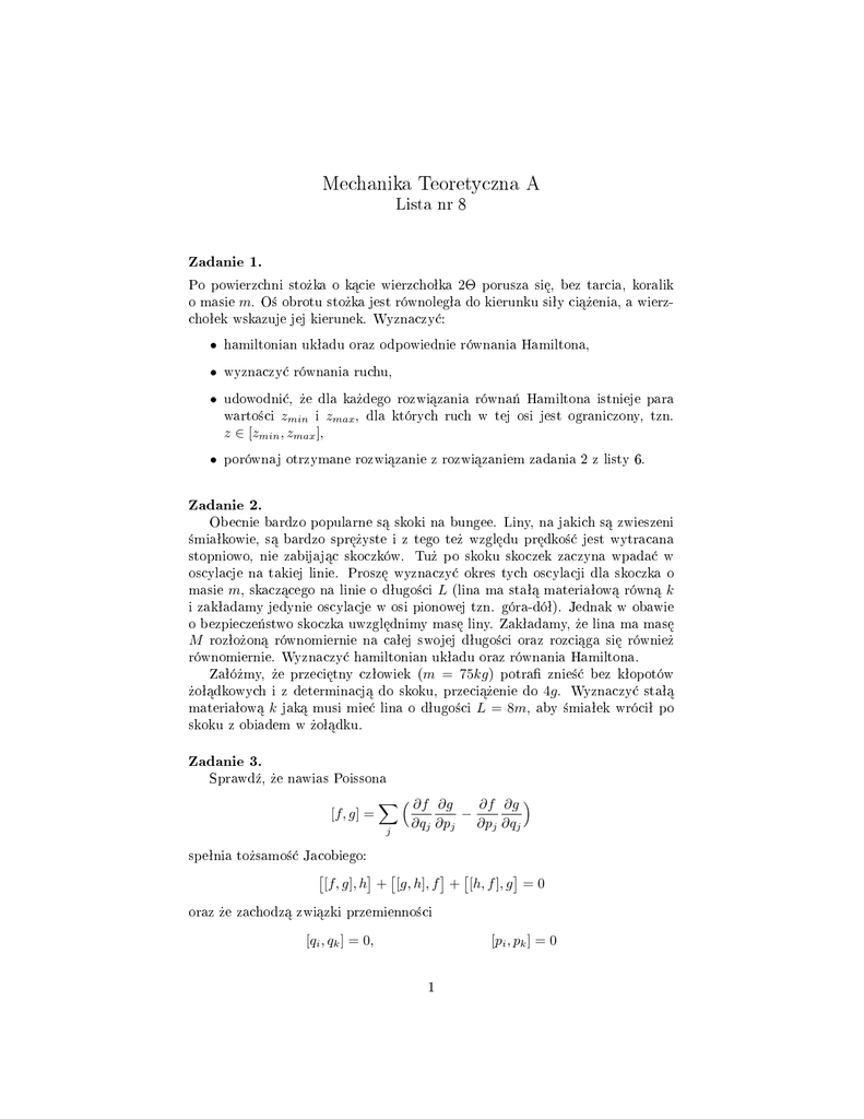 Mechanika Teoretyczna A Lista nr 8 Zadanie 1. Po powierzchni sto»ka o k¡cie wierzchoªka 2Θ porusza si¦, bez tarcia, koralik o masie m. O± obrotu sto»ka jest równolegªa do kierunku siªy ci¡»enia, a wierzchoªek wskazuje jej kierunek. Wyznaczy¢: • hamiltonian ukªadu oraz odpowiednie równania Hamiltona, • wyznaczy¢ równania ruchu, • udowodni¢, »e dla ka»dego rozwi¡zania równa« Hamiltona istnieje para warto±ci zmin i zmax , dla których ruch w tej osi jest ograniczony, tzn. z ∈ [zmin , zmax ], • porównaj otrzymane rozwi¡zanie z rozwi¡zaniem zadania 2 z listy 6. Zadanie 2. Obecnie bardzo popularne s¡ skoki na bungee. Liny, na jakich s¡ zwieszeni ±miaªkowie, s¡ bardzo spr¦»yste i z tego te» wzgl¦du pr¦dko±¢ jest wytracana stopniowo, nie zabijaj¡c skoczków. Tu» po skoku skoczek zaczyna wpada¢ w oscylacje na takiej linie. Prosz¦ wyznaczy¢ okres tych oscylacji dla skoczka o masie m, skacz¡cego na linie o dªugo±ci L (lina ma staª¡ materiaªow¡ równ¡ k i zakªadamy jedynie oscylacje w osi pionowej tzn. góra-dóª). Jednak w obawie o bezpiecze«stwo skoczka uwzgl¦dnimy mas¦ liny. Zakªadamy, »e lina ma mas¦ M rozªo»on¡ równomiernie na caªej swojej dªugo±ci oraz rozci¡ga si¦ równie» równomiernie. Wyznaczy¢ hamiltonian ukªadu oraz równania Hamiltona. Zaªó»my, »e przeci¦tny czªowiek (m = 75kg ) potra znie±¢ bez kªopotów »oª¡dkowych i z determinacj¡ do skoku, przeci¡»enie do 4g . Wyznaczy¢ staª¡ materiaªow¡ k jak¡ musi mie¢ lina o dªugo±ci L = 8m, aby ±miaªek wróciª po skoku z obiadem w »oª¡dku. Zadanie 3. Sprawd¹, »e nawias Poissona [f, g] = X ∂f ∂g ∂f ∂g − ∂qj ∂pj ∂pj ∂qj j speªnia to»samo±¢ Jacobiego: [f, g], h + [g, h], f + [h, f ], g = 0 oraz »e zachodz¡ zwi¡zki przemienno±ci [qi , qk ] = 0, [pi , pk ] = 0 1 i podstawowe nawiasy Poissona (NP): [qi , pk ] = δik . Udowodnij, »e przeksztaªcenie Qi = ln(1 + √ q i cos pi ), Pk = 2(1 + √ √ q k cos pk ) q k sin pk jest kanoniczne, tzn. »e Qi , Pk speªniaj¡ podstawowe NP. Zadanie 4. Przeksztaªcenie zmiennych q i p dane jest wzorami Q= p 1 + qκ , P =p p 1 + q −λ . Dla jakich warto±ci parametrów κ > 0, λ > 0 jest ono przeksztaªceniem kanonicznym? Zadanie 5. Czy przeksztaªcenie o funkcji tworz¡cej F (q, P, t) = qP − P 2t 2m jest przeksztaªceniem kanonicznym hamiltonianu H = p2 /2m − V (q)? Zadanie 6. Rozwa»my ukªad z jednym stopniem swobody, hamiltonianem H = H(p, q) oraz now¡ par¡ zmiennych P, Q zwi¡zanych ze starymi w nast¦puj¡cy sposób: √ q= √ 2P sin Q p= 2P cos Q 1. udowodnij, »e je»eli ∂H/∂q = −ṗ i ∂H/∂p = q̇ , to wynika st¡d ∂H/∂Q = −Ṗ i ∂H/∂P = Q̇. Co z tego wynika? 2. udowodnij, »e hamiltonian jednowymiarowego oscylatora z mas¡ m = 1 i staªa k = 1 wynosi H = 12 (p2 + q 2 ) 3. udowodnij, »e je»eli przepiszemy hamiltonian za pomoc¡ nowych zmiennych P, Q, to wtedy Q mo»emy pomin¡¢ w dalszych rozwa»aniach. Co to wtedy b¦dzie P ? 4. rozwi¡» równanie hamiltona dla Q(t) i sprawd¹, »e rozpisane przy pomocy q daje spodziewane zachowanie. 2