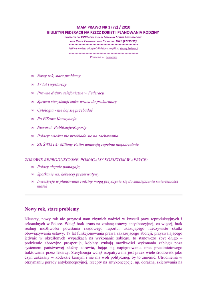MAM PRAWO NR 1 (72) / 2010 BIULETYN FEDERACJI NA RZECZ KOBIET I PLANOWANIA RODZINY FEDERACJA OD 1990 ROKU POSIADA SPECJALNY STATUS KONSULTACYJNY PRZY RADZIE EKONOMICZNO – SPOŁECZNEJ ONZ (ECOSOC) ************************************************** Jeśli nie możesz odczytać Biuletynu, wejdź na stronę Federacji ************************************************** POLUB NAS NA FACEBOOKU • Nowy rok, stare problemy • 17 lat i wystarczy • Prawne dyżury telefoniczne w Federacji • Sprawa sterylizacji znów wraca do prokuratury • Cytologia - nie bój się przebadać • Po PiSowa Konstytucja • Nowości: Publikacje/Raporty • Polacy: wiedza nie przekłada się na zachowania • ZE ŚWIATA: Miliony Fatim umierają zupełnie niepotrzebnie ZDROWIE REPRODUKCYJNE. POMAGAMY KOBIETOM W AFRYCE: • Polacy chętnie pomagają • Spotkanie ws. kobiecej prezerwatywy • Inwestycje w planowanie rodziny mogą przyczynić się do zmniejszenia śmiertelności matek Nowy rok, stare problemy Niestety, nowy rok nie przynosi nam zbytnich nadziei w kwestii praw reprodukcyjnych i seksualnych w Polsce. Wciąż brak szans na zmianę ustawy antyaborcyjnej, co więcej, brak realnej możliwości powstania rządowego raportu, ukazującego rzeczywiste skutki obowiązywania ustawy. 17 lat funkcjonowania prawa zakazującego aborcji, przyzwalającego jedynie w określonych wypadkach na wykonanie zabiegu, to stanowczo zbyt długo – podziemie aborcyjne prosperuje, kobiety szukają możliwości wykonania zabiegu poza systemem państwowej służby zdrowia, bojąc się napiętnowania oraz przedmiotowego traktowania przez lekarzy. Sterylizacja wciąż rozpatrywana jest przez wiele środowisk jako czyn zakazany w kodeksie karnym i nie ma woli politycznej, by to zmienić. Utrudnienia w otrzymaniu porady antykoncepcyjnej, recepty na antykoncepcję, np. doraźną, skierowania na badania prenatalne nadal stanowią smutną rzeczywistość. Co więcej, nawet dostanie się na rutynową wizytę do lekarza ginekologa nie jest proste, co obrazują ostatnie wysiłki kobiet, umawiających się przed końcem 10. tygodnia ciąży, by uzyskać zaświadczenie niezbędne do uzyskania becikowego. Czas oczekiwania do lekarza może wydłużyć się do kilku tygodni. Jak podkreśliła Wanda Nowicka, komentując ten stan: „(…) wiele kobiet w 10. tygodniu nawet nie wie, że spodziewa się dziecka. Jeżeli wie, to z dostaniem się do lekarza ma kłopoty. To wszystko można było przewidzieć. Ale państwo postanowiło zaoszczędzić na ciężarnych kobietach. Ten przepis dyskryminuje kobiety i traktuje je protekcjonalnie. Państwo wmawia nam, że w ciąży nie dbamy o siebie, nie chodzimy do lekarza, więc państwo nas do tego zmusi." Federacja już w marcu 2009 roku wydała stanowisko, w którym zwracała uwagę, że przymus nie jest najlepszą i najbardziej skuteczną drogą do dbania o zdrowie swoje czy dziecka. Wskazanym rozwiązaniem byłyby kompleksowe i dostosowane do warunków naszej służby zdrowia kampanie edukacyjne, skierowane do kobiet w okresie prekoncepcyjnym oraz po zajściu w ciążę. Taka edukacja, a nie przymusowe badania, mogą przyczynić się do wyrobienia nawyku dbania o zdrowie swoje i dziecka. Niestety, ministerstwo nadal uważa, że wie lepiej… Z zadowoleniem z kolei można przyjąć fakt, że marszałek Sejmu zainteresował się projektem ustawy o in vitro, wypracowanym przez Społeczny Zespół ds. Przygotowania Obywatelskiego Projektu Ustawy ws. Zapłodnienia In Vitro. Jednak Marek Balicki, komentując ten fakt, podkreśla w rozmowie z polityką.pl, że „projekt został przekazany pod obrady tylko dlatego, że jako najbardziej liberalny i tak nie zostanie uchwalony. Więcej – prawdopodobnie zostanie odrzucony już w pierwszym czytaniu.” Oczywiście, nie wiadomo do końca, co zrobi Sejm, ale nie jest tajemnicą, że debata o in vitro nie leży w interesie PO, która nie chce podejmować trudnych i społecznie wrażliwych tematów tuż przed wyborami. Nie oznacza to, że należy porzucić starania i nacisk na osoby, które są odpowiedzialne za podejmowanie decyzji dotyczących życia kobiet. Obserwatorom z zewnątrz może wydawać się, że to działania nieprzynoszące wymiernych efektów, z góry skazane na niepowodzenie, jednak bez nich kwestia praw kobiet nie istniałaby w ogóle w języku polskiej polityki. Źródło: Gazeta Wyborcza, 27.01.2010; Krok do przodu, dwa do tyłu, polityka.pl, 21.01.2010 Czytaj także: Stanowisko Federacji w sprawie uzależnienia dostępności becikowego od przymusowego badania ginekologicznego, 30.03.2009 17 lat i wystarczy Dnia 7 stycznia 2010 roku Federacja na rzecz Kobiet i Planowania Rodziny, Grupa Filmowa „Entuzjastki”, Dni Sprawiedliwości Reprodukcyjnej, oraz Stowarzyszenie Same o Sobie zorganizowały wydarzenie: "17 lat i wystarczy!". Podczas imprezy zaprezentowano odbyła się projekcja filmów, podejmujących tematykę aborcji w Polsce i na świecie: film Grupy Filmowej Entuzjastki Podziemne Państwo Kobiet, film Federacji na rzecz Kobiet i Planowania Rodziny Bez przemilczeń oraz film Sarah Diehl Abortion Democracy:Poland/South Africa. Projekcji towarzyszył pokaz plakatów chorwackiej artystki Sanji Ivekowić "Dom Kobiet (Okulary)" oraz premierowy pokaz pracy Moniki Mamzety "Wybaczam Ci Polsko". Całość uwieńczyła debata z okazji 17. rocznicy uchwalenia ustawy antyaborcyjnej z udziałem publiczności, którą poprowadziła dr Bożena Umińska–Keff. Organizatorki, podczas konferencji prasowej towarzyszącej wydarzeniu, przedstawiły „Stanowisko w sprawie 17. rocznicy uchwalenia przez Sejm ustawy antyaborcyjnej”. Domagają się w nim: poinformowania opinii publicznej i polityków o rzeczywistych skutkach restrykcyjnego prawa dla zdrowia kobiet przez resort zdrowia, a także przedstawienia przez Ministra Sprawiedliwości informacji na temat naruszeń praw kobiet w wyniku ustawy oraz o międzynarodowych zobowiązaniach Polski w zakresie prze
