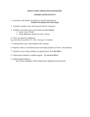 REGULAMIN SZKOLNEGO KONKURSU KOMIKS MITOLOGICZNY 1. Uczestnicy zobowiązani są dostarczyć komisji konkursowej komiks dowolnego mitu antycznego 2. Tematyka komiksu: mity starożytnych Greków i Rzymian 3. Technika wykonania prac- forma plastyczna do wyboru • karton (min. 85x60) • forma albumowa (kartki A4; min. 5 stron) 4. Praca powinna być podpisana (np. Karolina Kowalska kl. Ic; Mit o Tezeuszu i Ariadnie) 5. Wykonawstwo prac: indywidualnie lub w parach. 6. Nagrody: autorzy wyróżnionych prac otrzymają nagrody rzeczowe oraz dyplomy. 7. Terminarz: prace należy składać do organizatorów do 6. 06. 2014 r. 8. Zakończenie konkursu, rozdanie nagród – 13. czerwca 2014 r. 9. Organizatorki konkursu: - prof. Maria Jaśpińska, Dorota Żuchowska, Małgorzata Kowalewska.