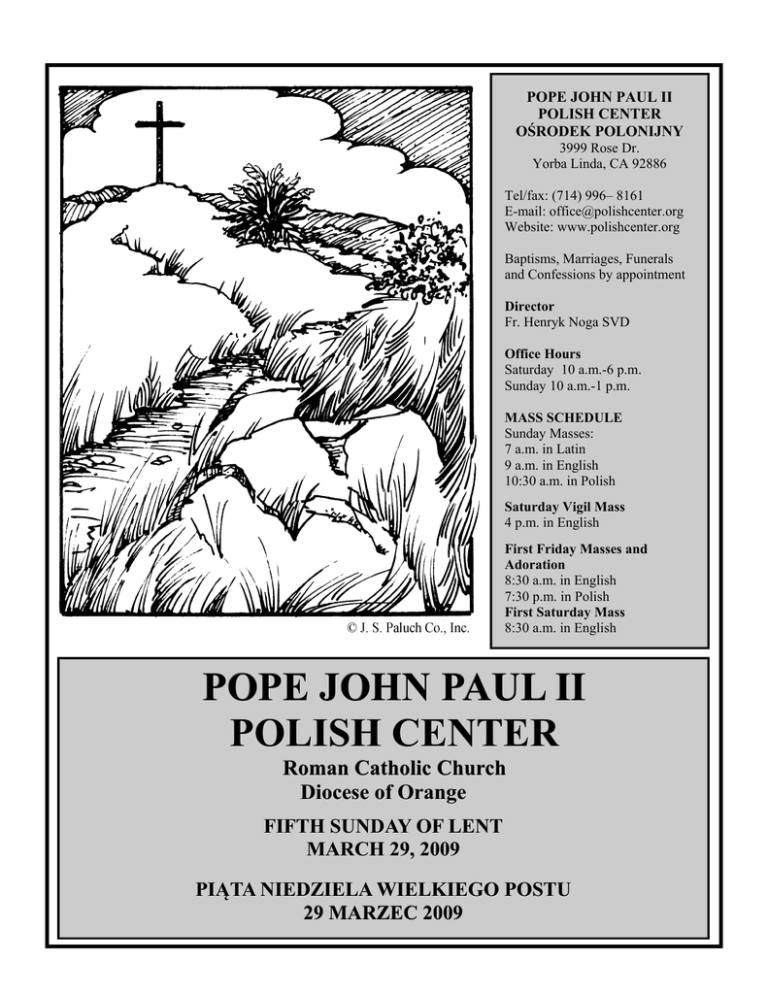 POPE JOHN PAUL II POLISH CENTER OŚRODEK POLONIJNY 3999 Rose Dr. Yorba Linda, CA 92886 Tel/fax: (714) 996– 8161 E-mail: [email protected] Website: www.polishcenter.org Baptisms, Marriages, Funerals and Confessions by appointment Director Fr. Henryk Noga SVD Office Hours Saturday 10 a.m.-6 p.m. Sunday 10 a.m.-1 p.m. MASS SCHEDULE Sunday Masses: 7 a.m. in Latin 9 a.m. in English 10:30 a.m. in Polish Saturday Vigil Mass 4 p.m. in English First Friday Masses and Adoration 8:30 a.m. in English 7:30 p.m. in Polish First Saturday Mass 8:30 a.m. in English POPE JOHN PAUL II POLISH CENTER Roman Catholic Church Diocese of Orange FIFTH SUNDAY OF LENT MARCH 29, 2009 PI PIĄ ĄTA NIEDZIELA WIELKIEGO POSTU 29 MARZEC 2009 Page 2 www.polishcenter.org FIFTH SUNDAY OF LENT MARCH 29, 2009 I will place my law within them and write it upon their hearts; I will be their God, and they shall be my people. Sat 3/28 Sun 3/29 Jeremiah 31:33 SAVED BY GOD’S LOVE Because the people broke the old covenant, God promised a new covenant, not in the blood of oxen and other animals, but in the blood of the Son, Jesus Christ. This new covenant, foreseen from afar by Jeremiah and the prophets, was not to be engraved on stone, or written on paper, but carved on our hearts, so that we might know God intimately. Not by keeping many laws are we to be saved, but by the love of God, living and real in our hearts through the sacrifice of Christ. Our Eucharist is the pledge of that indwelling of Christ, and of our response of praise and thanksgiving to God for the mercy, love, and kindness to us in forgiving our sins and cleansing our hearts of everything evil. God issues this invitation to intimacy by offering us the chance to have our sufferings transformed into the perfect love of the Savior, who first loved us. © Copyright, J. S. Paluch Co. Fri 4/3 Sat 4/4 Sun 4/5 Thu 4/9 Fri 4/10 Sat 4/11 Sun 4/12 4:00pm +Manny Herrera from Rick & Patty Kobzi 9:00am +Dolores Hawkins from Dick & Carrie Swan 10:30am Msza Dziekczynna o zdrowie I Boze blogo slawienstwo w dniu urodzin dla Kazimierza od Przyjaciol 8:30am +Frank Liggett from Polly Liggett 7:30pm 80 rocznica urodzin Jana z podziekowaniem za laski I z prosba o Boza opieke na dalsze lata 8:30am +Richard Morrison 4:00pm +Manny Herrera from KofC 9599 9:00am +Micheline Ruscitto from Sue & Jackie Pierette 10:30am +Mike Wyszomirski od Zony Teresy 7:30pm HOLY THURSDAY- MASS OF THE LORD'S SUPPER (ENG/POL) 3:00pm GOOD FRIDAY LITURGY (ENG) 7:30PM GOOD FRIDAY LITURGY (POL) 7:30pm EASTER VIGIL MASS (ENG) 7:00am RESURRECTION MASS (POL) Za Rodzine Ciecek 9:00am EASTER MASS (ENG) 10:30AM EASTER MASS (POL) STATIONS OF THE CROSS EVERY FRIDAY OF LENT Every Friday during Lent we will have Stations of the Cross at 7 pm. with a light soup and bread meal afterward. READINGS FOR THE WEEK Dn 13:1-9, 15-17, 19-30, 33-62 [41c-62]; Jn 8:1-11 Tuesday: Nm 21:4-9; Jn 8:21-30 Wednesday: Dn 3:14-20, 91-92, 95; Jn 8:31-42 Thursday: Gn 17:3-9; Jn 8:51-59 Friday: Jer 20:10-13; Jn 10:31-42 Saturday: Ez 37:21-28; Jn 11:45-56 Sunday: Mk 11:1-10 or Jn 12:12-16 (procession); Is 50:4-7; Ps 22; Phil 2:6-11; Mk 14:1 — 15:47 [15:1-39] Monday: TODAY’S READINGS First Reading — I will make a new covenant; I will write my law upon their hearts (Jeremiah 31:31-34) or Ezekiel 37:12-14. Psalm — Create a clean heart in me, O God (Psalm 51) or Psalm 130. Second Reading — Christ learned obedience and became the source of eternal salvation (Hebrews 5:7-9) or Romans 8:8-11. Gospel — If a grain of wheat falls to the ground and dies, it produces much fruit (John 12:20-33) or John 11:1-45 [3-7, 17, 20-27, 33b-45]. SAINTS AND SPECIAL OBSERVANCES Sunday: Fifth Sunday of Lent; Third Scrutiny Thursday: St. Francis of Paola Friday: First Friday; Abstinence Saturday: St. Isidore; First Saturday LOVE AND DEATH Unhappy is death without the love of the Savior; unhappy is love without the death of the Savior. —St. Francis de Sales Page 3 www.polishcenter.org KOMENTARZ LITURGICZNY Cykl B, 5 Niedziela Postu Czytania: Jr. 31:31-34; Hbr. 5:7-9; J. 12:20-33 Gdy zostanę nad ziemię wywyższony, przyciągnę wszystko do siebie… Jeżeli ziarno pszenicy wpadłwszy ziemię nie obumrze, zostanie tylko ziarno, ale jeżeli obumrze, przynosi plon obfity… Paradoks ziarna pszenicy obumierający, by dać nowe życie – upodabnia się do życiodajnego umierania uczniów Jezusa. Ziarna pszeniczne – od św. Szczepana pierwszego męczennika, do dzisiejszych czasów – św. Maksymiliana Kolbe, które wpadły w ziemię i obumarły, nigdy nie zawiodły, lecz przyniosły plon obfity – nowe życie wspólnocie chrześcijańskiej. Prawdopodobnie od nikogo z nas Bóg nie oczekuje spektakularnego męczeństwa i nie wymaga, byśmy kładli swe życie na linii w obronie wiary i nauki Chrystusowej. Dla większości z nas wyzwanie ziarna pszenicy sprowadza się do codziennych małych obumierań, które z kolei owocują nowymi obfitymi plonami odrodzenia. Umieramy dla chciwości, by nasza szczodrość mogła żyć. Umieramy dla złości i zemsty, aby nasze przebaczenie mogło żyć. Umieramy dla samolubstwa i osobistych ambicji tak, by wspólne dobro naszej społeczności mogło się rozwijać. Aby być ziarnem pszenicy potrzeba prawdziwej wiary i praktyki w dobrych uczynkach. Lecz gdy raz się na to zdecydujemy – i wpadniemy w ziemię – doświadczamy, nie opisanego w słowach, smaku zmartwychwstania i życia w Chrystusie. Nie zostaliśmy stworzeni, by szukać śmierci. Zachowanie życia ziemskiego jest naszym najsilniejszym, naturalnym instynktem. Zostaliśmy stworzeni do życia, do pełnego jego używania i do pomagania innym w tym celu. Naśladowanie Jezusa nie jest rzewnym bytowaniem, w oczekiwaniu na śmierć, lecz radosną ziemską podróżą do bardziej pełniejszego życia z Nim w wieczności. Naśladowcy Jezusa, idąc za Nim nie potrzebują szukać specjalnych krzyżów do niesienia. Takie okazje stoją na ich drodze każdego dnia w normalnych czy