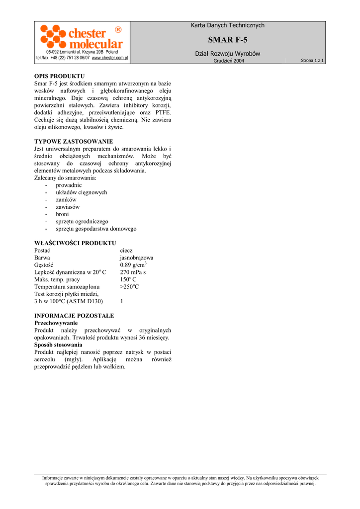 Karta Danych Technicznych SMAR F-5 05-092 Łomianki ul. Krzywa 20B Poland tel./fax. +48 (22) 751 28 06/07 www.chester.com.pl Dział Rozwoju Wyrobów Grudzień 2004 Strona 1 z 1 OPIS PRODUKTU Smar F-5 jest środkiem smarnym utworzonym na bazie wosków naftowych i głębokorafinowanego oleju mineralnego. Daje czasową ochronę antykorozyjną powierzchni stalowych. Zawiera inhibitory korozji, dodatki adhezyjne, przeciwutleniające oraz PTFE. Cechuje się dużą stabilnością chemiczną. Nie zawiera oleju silikonowego, kwasów i żywic. TYPOWE ZASTOSOWANIE Jest uniwersalnym preparatem do smarowania lekko i średnio obciążonych mechanizmów. Może być stosowany do czasowej ochrony antykorozyjnej elementów metalowych podczas składowania. Zalecany do smarowania: - prowadnic - układów cięgnowych - zamków - zawiasów - broni - sprzętu ogrodniczego - sprzętu gospodarstwa domowego WŁAŚCIWOŚCI PRODUKTU Postać Barwa Gęstość Lepkość dynamiczna w 20 o C Maks. temp. pracy Temperatura samozapłonu Test korozji płytki miedzi, 3 h w 100°C (ASTM D130) ciecz jasnobrązowa 0.89 g/cm3 270 mPa s 150o C >250oC 1 INFORMACJE POZOSTAŁE Przechowywanie Produkt należy przechowywać w oryginalnych opakowaniach. Trwałość produktu wynosi 36 miesięcy. Sposób stosowania Produkt najlepiej nanosić poprzez natrysk w postaci aerozolu (mgły). Aplikację można również przeprowadzić pędzlem lub wałkiem. Informacje zawarte w niniejszym dokumencie zostały opracowane w oparciu o aktualny stan naszej wiedzy. Na użytkowniku spoczywa obowiązek sprawdzenia przydatności wyrobu do określonego celu. Zawarte dane nie stanowią podstawy do przyjęcia przez nas odpowiedzialności prawnej.