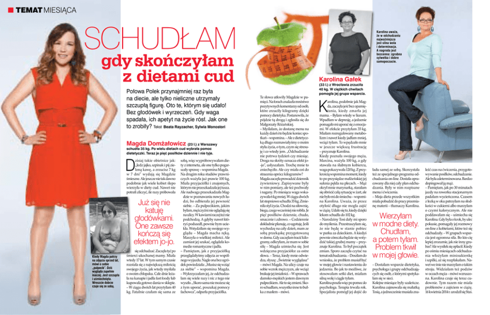 Temat MIESIĄCA Schudłam Karolina uważa, że w odchudzaniu najważniejsza jest silna wola i determinacja. A nagroda jest bezcenna: zgrabna sylwetka i dobre samopoczucie. gdy skończyłam z dietami cud Połowa Polek przynajmniej raz była na diecie, ale tylko nieliczne utrzymały szczupłą figurę. Oto te, którym się udało! Bez głodówek i wyrzeczeń. Gdy waga spadała, ich apetyt na życie rósł. Jak one to zrobiły? Tekst Beata Rayzacher, Sylwia Monostori Magda Domżałowicz (23 l.) z Warszawy schudła 35 kg. Po wielu dietach cud wybrała pomoc dietetyczki. Teraz je pięć posiłków dziennie i nie tyje. D zisiaj takie obietnice jak: „Jedz jajko, szpinak i pij zieloną kawę, a zrzucisz 7 kg w 7 dni” wydają się Magdzie śmieszne. Ale jeszcze nie tak dawno podobnie jak wiele kobiet ślepo wierzyła w diety cud. Nawet nie potrafi zliczyć, ile razy próbowała Już się nie katuję głodówkami. One zawsze kończą się efektem jo-jo. Kiedy Magda patrzy na zdjęcia sprzed lat, mówi o sobie „pulpecik”. Dziś wygląda zupełnie inaczej. Jest szczupła i uśmiechnięta. Wreszcie dobrze czuje się ze sobą. się odchudzać. Zaczęła tyć po śmierci ukochanej mamy. Miała wtedy 17 lat. W tym samym czasie rozstała się z największą miłością swojego życia, jak wtedy myślała o swoim chłopaku. Całe dnie leżała na kanapie i jadła fast foody lub kupowała gotowe dania w sklepie. – W ciągu dwóch lat przytyłam 40 kg. Fatalnie czułam się sama ze sobą, więc wypróbowywałam diety z internetu, ale one tylko pogarszały sprawę – wspomina Magda. Na drugim roku studiów prawniczych ważyła już prawie 100 kg. Miała przyjaciółki i znajomych, którym nie przeszkadzała jej tusza. Ale nadwaga przeszkadzała Magdzie w poznawaniu nowych ludzi, bo odbierała jej pewność siebie. – Za pulpecikiem, jakim byłam, mężczyźni nie oglądają się na ulicy. W kawiarni raczej też nie podchodzą. A gdyby nawet któryś podszedł, pewnie bym uciekła. Wstydziłam się swojego wyglądu – Magda macha ręką. Marzyła o wielkiej miłości. Ale zamiast jej szukać, oglądała komedie romantyczne i jadła. – Pamiętam, jak z przyjaciółką przeglądałyśmy zdjęcia ze wspólnego wyjazdu. Nagle ona bez ogródek powiedziała: „Musisz się wziąć za siebie” – wspomina Magda. – Wykrzyczałam jej, że odchudzałam się wiele razy i nic z tego nie wyszło. „Skoro sama nie możesz się z tym uporać, poszukaj pomocy fachowca”, odparła przyjaciółka. Karolina Gałek Te słowa utkwiły Magdzie w pamięci. Na forach znalazła mnóstwo pozytywnych komentarzy od osób, które zrzuciły kilogramy dzięki pomocy dietetyka. Postanowiła, że pójdzie tą drogą i zgłosiła się do Małgorzaty Różańskiej. – Myślałam, że dostanę menu na każdy dzień i to będzie koniec spotkań – wspomina. – Ale z dietetyczką długo rozmawiałyśmy o moim stylu życia, o tym, czym się stresuję i co wtedy jem. „Odchudzanie nie potrwa tydzień czy miesiąc. Droga na skróty oznacza efekt jo-jo”, usłyszałam. Trochę mnie to zniechęciło. Ale czy miała coś do stracenia oprócz kilogramów? Magda zaczęła prowadzić dziennik żywieniowy. Zapisywane były w nim pomiary, ale też pochwały i nagany. Po miesiącu waga wskazywała 6 kg mniej. W ciągu dwóch lat stopniowo schudła 35 kg. Zmieniła styl życia. Chodzi na siłownię, biega, czego wcześniej nie robiła. Je pięć posiłków dziennie, chudo, smacznie i zdrowo. – Codziennie dokładnie planuję, co ugotuję. Jeśli wychodzę na cały dzień, mam ze sobą przekąskę przygotowaną w domu. Gdy zaczęłam tracić kilogramy, odkryłam, że mam w sobie siłę – Magda uśmiecha się. Jest wdzięczna przyjaciółce za ostre słowa. – Teraz, kiedy mnie odwiedza, słyszę: „Świetnie wyglądasz” – mówi Magda. Na ulicy czuje na sobie wzrok mężczyzn, ale wciąż brakuje jej śmiałości. – W sprawach damsko-męskich jestem dawnym pulpecikiem. Ale to się zmieni. Skoro schudłam, wszystko inne to bułka z masłem – mówi. (33 l.) z Wrocławia zrzuciła 40 kg. W ciężkich chwilach pomogła jej grupa wsparcia. K arolina, podobnie jak Magda, zaczęła jeść bez opamiętania, kiedy zmarła jej mama. – Byłam wtedy w liceum. Wpadłam w depresję, a jedzenie pomagało mi uporać się z emocjami. W efekcie przytyłam 35 kg. Miałam rozregulowany metabolizm i nawet kiedy jadłam mniej, wciąż tyłam. To wpędzało mnie w jeszcze większą frustrację – przyznaje Karolina. Kiedy poznała swojego męża, Marcina, ważyła 100 kg, a gdy stawała na ślubnym kobiercu, waga pokazywała 120 kg. Z przykrością wspomina moment, kiedy to po przysiędze małżeńskiej jej suknia pękła na plecach. – Mąż okrył mnie marynarką, starałam się obrócić całą sytuację w żart, ale nie było mi do śmiechu – wspomina Karolina. Uważa, że przez otyłość długo nie mogła zajść w ciążę. Udało się to, kiedy dzięki lekom schudła do 102 kg. – Narodziny Tosi dały mi sporo do myślenia. Przestraszyłam się, że nie będę w stanie pobiec w parku za dzieckiem. A kiedyś pewnie córeczka będzie się wstydzić takiej grubej mamy – przyznaje Karolina. To był początek zmian. Sporo zaczęła czytać na temat odchudzania. – Doszłam do wniosku, że problem musiał być w mojej głowie i nastawieniu do jedzenia. Bo jak to możliwe, że stosowałam setki diet, miałam silną wolę i ciągle tyłam. Karolina poszła więc po pomoc do psychologa. Terapia trwała rok. Specjalista pomógł jej dojść do ładu samej ze sobą. Skorzystała też ze specjalnego programu odchudzania on-line. Dostała opracowany dla niej cały plan odchudzania. Były w nim rozpisane menu i ćwiczenia. – Moja dieta przede wszystkim miała pobudzić do pracy przemianę materii – tłumaczy Karolina. Wierzyłam w modne diety. Chudłam, a potem tyłam. Problem tkwił w mojej głowie. – Dostałam wsparcie dietetyka, psy