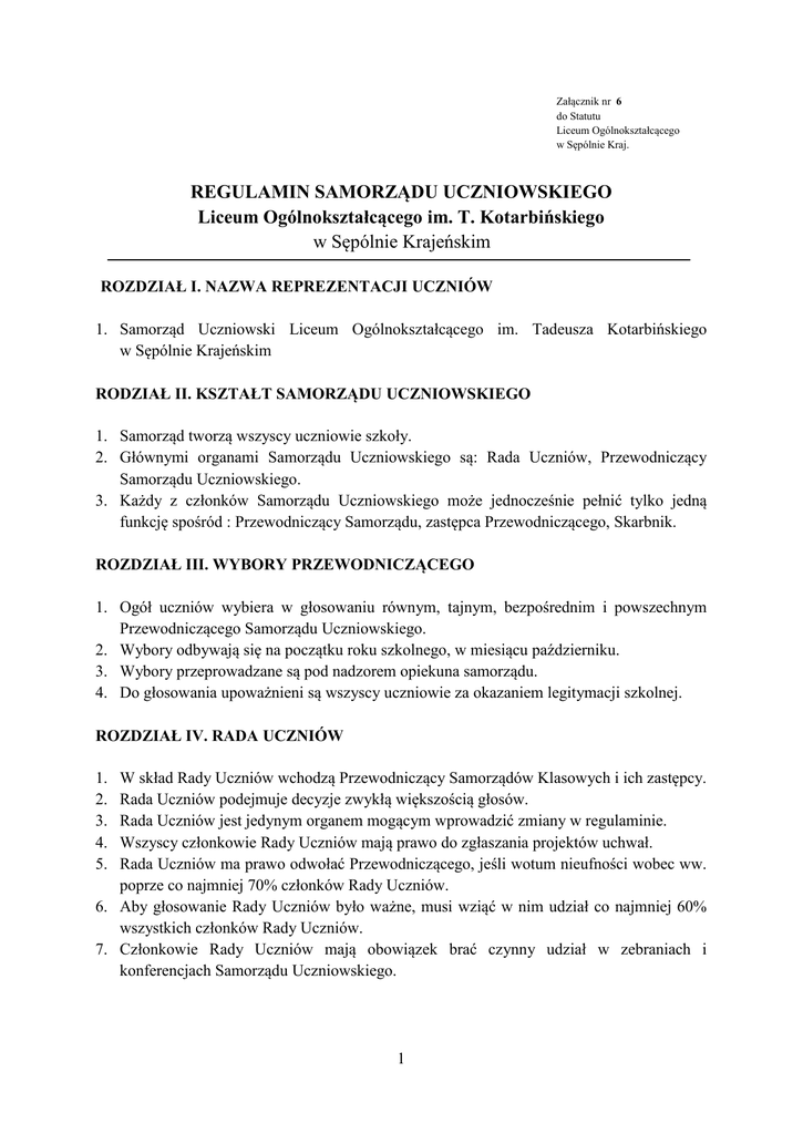 Załącznik nr 6 do Statutu Liceum Ogólnokształcącego w Sępólnie Kraj. REGULAMIN SAMORZĄDU UCZNIOWSKIEGO Liceum Ogólnokształcącego im. T. Kotarbińskiego w Sępólnie Krajeńskim ROZDZIAŁ I. NAZWA REPREZENTACJI UCZNIÓW 1. Samorząd Uczniowski Liceum Ogólnokształcącego im. Tadeusza Kotarbińskiego w Sępólnie Krajeńskim RODZIAŁ II. KSZTAŁT SAMORZĄDU UCZNIOWSKIEGO 1. Samorząd tworzą wszyscy uczniowie szkoły. 2. Głównymi organami Samorządu Uczniowskiego są: Rada Uczniów, Przewodniczący Samorządu Uczniowskiego. 3. Każdy z członków Samorządu Uczniowskiego może jednocześnie pełnić tylko jedną funkcję spośród : Przewodniczący Samorządu, zastępca Przewodniczącego, Skarbnik. ROZDZIAŁ III. WYBORY PRZEWODNICZĄCEGO 1. Ogół uczniów wybiera w głosowaniu równym, tajnym, bezpośrednim i powszechnym Przewodniczącego Samorządu Uczniowskiego. 2. Wybory odbywają się na początku roku szkolnego, w miesiącu październiku. 3. Wybory przeprowadzane są pod nadzorem opiekuna samorządu. 4. Do głosowania upoważnieni są wszyscy uczniowie za okazaniem legitymacji szkolnej. ROZDZIAŁ IV. RADA UCZNIÓW W skład Rady Uczniów wchodzą Przewodniczący Samorządów Klasowych i ich zastępcy. Rada Uczniów podejmuje decyzje zwykłą większością głosów. Rada Uczniów jest jedynym organem mogącym wprowadzić zmiany w regulaminie. Wszyscy członkowie Rady Uczniów mają prawo do zgłaszania projektów uchwał. Rada Uczniów ma prawo odwołać Przewodniczącego, jeśli wotum nieufności wobec ww. poprze co najmniej 70% członków Rady Uczniów. 6. Aby głosowanie Rady Uczniów było ważne, musi wziąć w nim udział co najmniej 60% wszystkich członków Rady Uczniów. 7. Członkowie Rady Uczniów mają obowiązek brać czynny udział w zebraniach i konferencjach Samorządu Uczniowskiego. 1. 2. 3. 4. 5. 1 ROZDZIAŁ V. PRZEWODNICZĄCY SAMORZĄDU UCZNIOWSKIEGO Przewodniczący jest głównym reprezentantem ogółu uczniów. Przewodniczący koordynuje działania Samorządu Uczniowskiego. Kadencja Przewodniczącego trwa rok. Przewodniczący z uzasadnionej przyczyny może podać się do dymisji przed zakończeniem kadencji. 5. W przypadku podania się do dymisji przez Przewodniczącego jego obowiązki sprawuje zastępca. 6. Zastępca może zostać odwołany przez Radę Uczniów, jeśli jego wniosek poprze minimum 70% członków Rady Uczniów. 1. 2. 3. 4. ROZDZIAŁ VI. SKARBNIK SAMORZĄDU UCZNIOWSKIEGO 1. Zadaniem Skarbnika jest dbanie o zasobność kasy Samorządu Uczniowskiego poprzez poszukiwanie sponsorów, a także kontrolowanie wydatków Samorządu. 2. Do wydawania dyspozycji Skarbnikowi upoważniony jest Przewodniczący Samorządu. 3. Skarbnik może odmówić wydania pieniędzy, chyba że zostało to wcześniej przegłosowane przez Radę Uczniów. 4. Skarbnik zobowiązany jest do 15 czerwca rozliczyć się z powierzonych mu funduszy przed Radą Uczniów. 5. W uzasadnionych wypadkach Skarbnik może podać się do dymisji. 6. Rada Uczniów ma prawo odwołać Skarbnika, jeśli wotum nieufności wobec ww. poprze co najmniej 70% członków Rady Uczniów. ROZDZIAŁ VII. ZEBRANIA SAMORZADU UCZNIOWSKIEGO 1. Zebrania Samorządu Uczniowskiego odbywają się raz w miesiącu. 2. W uzasadnionych przypadkach zebrania mogą być zwołane na przerwach. 3. Opiekun Samorządu w uzasadnionych wypadkach ma prawo na wniosek Przewodniczącego Samorządu i za zgodą Dyrektora Szkoły zwoływać zebrania w czasie zajęć lekcyjnych. 4. Rada Uczniów może ustanowić zebranie tajnym. ROZDZIAŁ VIII. OPIEKUN SAMORZĄDU UCZNIOWSKIEGO 1. Opiekun Samorządu jest głosem doradczym Samorządu Uczniowskiego. 2. Opiekun jest wybierany przez Radę Uczniów na końcu roku szkolnego. 3. Opiekun Samorządu jest jedyną osobą upoważnioną do zwalniania uczniów z lekcji w związku z działalnością Samorządu. 4. Opiekun w uzasadnionych przypadkach może podać się do dymisji. 8. Rada Uczniów ma prawo odwołać Opiekuna Samorządu, jeśli wotum nieufności wobec ww. poprze co najmniej 70% członków Rady Uczniów. 2