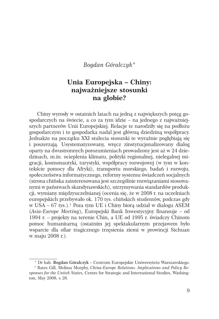 Bogdan Góralczyk* Unia Europejska – Chiny: najwa˝niejsze stosunki na globie? Chiny wyrosły w ostatnich latach na jednà z najwi´kszych pot´g gospodarczych na Êwiecie, a co za tym idzie – na jednego z najwa˝niejszych partnerów Unii Europejskiej. Relacje te narodziły si´ na podło˝u gospodarczym i to gospodarka nadal jest głównà dziedzinà współpracy. Jednak˝e na poczàtku XXI stulecia stosunki te wyraênie pogł´biajà si´ i poszerzajà. Usystematyzowany, wr´cz zinstytucjonalizowany dialog oparty na dwustronnych porozumieniach prowadzony jest a˝ w 24 dziedzinach, m.in. ocieplenia klimatu, polityki regionalnej, nielegalnej migracji, kosmonautyki, turystyki, współpracy rozwojowej (w tym w kontekÊcie pomocy dla Afryki), transportu morskiego, badaƒ i rozwoju, społeczeƒstwa informatycznego, reformy systemu Êwiadczeƒ socjalnych (strona chiƒska zainteresowana jest szczególnie rozwiàzaniami stosowanymi w paƒstwach skandynawskich), utrzymywania standardów produkcji, wymiany mi´dzyuczelnianej (ocenia si´, ˝e w 2008 r. na uczelniach europejskich przebywało ok. 170 tys. chiƒskich studentów, podczas gdy w USA – 67 tys.).1 Poza tym UE i Chiny biorà udział w dialogu ASEM (Asia-Europe Meeting), Europejski Bank Inwestycyjny finansuje – od 1994 r. – projekty na terenie Chin, a UE od 1995 r. Êwiadczy Chinom pomoc humanitarnà (ostatnim jej spektakularnym przejawem było wsparcie dla ofiar tragicznego trz´sienia ziemi w prowincji Sichuan w maju 2008 r.). * Dr hab. Bogdan Góralczyk – Centrum Europejskie Uniwersytetu Warszawskiego. 1 Bates Gill, Melissa Murphy, China-Europe Relations. Implications and Policy Responses for the Unitek States, Centre for Strategic and International Studies, Washington, May 2008, s. 28. 9 Studia Europejskie, 2/2009 Obydwie strony coraz cz´Êciej mówià o swych relacjach jako „rozwini´tych i strategicznych” (enduring strategic relationship)2. Waga wzajemnych stosunków dla obu stron roÊnie. UE od czasu Traktatu z Maastricht powi´kszyła si´ z 12 do 27 paƒstw i obejmuje niemal cały kontynent, podczas gdy Chiny, te˝ w istocie zajmujàce kontynent, w ostatnich trzech dekadach, po rozpocz´ciu w grudniu 1978 r. kursu reform i otwarcia na Êwiat (gaige, kaifang), odniosły najbardziej spektakularny sukces w całych swych długich dziejach, podnoszàc dochody paƒstwa niemal dziesi´ciokrotnie. Poniewa˝ chodzi o najludniejsze paƒstwo Êwiata, liczàce 1 350 mln mieszkaƒców, tamtejsze dynamiczne zmiany nie tylko musiały zostaç zauwa˝one, ale, co wi´cej, majà ju˝ bezpoÊredni wpływ na sprawy globalne, w tym kontekÊcie tak˝e na terenie UE. Szybko zmieniajàce si´ i rozwijajàce Chiny stały si´ bowiem w powszechnej opinii „najwi´kszà taÊmà monta˝owà Êwiata”, ekspansywnym eksporterem, a zarazem intratnym rynkiem.3 Ocenia si´, ˝e aktualnie stosunki bilateralne UE – Chiny „konsumujà” jednà trzecià ogółu obrotów handlowych w Êwiecie (nie wliczajàc w to obrotów wewnàtrzunijnych). Poniewa˝ obydwaj partnerzy nale˝à do grona najwa˝niejszych aktorów na scenie mi´dzynarodowej, ich stosunki dwustronne b´dà w du˝ej mierze okreÊlały najbli˝szà rzeczywistoÊç na arenie globalnej. Geneza i rozwój stosunków dwustronnych Po proklamowaniu 1 paêdziernika 1949 r., a szczególnie po wojnie koreaƒskiej (1950–1953), Chiƒska Republika Ludowa jako paƒstwo komunistyczne była przedmiotem swego rodzaju ostracyzmu ze strony naj2 Szerzej o historii stosunków UE – ChRL zob.: China – Europe Relations. Perceptions, Policies and Prospects, eds. David Shambaugh, Eberhard Sandschneider, Zhou Hong, Routledge, London 2007; Crossick Stanley, Reuter Etienne, China – EU: A Common Future”, World Scientific Publishing, London 2008; Liue Fei, Dawid Kerr, The International Politics of EU – China Relations, British Academy Occasional papers, London, November 2007; Xiudian Dai, Understanding EU-China Relations: An Uncertain Partnership in the Making, Research Paper 1/2006, Centre for European Studies, University of Hull. 3 Z bogatej literatury nt. chiƒskich sukcesów gospodarczych w ostatnich ponad trzech dekadach warto wskazaç na: Yasheng Huang, Capitalism with Chinese Carcteristics. Entrepreneurship and the State, Cambridge University Press 2008; Oded Shenkar, The Chinese Century. The Rising Chinese Economy and its Impact on the Global Economy, The Balance of Power, and Your Job, Wharton School Publishing, New York 2005; Will Hutton, The Writing on the Wall. China and the West in the 21-st Century, Little, Brown, New York 2006. 10 B. Góralczyk, UE – Chiny: najwa˝niejsze stosunki na globie? wa˝niejszych mocarstw zachodnich, w tym europejskich. Wielka Brytania podtrzymała, ze wzgl´du na swà specyficznà rol´ – Hongkong był jej kolonià – stosunki z Pekinem, ale w latach 50., 60., i 70. nie były one zbyt rozwini´te. Przełomu dokonała Francja Charles’a de Gaulle’a, która nawiàzała stosunki dyplomatyczne z ChRL w 1964 r. Od tej pory a˝ do dziÊ Francja pretenduje do roli europejskiego „pioniera” w relacjach z Chinami, pozostajàc otwartà na wymian´ i wyprzedzajàc w inicjatywach wielu innych europejskich partnerów. W Êlad za Francjà poszły inne du˝e paƒstwa europejskie. Włochy nawiàzały stosunki dyplomatyczne z ChRL w roku 1970, a w 1972 uczyniła to RFN. Zarówno zmieniajàca si´ atmosfera wokół Chin po „przełomie” dokonanym przez prezydenta USA Richarda Nixona, który w lutym 1972 r. zło˝ył przełomowà wizyt´ w Pekinie i Szanghaju, jak te˝ ogromny potencjał chiƒskiego rynku sprawiły, ˝e w 1975 r. stosunki dyplomatyczne z Paƒstwem Ârodka nawiàzały Wspólnoty Europejskie (porozumienie wynegocjował znany polityk brytyjski, ówczesny wiceszef Komisji Europejskiej sir Christopher Soames). Pierwszà umow´ handlowà obie strony podpisały w maju 1978 r. (podkreÊlmy raz jeszcze, ˝e w grudniu tego samego roku Chiny wkroczyły na Êci