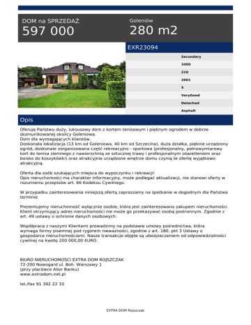 Goleniów DOM na SPRZEDAŻ 280 m2 597 000 EXR23094 Secondary 3400 210 2001 5 VeryGood Detached Asphalt Opis Oferuję Państwu duży, luksusowy dom z kortem tenisowym i pięknym ogrodem w dobrze skomunikowanej okolicy Goleniowa. Dom dla wymagających klientów. Doskonała lokalizacja (13 km od Goleniowa, 40 km od Szczecina), duża działka, pięknie urządzony ogród, doskonale zorganizowana część rekreacyjno - sportowa (profesjonalny, pełnowymiarowy kort do tenisa ziemnego z nawierzchnią ze sztucznej trawy i profesjonalnym oświetleniem oraz boisko do koszykówki) oraz atrakcyjnie urządzone wnętrze domu czynią te ofertę wyjątkowo atrakcyjną. Oferta dla osób szukających miejsca do wypoczynku i rekreacji! Opis nieruchomości ma charakter informacyjny, może podlegać aktualizacji, nie stanowi oferty w rozumieniu przepisów art. 66 Kodeksu Cywilnego. W przypadku zainteresowania niniejszą ofertą zapraszamy na spotkanie w dogodnym dla Państwa terminie Prezentujemy nieruchomość wyłącznie osobie, która jest zainteresowana zakupem nieruchomości. Klient otrzymujący adres nieruchomości nie może go przekazywać osobą postronnym. Zgodnie z art. 49 ustawy o ochronie danych osobowych. Współpracę z naszymi Klientami prowadzimy na podstawie umowy pośrednictwa, która wymaga formy pisemnej pod rygorem nieważności, zgodnie z art. 180, pkt 3 Ustawy o gospodarce nieruchomościami. Nasze transakcje objęte są ubezpieczeniem od odpowiedzialności cywilnej na kwotę 200 000,00 EURO. BIURO NIERUCHOMOŚCI EXTRA DOM ROJSZCZAK 72-200 Nowogard ul. Boh. Warszawy 1 (przy placówce Alior Banku) www.extradom.net.pl tel./fax 91 392 22 33 EXTRA DOM Rojszczak Co robimy dla klienta zainteresowanego zakupem: * Sprawdzamy zdolność kredytową * Wyszukujemy odpowiednią nieruchomość, * Pomagamy w prowadzeniu negocjacji, * Pomagamy w uzyskaniu potrzebnych dokumentów * Pomagamy w uzyskaniu kredytu hipotecznego * Współpracujemy z kancelariami notarialnymi, geodetami Korzystając z naszych usług oszczędzasz swój czas, a także zyskujesz pewność, że Twoja transakcja zostanie przeprowadzona z należytą starannością, w sposób profesjonalny i co najważniejsze - BEZPIECZNY. Nr licencji pośredników: 21317, 21318 Żaneta Rojszczak tel. 508 312 260 tel. (91) 392 22 33 email: [email protected] EXTRA DOM Rojszczak Powered by TCPDF (www.tcpdf.org)