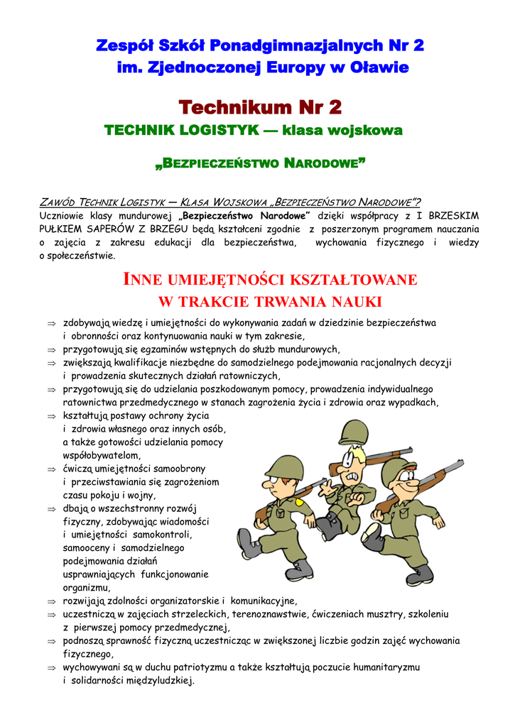 TECHNIK LOGISTYK Zespół Szkół Ponadgimnazjalnych Nr 2 im. Zjednoczonej Europy w Oławie Technikum Nr 2 TECHNIK LOGISTYK — klasa wojskowa „BEZPIECZEŃSTWO NARODOWE” ZAWÓD TECHNIK LOGISTYK — KLASA WOJSKOWA „BEZPIECZEŃSTWO NARODOWE”? Uczniowie klasy mundurowej „Bezpieczeństwo Narodowe” dzięki współpracy z I BRZESKIM PUŁKIEM SAPERÓW Z BRZEGU będą kształceni zgodnie z poszerzonym programem nauczania o zajęcia z zakresu edukacji dla bezpieczeństwa, wychowania fizycznego i wiedzy o społeczeństwie. INNE UMIEJĘTNOŚCI KSZTAŁTOWANE W TRAKCIE TRWANIA NAUKI zdobywają wiedzę i umiejętności do wykonywania zadań w dziedzinie bezpieczeństwa i obronności oraz kontynuowania nauki w tym zakresie, przygotowują się egzaminów wstępnych do służb mundurowych, zwiększają kwalifikacje niezbędne do samodzielnego podejmowania racjonalnych decyzji i prowadzenia skutecznych działań ratowniczych, przygotowują się do udzielania poszkodowanym pomocy, prowadzenia indywidualnego ratownictwa przedmedycznego w stanach zagrożenia życia i zdrowia oraz wypadkach, kształtują postawy ochrony życia i zdrowia własnego oraz innych osób, a także gotowości udzielania pomocy współobywatelom, ćwiczą umiejętności samoobrony i przeciwstawiania się zagrożeniom czasu pokoju i wojny, dbają o wszechstronny rozwój fizyczny, zdobywając wiadomości i umiejętności samokontroli, samooceny i samodzielnego podejmowania działań usprawniających funkcjonowanie organizmu, rozwijają zdolności organizatorskie i komunikacyjne, uczestniczą w zajęciach strzeleckich, terenoznawstwie, ćwiczeniach musztry, szkoleniu z pierwszej pomocy przedmedycznej, podnoszą sprawność fizyczną uczestnicząc w zwiększonej liczbie godzin zajęć wychowania fizycznego, wychowywani są w duchu patriotyzmu a także kształtują poczucie humanitaryzmu i solidarności międzyludzkiej. Technik logistyk zdobywa kwalifikacje do: zarządzania zapasami i przestrzenią magazynową oraz OTWARTOŚĆ PEWNOŚĆ SIEBIE środkami transportu wewnątrzzakładowego, organizowania łańcucha dostaw transportowych towarów wyprodukowanych przez zakłady, fabryki, zarządzania miejską infrastrukturą logistyczną (wywóz śmieci, odpadów), organizowania i realizowania usług poprzez dobieranie odpowiednich do zadania środków transportu, organizowania przewozu osób w komunikacji WYTRWAŁOŚĆ publicznej, AKTYWNOŚĆ opracowywania rozkładu komunikacji miejskiej, międzymiastowej i regionalnej posługiwania się nowoczesnymi sposobami organizacji i planowania Cechy WYOBRAŹNIA w transporcie w oparciu o Internet, programy dobrego komputerowe oraz marketing. dowódcy RZETELNOŚĆ LOJALNOŚĆ KOLEŻEŃSTWO GDZIE ZNAJDZIESZ PRACĘ? Nasi absolwenci są przygotowani do podjęcia służby/pracy: w Wojskach Lądowych, Siłach Powietrznych, Marynarce Wojennej, Wojskach Specjalnych, Żandarmerii Wojskowej, Służbie Kontrwywiadu Wojskowego, Służbie Wywiadu Wojskowego, Narodowych Siłach Rezerwowych, Biurze Ochrony Rządu. Posiadają przede wszystkim przygotowanie do pracy w wojskowych oddziałach logistycznych na różnych szczeblach dowodzenia jako: pracownik wsparcia logistycznego, również w misjach pokojowych i stabilizacyjnych. Zdobyte kwalifikacje upoważniają do podjęcia pracy w centrach zarządzania kryzysowego w urzędach administracji państwowej oraz cywilnych centrach logistycznych. Nasi absolwenci będą potrafili skutecznie działać w trudnych warunkach, zaistniałych na kanwie sytuacji wynikających z zagrożeń bezpieczeństwa państwa i obywateli a ponadto poprawnie realizować przedsięwzięcia logistyczne dla potrzeb bezpieczeństwa w różnych środowiskach społecznych.