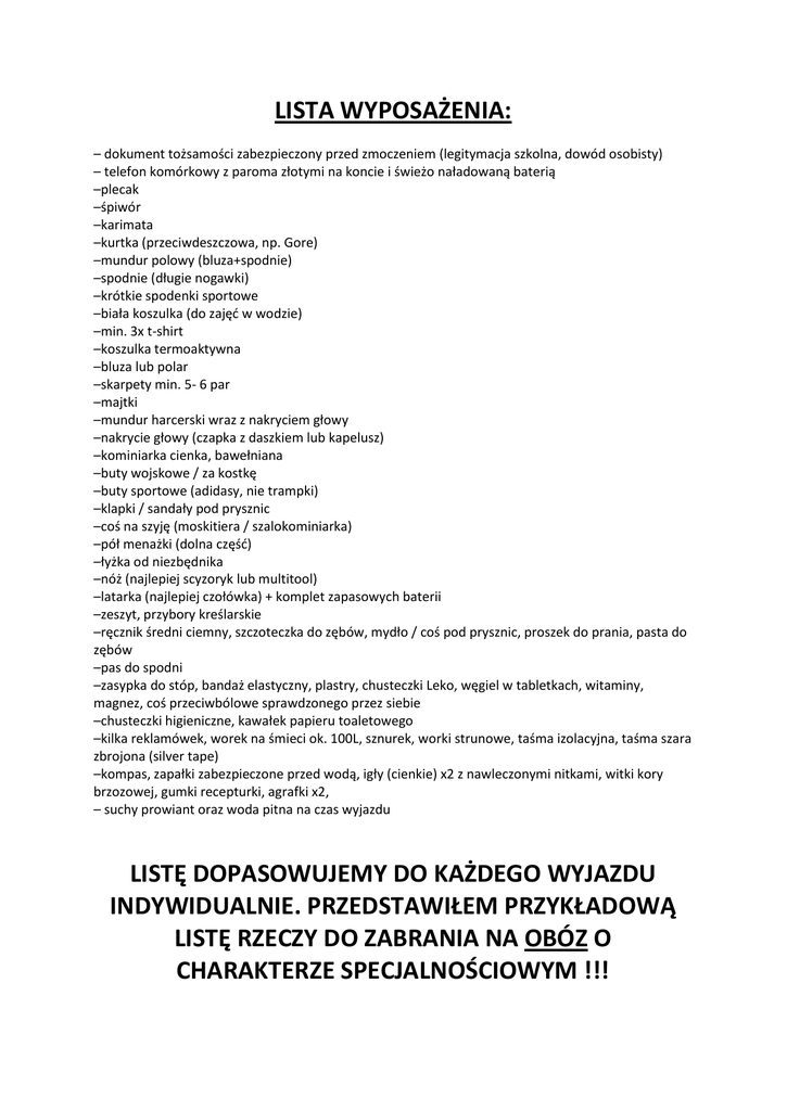 LISTA WYPOSAŻENIA: – dokument tożsamości zabezpieczony przed zmoczeniem (legitymacja szkolna, dowód osobisty) – telefon komórkowy z paroma złotymi na koncie i świeżo naładowaną baterią –plecak –śpiwór –karimata –kurtka (przeciwdeszczowa, np. Gore) –mundur polowy (bluza+spodnie) –spodnie (długie nogawki) –krótkie spodenki sportowe –biała koszulka (do zajęć w wodzie) –min. 3x t-shirt –koszulka termoaktywna –bluza lub polar –skarpety min. 5- 6 par –majtki –mundur harcerski wraz z nakryciem głowy –nakrycie głowy (czapka z daszkiem lub kapelusz) –kominiarka cienka, bawełniana –buty wojskowe / za kostkę –buty sportowe (adidasy, nie trampki) –klapki / sandały pod prysznic –coś na szyję (moskitiera / szalokominiarka) –pół menażki (dolna część) –łyżka od niezbędnika –nóż (najlepiej scyzoryk lub multitool) –latarka (najlepiej czołówka) + komplet zapasowych baterii –zeszyt, przybory kreślarskie –ręcznik średni ciemny, szczoteczka do zębów, mydło / coś pod prysznic, proszek do prania, pasta do zębów –pas do spodni –zasypka do stóp, bandaż elastyczny, plastry, chusteczki Leko, węgiel w tabletkach, witaminy, magnez, coś przeciwbólowe sprawdzonego przez siebie –chusteczki higieniczne, kawałek papieru toaletowego –kilka reklamówek, worek na śmieci ok. 100L, sznurek, worki strunowe, taśma izolacyjna, taśma szara zbrojona (silver tape) –kompas, zapałki zabezpieczone przed wodą, igły (cienkie) x2 z nawleczonymi nitkami, witki kory brzozowej, gumki recepturki, agrafki x2, – suchy prowiant oraz woda pitna na czas wyjazdu LISTĘ DOPASOWUJEMY DO KAŻDEGO WYJAZDU INDYWIDUALNIE. PRZEDSTAWIŁEM PRZYKŁADOWĄ LISTĘ RZECZY DO ZABRANIA NA OBÓZ O CHARAKTERZE SPECJALNOŚCIOWYM !!!