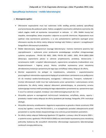 Załącznik nr 13 do Zapytania ofertowego z dnia 19 grudnia 2016 roku Specyfikacja techniczna – meble laboratoryjne I. Wymagania ogólne: Oferowane wyposażenie musi być wykonane ściśle według poniżej podanej specyfikacji asortymentowej dla podanych pokoi. Należy uwzględnić ewentualne odchylenia wymiarów dla całych ciągów mebli od wymiarów rzeczywistych w zakresie +/- 10%. Meble muszą być niepalne, nienasiąkliwe, łatwo zmywalne i odporne na czynniki chemiczne. Wyposażenie musi spełniać niżej wymienione parametry, a w celu potwierdzenia spełniania wymagań przez oferowane wyroby do oferty należy dołączyć katalogi lub/i foldery z opisami i szczegółowymi fotografiami oferowanych produktów. Meble laboratoryjne, dygestorium (wyciąg) laboratoryjny i komory laminarne powinny być zaprojektowane i wykonane przez producenta posiadającego certyfikat zintegrowanego systemu zarządzania : PN-EN ISO 9001: 2009, PN-EN ISO 14001: 2005, PN-N-18001:2004 (dotyczący zapewnienia jakości w zakresie projektowania, produkcji, dostarczania i serwisowania mebli i urządzeń laboratoryjnych, zapewnienia zarządzania środowiskiem oraz bezpieczeństwem i higieną pracy). Ważny certyfikat wystawiony przez niezależną akredytowaną instytucje uprawnioną do tego typu certyfikacji należy dołączyć do oferty. Montaż wyposażenia ma polegać na rozpakowaniu, ustawieniu i wypoziomowaniu poszczególnych elementów wyposażenia będących przedmiotem zamówienia oraz podłączeniu ich do instalacji wodno-kanalizacyjnej, wyciągowej i elektrycznej. Transport, rozładunek i montaż oferowanych mebli musi być wykonywany przez uprawniony i autoryzowany serwis producenta. Do oferty należy załączyć dokument potwierdzający, że pracownicy serwisu wykonującego montaż mebli posiadają do tego odpowiednie uprawnienia np. uprawnienia typu E oraz D w zakresie urządzeń, instalacji i sieci elektroenergetycznych do 1 kV . Wszystkie opisane w wymaganiach technicznych świadectwa, certyfikaty, atesty, raporty i protokoły z badań należy dołączyć do oferty (podobnie jak katalogi, fotografie, DTR i instrukcje obsługi). Wszystkie elementy umeblowania i dygestoria wyposażone w gniazda o klasie szczelności IP44 muszą być zgodne z normą PN-EN 61010-1, a w szczególności posiadać zabezpieczenia przed porażeniem w wyniku dotyku bezpośredniego oraz ochronę przed dotykiem pośrednim. Do oferty należy załączyć Deklarację Zgodności CE (zgodnie z ustawą z dnia 30 sierpnia 2002 r. o systemie oceny zgodności i PN-EN 45014:2000) oraz atest badań wystawiony przez niezależną jednostkę badawczą dla wszystkich elementów oferowanego wyposażenia laboratoryjnego zasilanych energią elektryczną. 1 Załącznik nr 13 do Zapytania ofertowego z dnia 19 grudnia 2016 roku Stoły laboratoryjne (stanowiska robocze wraz z doprowadzonymi mediami) muszą posiadać certyfikat zgodności z normą PN-EN 13150: 2004 „Stoły robocze dla laboratoriów. Wymiary, wymagania bezpieczeństwa i metody badań”, w tym również protokół z badań na bezpieczeństwo elektryczne zgodnie z normą PN-EN 61010-1 „Wymagania bezpieczeństwa elektrycznych przyrządów pomiarowych, automatyki i urządzeń laboratoryjnych” (wymagane przez PN-EN 13150, pkt. 6.5). Badania muszą być wykonane przez niezależne laboratoria akredytowane, a certyfikat wystawiony przez akredytowaną jednostkę certyfikującą w tym zakresie, należy dołączyć do oferty. Dygestorium musi posiadać certyfikat zgodności z normą PN-EN 14175-2 „Wyciągi laboratoryjne. Część 2: Wymagania bezpieczeństwa i sprawności działania” i PN-EN 14175-3 „Wyciągi laboratoryjne. Część 3: Metody badania typu”, wydany przez niezależną jednostkę badawczą, który należy dołączyć do oferty. Komora laminarna z pionowym przepływem powietrza, II klasy bezpieczeństwa mikrobiologicznego (chroniąca produkt, personel i środowisko) musi spełniać wymagania normy PN-EN12469, potwierdzone dołączonym do oferty certyfikatem wystawionym przez niezależną instytucje uprawniona do tego typu certyfikacji, komora musi spełniać wymagania dyrektywy maszynowej 2006/42/WE, w zakresie norm PN-EN ISO 12100 oraz bezpieczeństwa elektrycznego zgodnie z PN-EN 61010-1, jak również kompatybilności elektromagnetycznej urządzenie nie wprowadza zakłóceń elektromagnetycznych i jest na nie odporne, zgodnie z dyrektywą w sprawie kompatybilności elektromagnetycznej 2004/108/WE, normy: EN 55011, EN 61000-3-2, EN 61000-3-3, EN 61000-4-2, EN 61000-4-3, EN 61000-4-4, EN 61000-4-5, EN 61000-4-6, EN 61000-4-11, musi to być wyszczególnione na w/w certyfikacie. Szafki muszą posiadać certyfikat zgodności z normą PN-EN 14727 „Meble laboratoryjne. Meble laboratoryjne do przechowywania. Wymagania i metody badań”, wydany przez niezależne laboratorium akredytowane. Certyfikat należy dołączyć do oferty. Armatura laboratoryjna stosowana w meblach i dygestorium musi być przystosowana do wymagań odpowiednich mediów stosowanych podczas prac w laboratoriach. Zawory i końcówki poboru muszą być zabezpieczone powłoką epoksydową, a oznaczenia na pokrętłach mediów muszą być zgodne z wymaganiami PN-EN 13792: 2003 „Kod barwny do oznaczania zaworów w obsłudze laboratoriów”. Przystawki instalacyjne oraz dygestorium musi być wyposażone w wyłącznik główny urządzenia wraz z kontrolką informującą, że urządzenie jest pod napięciem, zabezpieczenie (wyłącznik) nadprądowe i gniazda elektryczne o szczelności IP44. Zamawiający zastrzega sobie prawo, w przypadku wątpliwości, co do spełnienia przez potencjalnych wykonawców opisanych warunków technicznych, do możliwości obejrzenia 2 Załącznik nr 13 do Zapytania ofertowego z dnia 19 grudnia 2016 roku próbek oferowanego przez nich wyposażenia, celem potwierdzenia wymagań. Warunek ten może zostać spełniony poprzez zorganizowanie wystawy próbek przez wykonawcę lu