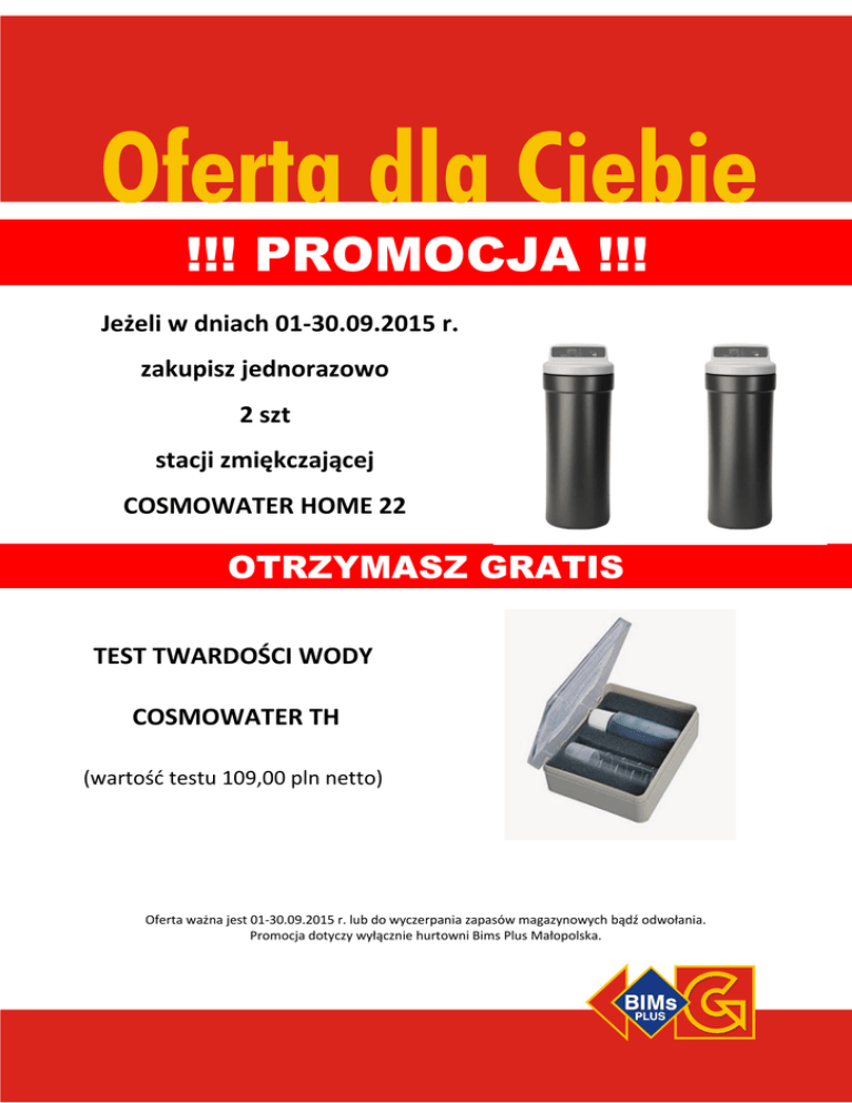 !!! PROMOCJA !!! Jeżeli w dniach 01-30.09.2015 r. zakupisz jednorazowo 2 szt stacji zmiękczającej COSMOWATER HOME 22 OTRZYMASZ GRATIS TEST TWARDOŚCI WODY COSMOWATER TH (wartość testu 109,00 pln netto) Oferta ważna jest 01-30.09.2015 r. lub do wyczerpania zapasów magazynowych bądź odwołania. Promocja dotyczy wyłącznie hurtowni Bims Plus Małopolska.