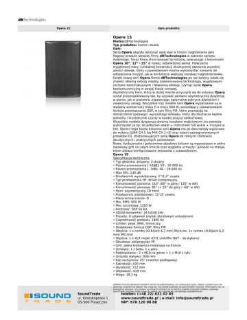 Opera 15 Opis produktu: Opera 15 Marka:dBTechnologies Typ produktu: Scena i studio Opis: Seria Opera zdążyła odcisnąć swój ślad w historii nagłośnienia jako flagowy produkt włoskiej firmy dBTechnologies w zakresie sprzętu mobilnego. Teraz firma chce rozwijać tę historię, powracając z kolumnami Opera 10”, 12” i 15” w nowej, odświeżonej wersji. Połączenie wyjątkowej mocy i unikalnej konstrukcji akustycznej zapewnia wysokiej jakości dźwięk, który z powodzeniem można wykorzystać zarówno do odtwarzania muzyki, jak w kontekście większej instalacji nagłośnieniowej. Dzięki nowej serii Opera firmie dBTechnologies po raz kolejny udało się znaleźć idealną relację między zaawansowaną technologią, wyjątkowymi cechami konstrukcyjnymi i łatwością obsługi, czyniąc serię Opera bezkonkurencyjną w swojej klasie cenowej. Asymetryczny horn, który w dużej mierze przyczynił się do sukcesu Opery został przeprojektowany tak, by uzyskać zarówno asymetryczną dyspersję w pionie, jak w poziomie, zapewniając optymalne pokrycie dźwiękiem i zwiększony zasięg. Wszystkie trzy modele serii Opera wyposażone są w wydajny wzmacniacz klasy D o mocy 600 W, posiadający zaawansowane funkcje przetwarzania DSP, w tym filtry FIR, które pozwalają na dostarczenie spójnego i wyrazistego dźwięku, który dla słuchacza będzie jednolity i krystalicznie czysty w każdej pozycji odsłuchowej. Wszystkie modele dysponują dwoma kanałami wejściowymi (co pozwala wykorzystać je np. do połączeń wokal + instrument lub wokal + muzyka w tle). Oprócz tego każda kolumna serii Opera ma po dwa kanały wyjściowe do wyboru (LINK CH 1 lub MIX CH 1+2) oraz osiem zaprogramowanych presetów EQ, dostosowujących serię Opera do różnych środowisk akustycznych i praktycznych zastosowań. Nowe, funkcjonalne i polerowane obudowy kolumn są wyposażone w pełny metalowy grill na całym froncie oraz wygodne uchwyty i gniazdo na statyw, które ułatwia konfigurowanie zestawów z subwooferami. Opera 15 Specyfikacja techniczna: • Typ głośnika: aktywny, 2-drożny • Pasmo przenoszenia [-10dB]: 50 – 20 000 Hz • Pasmo przenoszenia [- 3dB]: 46 – 19 600 Hz • Max SPL: 130 dB • Przetwornik wysokotonowy: 1”/1,4” cewka • Typ przetwornika HF: driver kompresyjny • Kierunkowość pozioma: 110° (85° w górę / 120° w dół) • Kierunkowość pionowa: 85° (+ 25° do góry / -60° w dół) • Horn: asymetryczny CD Horn • Przetwornik niskotonowy: 15"/2" cewka • Klasa wzmacniacza: D • Moc RMS: 600 W • Moc szczytowa: 1200 W • Kontroler: DSP 56 bit • AD/DA konwerter: 24 bit/48 kHz • Presety: 8 ustawień (wybór obrotowym enkoderem) • Częstotliwość podziału: 1800 Hz • Limiter: peak, RMS, termiczny • Dodatkowe funkcje DSP: filtry FIR • Wejścia: 1 x combo (XLR/Jack 6,3 mm) Mic/Line, 1x combo (XLR/Jack 6,3 mm) MIC/Inst • Wyjścia: 1 x XLR męski (CH1 Link/Mix OUT – do wyboru) • Obudowa: polipropylen PP • Grill: pełna kratownica metalowa na froncie • Uchwyty: 1 z boku, 1 u góry • Podwieszanie : 2 x M10 na górze + 1 x M10 z tyłu • Gniazdo statywu: D36 mm • Kąt nachylenia: 45° (monitor podłogowy) • Szerokość: 420 mm • Wysokość: 722 mm • Głębokość: 419 mm • Waga: 18,3 kg SoundTrade ul. Kineskopowa 1 05-500 Piaseczno UWAGA! Pomimo dołożenia wszelkich starań nie gwarantujemy, że umieszczone opisy, zdjęcia i podane ceny nie zawierają uchybień lub błędów. Nie mogą być one jednak podstawą do jakichkolwiek roszczeń. Informujemy też, że zestawienia towarów i cen podane na naszych stronach nie są ofertą w świetle przepisów kodeksu cywilnego. SoundTrade zastrzega sobie prawo do zmiany cen i opisów bez uprzedniego powiadomienia. telefon: (+48 22) 632 02 85 www:soundtrade.pl | e-mail: [email protected] NIP: 678 120 08 88