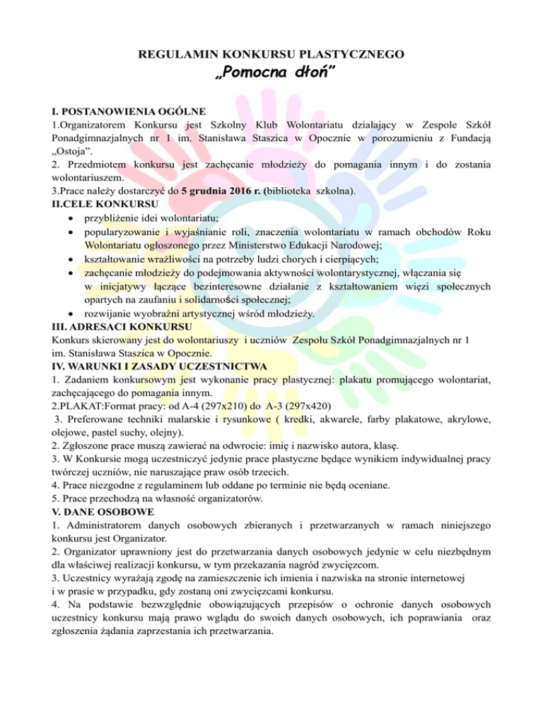 REGULAMIN KONKURSU PLASTYCZNEGO „Pomocna dłoń” I. POSTANOWIENIA OGÓLNE 1.Organizatorem Konkursu jest Szkolny Klub Wolontariatu działający w Zespole Szkół Ponadgimnazjalnych nr 1 im. Stanisława Staszica w Opocznie w porozumieniu z Fundacją „Ostoja”. 2. Przedmiotem konkursu jest zachęcanie młodzieży do pomagania innym i do zostania wolontariuszem. 3.Prace należy dostarczyć do 5 grudnia 2016 r. (biblioteka szkolna). II.CELE KONKURSU przybliżenie idei wolontariatu; popularyzowanie i wyjaśnianie roli, znaczenia wolontariatu w ramach obchodów Roku Wolontariatu ogłoszonego przez Ministerstwo Edukacji Narodowej; kształtowanie wrażliwości na potrzeby ludzi chorych i cierpiących; zachęcanie młodzieży do podejmowania aktywności wolontarystycznej, włączania się w inicjatywy łączące bezinteresowne działanie z kształtowaniem więzi społecznych opartych na zaufaniu i solidarności społecznej; rozwijanie wyobraźni artystycznej wśród młodzieży. III. ADRESACI KONKURSU Konkurs skierowany jest do wolontariuszy i uczniów Zespołu Szkół Ponadgimnazjalnych nr 1 im. Stanisława Staszica w Opocznie. IV. WARUNKI I ZASADY UCZESTNICTWA 1. Zadaniem konkursowym jest wykonanie pracy plastycznej: plakatu promującego wolontariat, zachęcającego do pomagania innym. 2.PLAKAT:Format pracy: od A-4 (297x210) do A-3 (297x420) 3. Preferowane techniki malarskie i rysunkowe ( kredki, akwarele, farby plakatowe, akrylowe, olejowe, pastel suchy, olejny). 2. Zgłoszone prace muszą zawierać na odwrocie: imię i nazwisko autora, klasę. 3. W Konkursie mogą uczestniczyć jedynie prace plastyczne będące wynikiem indywidualnej pracy twórczej uczniów, nie naruszające praw osób trzecich. 4. Prace niezgodne z regulaminem lub oddane po terminie nie będą oceniane. 5. Prace przechodzą na własność organizatorów. V. DANE OSOBOWE 1. Administratorem danych osobowych zbieranych i przetwarzanych w ramach niniejszego konkursu jest Organizator. 2. Organizator uprawniony jest do przetwarzania danych osobowych jedynie w celu niezbędnym dla właściwej realizacji konkursu, w tym przekazania nagród zwycięzcom. 3. Uczestnicy wyrażają zgodę na zamieszczenie ich imienia i nazwiska na stronie internetowej i w prasie w przypadku, gdy zostaną oni zwycięzcami konkursu. 4. Na podstawie bezwzględnie obowiązujących przepisów o ochronie danych osobowych uczestnicy konkursu mają prawo wglądu do swoich danych osobowych, ich poprawiania oraz zgłoszenia żądania zaprzestania ich przetwarzania. VI. KOMISJA KONKURSOWA 1. Prawidłowy przebieg konkursu zapewnia specjalna Komisja Konkursowa powołana przez Organizatora. 2. Członkowie Komisji Konkursowej wyłonią spośród swego grona Przewodniczącego. 3. W ramach swoich kompetencji Komisja Konkursowa: a) wyłoni autorów najlepszych plakatów, b) będzie czuwać nad prawidłowym przebiegiem konkursu. VIII. Kryteria oceny prac konkursowych Prace oceniane będą zgodnie z następującymi kryteriami: zgodność przekazu pracy z celem konkursu, walory artystyczne i estetyczne, ciekawa interpretacja proponowanej tematyki, pomysłowość i oryginalność pracy plastycznej. VII. ZASADY PRZYZNAWANIA NAGRÓD 1. Komisja Konkursowa powołana przez Organizatora dokona wyboru 3 lub 5 najlepszych prac konkursowych. 2.Organizator zastrzega sobie prawo do przyznania wyróżnień. 3.Wręczenie nagród zostanie dokonane dnia 10 grudnia 2016r. na uroczystej Gali Wolontariatu. 4.Wybrane prace, w tym zwycięskie, zostaną uhonorowane wystawą prac podczas uroczystego spotkania wolontariuszy. Serdecznie zapraszamy do udziału w konkursie koordynatorki wolontariatu Marzena Jaruga, Małgorzata Siwek i Anna Waszczyk