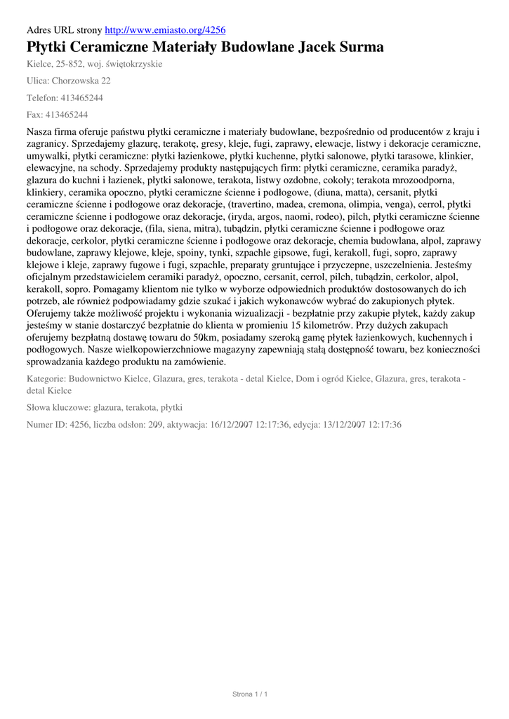 Adres URL strony http://www.emiasto.org/4256 Płytki Ceramiczne Materiały Budowlane Jacek Surma Kielce, 25-852, woj. świętokrzyskie Ulica: Chorzowska 22 Telefon: 413465244 Fax: 413465244 Nasza firma oferuje państwu płytki ceramiczne i materiały budowlane, bezpośrednio od producentów z kraju i zagranicy. Sprzedajemy glazurę, terakotę, gresy, kleje, fugi, zaprawy, elewacje, listwy i dekoracje ceramiczne, umywalki, płytki ceramiczne: płytki łazienkowe, płytki kuchenne, płytki salonowe, płytki tarasowe, klinkier, elewacyjne, na schody. Sprzedajemy produkty następujących firm: płytki ceramiczne, ceramika paradyż, glazura do kuchni i łazienek, płytki salonowe, terakota, listwy ozdobne, cokoły; terakota mrozoodporna, klinkiery, ceramika opoczno, płytki ceramiczne ścienne i podłogowe, (diuna, matta), cersanit, płytki ceramiczne ścienne i podłogowe oraz dekoracje, (travertino, madea, cremona, olimpia, venga), cerrol, płytki ceramiczne ścienne i podłogowe oraz dekoracje, (iryda, argos, naomi, rodeo), pilch, płytki ceramiczne ścienne i podłogowe oraz dekoracje, (fila, siena, mitra), tubądzin, płytki ceramiczne ścienne i podłogowe oraz dekoracje, cerkolor, płytki ceramiczne ścienne i podłogowe oraz dekoracje, chemia budowlana, alpol, zaprawy budowlane, zaprawy klejowe, kleje, spoiny, tynki, szpachle gipsowe, fugi, kerakoll, fugi, sopro, zaprawy klejowe i kleje, zaprawy fugowe i fugi, szpachle, preparaty gruntujące i przyczepne, uszczelnienia. Jesteśmy oficjalnym przedstawicielem ceramiki paradyż, opoczno, cersanit, cerrol, pilch, tubądzin, cerkolor, alpol, kerakoll, sopro. Pomagamy klientom nie tylko w wyborze odpowiednich produktów dostosowanych do ich potrzeb, ale również podpowiadamy gdzie szukać i jakich wykonawców wybrać do zakupionych płytek. Oferujemy także możliwość projektu i wykonania wizualizacji - bezpłatnie przy zakupie płytek, każdy zakup jesteśmy w stanie dostarczyć bezpłatnie do klienta w promieniu 15 kilometrów. Przy dużych zakupach oferujemy bezpłatną dostawę towaru do 50km, posiadamy szeroką gamę płytek łazienkowych, kuchennych i podłogowych. Nasze wielkopowierzchniowe magazyny zapewniają stałą dostępność towaru, bez konieczności sprowadzania każdego produktu na zamówienie. Kategorie: Budownictwo Kielce, Glazura, gres, terakota - detal Kielce, Dom i ogród Kielce, Glazura, gres, terakota detal Kielce Słowa kluczowe: glazura, terakota, płytki Numer ID: 4256, liczba odsłon: 209, aktywacja: 16/12/2007 12:17:36, edycja: 13/12/2007 12:17:36 Strona 1 / 1