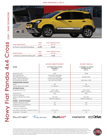 Nowy Fiat Panda 4x4 Cross CENY – DANE TECHNICZNE ROK PRODUKCJI 2016 SILNIK BENZYNOWY CENA (z∏) CENA PROMOCYJNA OD (z∏) 0.9 TwinAir Turbo 90 KM Start&Stop 73 200 68 200 SILNIKI DIESL A CENA (z∏) CENA PROMOCYJNA OD (z∏) 1.3 Multijet 16v 80 KM Start&Stop DPF 78 200 73 200 SILNIK BENZYNOWY SILNIK DIESLA SILNIK 0.9 TwinAir Turbo 85 KM Start&Stop Euro 6 1.3 Multijet 16v 95 KM Start&Stop DPF Euro 6 Pojemność (cm3) Moc maksymalna: kW (KM) przy obr./min Maks. moment obrotowy: Nm (kGm) przy obr./min 875 normal 66,2 (90) 5500 eco 57 (77,5) 5500 normal 145 (14,8) 1900 eco 100 (10,2) 2000 1248 69 (95) 3750 200 (20,4) 1500 PRZENIESIENIE NAPĘDU Napęd Skrzynia biegów, ilość biegów 4x4 4x4 6 + wsteczny 5 + wsteczny 3705 / 1662 (1885 z lusterkami) 3705 / 1662 (1885 z lusterkami) 1657 1657 WYMIARY/KOŁA Długość/szerokość (mm) Wysokość (mm) Pojemność bagażnika zgodnie z VDA (dm3) min./maks. Opony 225 / 870 225 / 870 185/65 R15 88H M+S 185/65 R15 88H M+S OSIĄGI – ZUŻYCIE PALIWA Prędkość maksymalna (km/h) 167 168 Przyspieszenie (s): od 0 do 100 km/h 12,0 12,7 5,9 / 4,3 / 4,9 4,8 / 4,4 / 4,5 114 119 Zużycie paliwa (zgodnie z dyrektywą 1999/100/WE) cykl miejski / pozamiejski / mieszany (l/100 km) Emisja spalin – CO2 (g/km) START&STOP Wszystkie samochody osobowe marki Fiat (z wyłączeniem Sedici) sprzedane od 1.01.2012 i zakupione w punktach sprzedaży dealerów Fiata w Polsce, posiadają 2-letnią gwarancję bez limitu kilometrów. W całym okresie ważności tej gwarancji Klient otrzymuje usługę ASSISTANCE 24h, ważną na terenie całej Europy. Podane informacje na temat gwarancji pojazdu nie stanowią udzielenia kupującemu gwarancji, w szczególności w rozumieniu art. 13 Ustawy z dnia 27 lipca 2002 r. o szczególnych warunkach sprzedaży konsumenckiej oraz o zmianie Kodeksu cywilnego. Gwarancja zostanie udzielona przy sprzedaży pojazdu, a jej warunki zostaną określone w dokumencie gwarancyjnym. Fiat zastrzega sobie prawo do wprowadzenia w dowolnym momencie zmian w modelach opisanych w niniejszym cenniku z powodów natury technicznej lub handlowej. Szczegóły w salonie sprzedaży. Cennik zawiera ceny detaliczne w złotych z VAT. Ceny zawierają podatek akcyzowy. Ceny mogą ulec zmianom bez uprzedniego zawiadomienia w przypadku zmian cen przez producenta, zmian podatkowych, przepisów celnych lub innych przyczyn. Wyposażenie seryjne i dodatkowe poszczególnych modeli może ulegać zmianom w zależności od potrzeb poszczególnych rynków i wymogów prawnych. Dane w niniejszym cenniku mają charakter orientacyjny i nie stanowią oferty w rozumieniu Kodeksu Cywilnego. Nowy Fiat Panda 4x4 Cross WYBRANE ELEMENTY WYPOSA˚ENIA ROK PRODUKCJI 2016 LINIA I STYL Zderzaki w kolorze nadwozia z listwami ochronnymi Światła do jazdy dziennej (DRL) w technologii LED Obudowa lusterek bocznych w kolorze nadwozia Klamki zewnętrzne drzwi w kolorze nadwozia Listwy boczne ochronne w kolorze szarym z logo Cross Relingi dachowe podwyższone CROSS Przyciemniane szyby boczne i tylna Felgi ze stopów lekkich 15-calowe przyciemniane z oponami 185/65 R15 M+S Kierownica i gałka dźwigni zmiany biegów pokryte skórą KOMFORT/FUNKCJONALNOŚĆ GSI - Gear Shift Indicator - wskaźnik zmiany biegów Panel zegarów oraz radia w kolorze szarym matowym Kierownica z regulacją wysokości Reflektory przednie z funkcją Follow Me Home Elektryczne wspomaganie kierownicy Dualdrive™ z trybem City Start&Stop Elektryczne podnoszenie szyb przednich + centralny zamek System tankowania Smart Fuel Komputer pokładowy "My Car" Podwyższony centralny tunel między fotelami przednimi Elektrycznie sterowane i podgrzewane lusterka zewnętrzne Podgrzewane przednie fotele Osłona przeciwsłoneczna pasażera z lusterkiem Tylne czujniki parkowania Nagrzewnica PTC dla silnika Diesla i TwinAir Obudowa oświetlenia w podsufitce z mikrofonem dla systemu Blue&Me Oświetlenie przestrzeni bagażowej Gniazdko zasilające 12 V Klimatyzacja automatyczna z filtrem przeciwpyłkowym Oparcie pasażera składane w stolik Składane dzielone siedzenie tylne Fix&Fold 40/60, wersja 5-miejscowa Regulacja wysokości siedzenia kierowcy Zestaw dla palących Sterowanie centralnym zamkiem za pomocą pilota w kluczyku Ogrzewanie szyby przedniej Immobiliser Fiat Code BEZPIECZEŃSTWO Czujniki zapięcia pasów dla wszystkich pasażerów samochodu ELD - elektroniczna blokada dyferencjału ABS + EBD (Electronic Brake Distribution) + BAS TPMS - czujniki ciśnienia powietrza w oponach Przednie zagłówki Antiwiplash Przednie poduszki powietrzne (po stronie kierowcy i pasażera) Kurtyny powietrzne ESC (Electronic Stability Control) + ASR + Hill Holder ESS - system sygnalizacji awaryjnego hamowania Boczne poduszki powietrzne z przodu Zagłówki tylne Światła przeciwmgielne Fix&Go – Zestaw do pompowania i naprawy opon Koło zapasowe niepełnowymiarowe System przeciwpożarowy FPS System City Brake Control Selektor Terrain Control z trybem Hill Descent Control - kontrola zjazdu ze wzniesienia AUDIO/TELEMATYKA Radioodtwarzacz CD+MP3 (6 głośników) Blue&Me™ z przyciskami sterowania radiem/telefonem na kierownicy My Port (możliwość zintegrowanego montażu nawigacji satelitarnej TomTom w desce rozdzielczej) PAKIETY Pakiet KOMFORT: (uchwyty dla pasażerów z tyłu, uchwyt na okulary po stronie kierowcy, regulacja wysokości przednich pasów bezpieczeństwa) Pakiet ZIMOWY: (podgrzewane fotele przednie, podgrzewana przednia szyba) – niedostępne Podane ceny są cenami wyposażenia opcjonalnego. ¢ wyposażenie standardowe CROSS ¢ ¢ ¢ ¢ ¢ ¢ 550 zł ¢ ¢ 011 096 112 5DE 428 4MF 459 465 041 452 4M6 508 52Y 54E 68U 823 140 295 273+195 626 665 008 253 015 ¢ ¢ ¢ ¢ ¢ ¢ ¢ ¢ ¢ ¢ ¢ 1 100 zł ¢ 1 100 zł 550 zł ¢ ¢ ¢ ¢ 550 zł ¢ ¢ 200 zł ¢ 550 zł ¢ 009+052 7B2 42F 500+502 614 392 094 505 182 097 499 803 4G5 6DC BNH ¢ ¢ ¢ ¢ ¢ ¢ ¢ ¢ ¢ ¢ ¢ ¢ ¢ 350 zł ¢ 1650 zł ¢ 717 6RR+4GA+5BH 68R ¢ ¢ 250 zł 890 6R7 200 zł 11