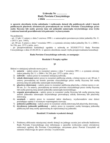 Uchwała Nr ………… Rady Powiatu Cieszyńskiego z dnia ………………… w sprawie określenia trybu udzielania i rozliczania dotacji dla publicznych szkół i innych publicznych placówek oświatowych prowadzonych na terenie Powiatu Cieszyńskiego przez osoby fizyczne lub osoby prawne inne niż jednostki samorządu terytorialnego oraz trybu i zakresu kontroli prawidłowości ich pobrania i wykorzystania Na podstawie: - art. 12 pkt 11 ustawy z dnia 5 czerwca 1998 r. o samorządzie powiatowym (tekst jednolity Dz. U. z 2015 r. poz. 1445), - art. 80 ust. 4 ustawy z dnia 7 września 1991 r. o systemie oświaty (tekst jednolity Dz. U. z 2004 r. Nr 256, poz. 2572 z późn. zm.), - po przeprowadzeniu konsultacji zgodnie z uchwałą nr XXXII/277/13 Rady Powiatu Cieszyńskiego z dnia 23.04.2013r. w sprawie określenia zasad i trybu przeprowadzania konsultacji Rada Powiatu Cieszyńskiego uchwala, co następuje: Rozdział 1 Przepisy ogólne §1 Ilekroć w niniejszej uchwale mowa jest o: 1) ustawie – należy przez to rozumieć ustawę z dnia 7 września 1991 r. o systemie oświaty (tekst jednolity Dz. U. z 2004 r. Nr 256, poz. 2572 z późn. zm.); 2) uchwale – należy przez to rozumieć niniejszą uchwałę; 3) szkole dotowanej należy przez to rozumieć publiczną szkołę, o której mowa w art. 80 ust. 3 ustawy prowadzoną na terenie powiatu cieszyńskiego przez osobę fizyczną lub osobę prawną inną niż jednostka samorządu terytorialnego; 4) placówce dotowanej – należy przez to rozumieć publiczną placówkę, o której mowa w art. 80 ust. 2c i 3a ustawy, prowadzoną na terenie powiatu cieszyńskiego przez osobę fizyczną lub osobę prawną inną aniżeli jednostka samorządu terytorialnego; 5) organie prowadzącym - należy przez to rozumieć osobę fizyczną lub osobę prawną inną aniżeli jednostka samorządu terytorialnego prowadzącą szkołę dotowaną lub placówkę dotowaną; 6) uczniach – należy przez to rozumieć także słuchaczy, wychowanków oraz dzieci posiadające opinię o wczesnym wspomaganiu rozwoju; 7) jednostce publicznej - należy przez to rozumieć szkołę dotowaną lub placówkę dotowaną; 8) dyrektorze jednostki publicznej – należy przez to rozumieć osobę kierującą jednostką publiczną lub inną osobę uprawnioną do reprezentacji tej jednostki. Rozdział 2 Ustalenie wysokości dotacji §2 1. Podstawą obliczenia miesięcznej stawki dotacji na jednego ucznia jest uchwała budżetowa Rady Powiatu Cieszyńskiego oraz informacja o sposobie wyliczenia części oświatowej subwencji ogólnej dla Powiatu Cieszyńskiego, otrzymana przez Powiat Cieszyński od ministra właściwego do spraw oświaty i wychowania. 2. Stawka dotacji przypadająca na jednego ucznia jednostki publicznej ustalana jest z dokładnością do dwóch miejsc po przecinku. §3 1. 2. 3. Szkole dotowanej dotacja przysługuje na każdego ucznia w wysokości 100% ustalonych w budżecie Powiatu Cieszyńskiego wydatków bieżących przewidzianych na jednego ucznia szkół publicznych tego samego typu i rodzaju prowadzonych przez Powiat Cieszyński, pomniejszonych o kwotę dotacji, o której mowa w art. 22ae ust. 3 ustawy. Jeżeli wydatki bieżące ustalone w budżecie Powiatu Cieszyńskiego w przeliczeniu na jednego ucznia szkół tego samego typu i rodzaju prowadzonych przez Powiat Cieszyński są niższe niż kwota otrzymana na jednego ucznia szkoły publicznej danego typu i rodzaju w części oświatowej subwencji ogólnej dla Powiatu Cieszyńskiego, szkole dotowanej przysługuje dotacja w wysokości 100% kwoty przewidzianej na jednego ucznia danego typu i rodzaju szkoły w części oświatowej subwencji ogólnej otrzymywanej przez Powiat Cieszyński. W przypadku nieprowadzenia przez Powiat Cieszyński szkoły publicznej tego samego typu i rodzaju, dotacja przekazywana jest w wysokości 100% kwoty przewidzianej na jednego ucznia danego typu i rodzaju szkoły w części oświatowej subwencji ogólnej otrzymywanej przez Powiat Cieszyński. Publicznej placówce, o której mowa w art. 2 pkt 5 ustawy, a także publicznym poradniom psychologiczno-pedagogicznym, które zgodnie z art. 71b ust. 2a ustawy prowadzą wczesne wspomaganie rozwoju dziecka, dotacja przysługuje w wysokości 100% kwoty przewidzianej na jedno dziecko objęte wczesnym wspomaganiem rozwoju w części oświatowej subwencji ogólnej otrzymywanej przez Powiat Cieszyński. Publicznej placówce, o której mowa w art. 2 pkt 5 i 7 ustawy, dotacja przysługuje na każdego wychowanka w wysokości 100% ustalonych w budżecie Powiatu Cieszyńskiego wydatków bieżących przewidzianych na jednego wychowanka placówek tego rodzaju prowadzonych przez Powiat Cieszyński. Jeżeli wydatki bieżące ustalone w budżecie Powiatu Cieszyńskiego w przeliczeniu na jednego wychowanka placówek danego rodzaju prowadzonych przez Powiat Cieszyński są niższe niż kwota otrzymana na jednego wychowanka placówki tego rodzaju w części oświatowej subwencji ogólnej dla Powiatu Cieszyńskiego, placówce dotowanej przysługuje dotacja w wysokości 100% kwoty przewidzianej na jednego wychowanka placówki tego rodzaju w części oświatowej subwencji ogólnej otrzymywanej przez Powiat Cieszyński. W przypadku nieprowadzenia przez Powiat Cieszyński placówki publicznej danego rodzaju, dotacja przekazywana jest w wysokości 100% kwoty przewidzianej na jednego wychowanka placówki tego rodzaju w części oświatowej subwencji ogólnej otrzymywanej przez Powiat Cieszyński. Rozdział 3 Tryb udzielania dotacji §4 1. 2. Warunkiem przyznania dotacji jednostkom o których mowa w § 3, jest złożenie prawidłowo wypełnionego i kompletnego wniosku, nie później niż do dnia 30 września roku poprzedzającego rok udzielenia dotacji. Wzór wniosku o udzielenie dotacji dla jednostek wymienionych w § 3 stanowi załącznik nr 1 do uchwały. §5 1. 2. Podstawą przekazania jednostkom o których mowa w § 3 dotacji na dany miesiąc, jest sprawozdanie 