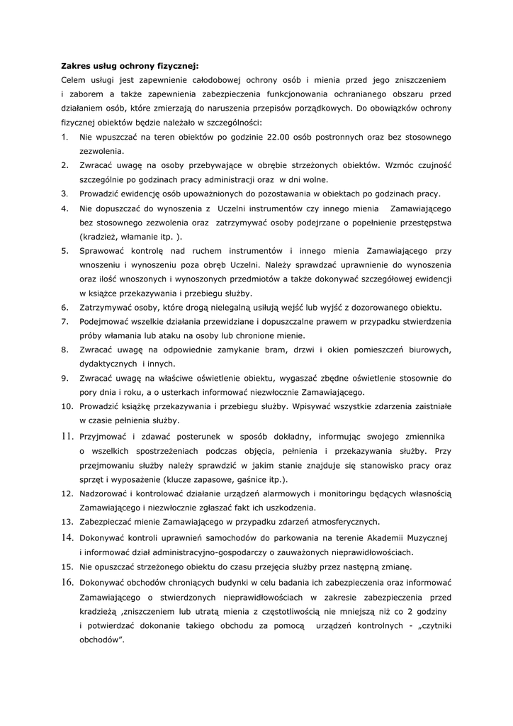 Zakres usług ochrony fizycznej: Celem usługi jest zapewnienie całodobowej ochrony osób i mienia przed jego zniszczeniem i zaborem a także zapewnienia zabezpieczenia funkcjonowania ochranianego obszaru przed działaniem osób, które zmierzają do naruszenia przepisów porządkowych. Do obowiązków ochrony fizycznej obiektów będzie należało w szczególności: 1. Nie wpuszczać na teren obiektów po godzinie 22.00 osób postronnych oraz bez stosownego zezwolenia. 2. Zwracać uwagę na osoby przebywające w obrębie strzeżonych obiektów. Wzmóc czujność szczególnie po godzinach pracy administracji oraz w dni wolne. 3. Prowadzić ewidencję osób upoważnionych do pozostawania w obiektach po godzinach pracy. 4. Nie dopuszczać do wynoszenia z Uczelni instrumentów czy innego mienia Zamawiającego bez stosownego zezwolenia oraz zatrzymywać osoby podejrzane o popełnienie przestępstwa (kradzież, włamanie itp. ). 5. Sprawować kontrolę nad ruchem instrumentów i innego mienia Zamawiającego przy wnoszeniu i wynoszeniu poza obręb Uczelni. Należy sprawdzać uprawnienie do wynoszenia oraz ilość wnoszonych i wynoszonych przedmiotów a także dokonywać szczegółowej ewidencji w książce przekazywania i przebiegu służby. 6. Zatrzymywać osoby, które drogą nielegalną usiłują wejść lub wyjść z dozorowanego obiektu. 7. Podejmować wszelkie działania przewidziane i dopuszczalne prawem w przypadku stwierdzenia próby włamania lub ataku na osoby lub chronione mienie. 8. Zwracać uwagę na odpowiednie zamykanie bram, drzwi i okien pomieszczeń biurowych, dydaktycznych i innych. 9. Zwracać uwagę na właściwe oświetlenie obiektu, wygaszać zbędne oświetlenie stosownie do pory dnia i roku, a o usterkach informować niezwłocznie Zamawiającego. 10. Prowadzić książkę przekazywania i przebiegu służby. Wpisywać wszystkie zdarzenia zaistniałe w czasie pełnienia służby. 11. Przyjmować i zdawać posterunek w sposób dokładny, informując swojego zmiennika o wszelkich spostrzeżeniach podczas objęcia, pełnienia i przekazywania służby. Przy przejmowaniu służby należy sprawdzić w jakim stanie znajduje się stanowisko pracy oraz sprzęt i wyposażenie (klucze zapasowe, gaśnice itp.). 12. Nadzorować i kontrolować działanie urządzeń alarmowych i monitoringu będących własnością Zamawiającego i niezwłocznie zgłaszać fakt ich uszkodzenia. 13. Zabezpieczać mienie Zamawiającego w przypadku zdarzeń atmosferycznych. 14. Dokonywać kontroli uprawnień samochodów do parkowania na terenie Akademii Muzycznej i informować dział administracyjno-gospodarczy o zauważonych nieprawidłowościach. 15. Nie opuszczać strzeżonego obiektu do czasu przejęcia służby przez następną zmianę. 16. Dokonywać obchodów chroniących budynki w celu badania ich zabezpieczenia oraz informować Zamawiającego o stwierdzonych nieprawidłowościach w zakresie zabezpieczenia przed kradzieżą ,zniszczeniem lub utratą mienia z częstotliwością nie mniejszą niż co 2 godziny i potwierdzać dokonanie takiego obchodu za pomocą obchodów”. urządzeń kontrolnych - „czytniki 17. Znać lokalizację punktów przeciwpożarowych, ujęć wody, środków alarmowania oraz sposoby alarmowania i wzywania straży pożarnej. 18. Posiadać umiejętność posługiwania się podręcznym sprzętem przeciwpożarowym. 19. Kontrolować miejsca niebezpieczne z punktu widzenia zagrożenia pożarowego oraz sprawdzać w czasie obchodu obiektów stan przestrzegania przepisów zabezpieczenia przeciwpożarowego. 20. W przypadku wybuchu pożaru zawiadomić straż pożarną oraz kierownictwo obiektu i przystąpić do gaszenia ognia dostępnymi środkami gaśniczymi, wezwać do pomocy osoby postronne. 21. W czasie akcji gaśniczej bacznie strzec powierzone mienie przed kradzieżą. 22. Pracownikom ochrony mienia zabrania się wglądu w pisma i akta Zamawiającego oraz przebywania w pomieszczeniach biurowych poza potrzebami wynikłymi z tytułu kontroli i obchodu obiektów. W pomieszczeniach biurowych nie wolno korzystać z urządzeń telekomunikacyjnych, oraz innych maszyn i urządzeń technicznych. 23. Do obowiązków służby ochrony należy ponadto: a. ustalanie uprawnień osób do przebywania w chronionych obiektach oraz legitymowanie podejrzanych osób, w celu ustalenia ich tożsamości, b. wzywanie osób do opuszczenia obiektu w przypadku stwierdzenia braku uprawnień do przebywania na terenie chronionych obiektów albo zakłócenia przez nie porządku publicznego, c. zatrzymanie osób stwarzających w sposób bezpośredni zagrożenie dla życia lub zdrowia ludzkiego oraz zagrożenie chronionego mienia, w celu niezwłocznego oddania tych osób Policji. 24. Pracownicy wykonujący usługę dozoru i ochrony winni współpracować z pracownikami Zamawiającego w zakresie minimum: a. wymiany informacji o osobach przebywających na terenie obiektów, b. otwierania drzwi kluczami zapasowymi w przypadku zaginięcia klucza właściwego, c. krótkotrwałe zastępstwo na recepcji itp. 25. Pracownicy winni odznaczać się schludnym wyglądem, dobrym stanem zdrowia, posiadać jednolity strój służbowy, a także środki łączności radiowej z portiernią i grupą interwencyjną, oraz nosić identyfikatory ze zdjęciem. Powyższe zadania mają na celu zapewnienie bezpieczeństwa osób przebywających na terenie Zamawiającego, zabezpieczać przed kradzieżą, włamaniem innymi zdarzeniami losowymi (pożar, zalanie itp.) wszystkich obiektów, mienia i pojazdów znajdujących się na terenie powierzonym pod dozór.