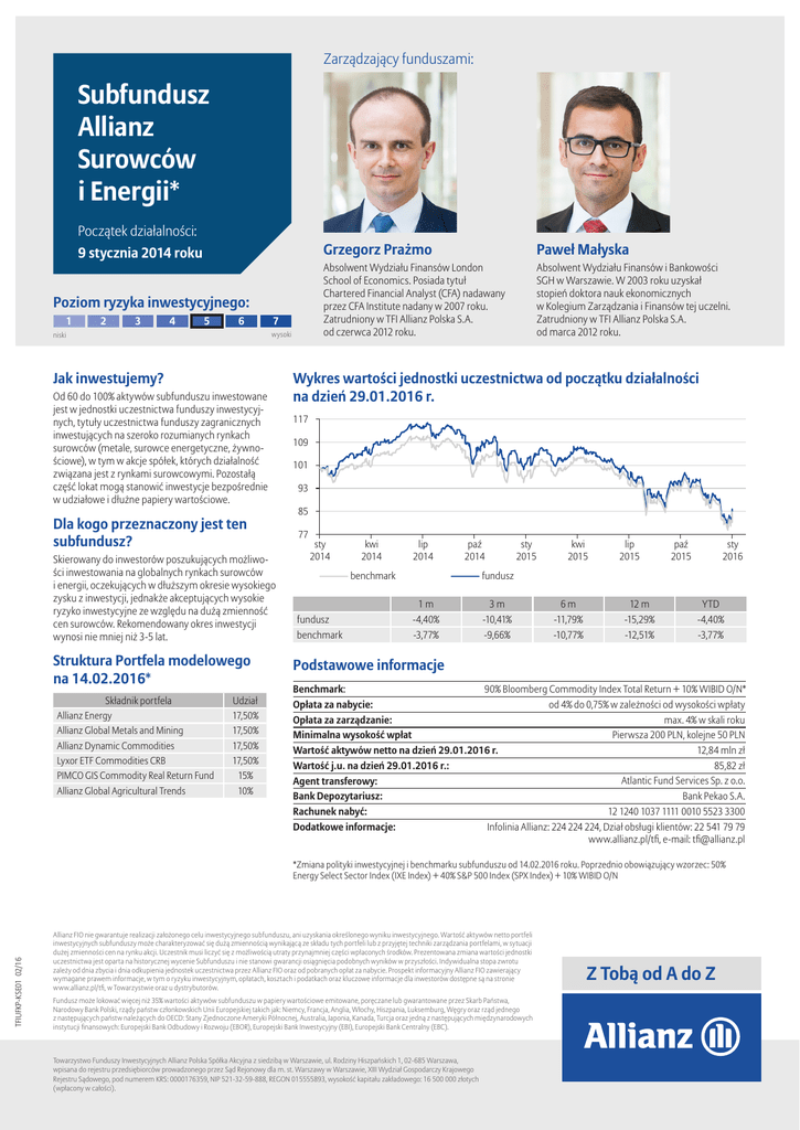 Zarządzający funduszami: Subfundusz Allianz Surowców i Energii* Początek działalności: 9 stycznia 2014 roku Poziom ryzyka inwestycyjnego: 1 2 3 4 5 6 7 wysoki niski Jak inwestujemy? Od 60 do 100% aktywów subfunduszu inwestowane jest w jednostki uczestnictwa funduszy inwestycyjnych, tytuły uczestnictwa funduszy zagranicznych inwestujących na szeroko rozumianych rynkach surowców (metale, surowce energetyczne, żywnościowe), w tym w akcje spółek, których działalność związana jest z rynkami surowcowymi. Pozostałą część lokat mogą stanowić inwestycje bezpośrednie w udziałowe i dłużne papiery wartościowe. Dla kogo przeznaczony jest ten subfundusz? Skierowany do inwestorów poszukujących możliwości inwestowania na globalnych rynkach surowców i energii, oczekujących w dłuższym okresie wysokiego zysku z inwestycji, jednakże akceptujących wysokie ryzyko inwestycyjne ze względu na dużą zmienność cen surowców. Rekomendowany okres inwestycji wynosi nie mniej niż 3-5 lat. Struktura Portfela modelowego na 14.02.2016* Składnik portfela Allianz Energy Allianz Global Metals and Mining Allianz Dynamic Commodities Lyxor ETF Commodities CRB PIMCO GIS Commodity Real Return Fund Allianz Global Agricultural Trends Udział 17,50% 17,50% 17,50% 17,50% 15% 10% Grzegorz Prażmo Paweł Małyska Absolwent Wydziału Finansów London School of Economics. Posiada tytuł Chartered Financial Analyst (CFA) nadawany przez CFA Institute nadany w 2007 roku. Zatrudniony w TFI Allianz Polska S.A. od czerwca 2012 roku. Absolwent Wydziału Finansów i Bankowości SGH w Warszawie. W 2003 roku uzyskał stopień doktora nauk ekonomicznych w Kolegium Zarządzania i Finansów tej uczelni. Zatrudniony w TFI Allianz Polska S.A. od marca 2012 roku. Wykres wartości jednostki uczestnictwa od początku działalności na dzień 29.01.2016 r. 117 109 101 93 85 77 sty 2014 kwi 2014 lip 2014 paź 2014 benchmark fundusz benchmark sty 2015 kwi 2015 lip 2015 paź 2015 sty 2016 fundusz 1m -4,40% -3,77% 3m -10,41% -9,66% 6m -11,79% -10,77% 12 m -15,29% -12,51% YTD -4,40% -3,77% Podstawowe informacje 90% Bloomberg Commodity Index Total Return + 10% WIBID O/N* Benchmark: od 4% do 0,75% w zależności od wysokości wpłaty Opłata za nabycie: max. 4% w skali roku Opłata za zarządzanie: Pierwsza 200 PLN, kolejne 50 PLN Minimalna wysokość wpłat 12,84 mln zł Wartość aktywów netto na dzień 29.01.2016 r. 85,82 zł Wartość j.u. na dzień 29.01.2016 r.: Atlantic Fund Services Sp. z o.o. Agent transferowy: Bank Pekao S.A. Bank Depozytariusz: 12 1240 1037 1111 0010 5523 3300 Rachunek nabyć: Infolinia Allianz: 224 224 224, Dział obsługi klientów: 22 541 79 79 Dodatkowe informacje: www.allianz.pl/tfi, e-mail: [email protected] TFIUFKP-KSE01 02/16 *Zmiana polityki inwestycyjnej i benchmarku subfunduszu od 14.02.2016 roku. Poprzednio obowiązujący wzorzec: 50% Energy Select Sector Index (IXE Index) + 40% S&P 500 Index (SPX Index) + 10% WIBID O/N Allianz FIO nie gwarantuje realizacji założonego celu inwestycyjnego subfunduszu, ani uzyskania określonego wyniku inwestycyjnego. Wartość aktywów netto portfeli inwestycyjnych subfunduszy może charakteryzować się dużą zmiennością wynikającą ze składu tych portfeli lub z przyjętej techniki zarządzania portfelami, w sytuacji dużej zmienności cen na rynku akcji. Uczestnik musi liczyć się z możliwością utraty przynajmniej części wpłaconych środków. Prezentowana zmiana wartości jednostki uczestnictwa jest oparta na historycznej wycenie Subfunduszu i nie stanowi gwarancji osiągnięcia podobnych wyników w przyszłości. Indywidualna stopa zwrotu zależy od dnia zbycia i dnia odkupienia jednostek uczestnictwa przez Allianz FIO oraz od pobranych opłat za nabycie. Prospekt informacyjny Allianz FIO zawierający wymagane prawem informacje, w tym o ryzyku inwestycyjnym, opłatach, kosztach i podatkach oraz kluczowe informacje dla inwestorów dostępne są na stronie www.allianz.pl/tfi, w Towarzystwie oraz u dystrybutorów. Fundusz może lokować więcej niż 35% wartości aktywów subfunduszu w papiery wartościowe emitowane, poręczane lub gwarantowane przez Skarb Państwa, Narodowy Bank Polski, rządy państw członkowskich Unii Europejskiej takich jak: Niemcy, Francja, Anglia, Włochy, Hiszpania, Luksemburg, Węgry oraz rząd jednego z następujących państw należących do OECD: Stany Zjednoczone Ameryki Północnej, Australia, Japonia, Kanada, Turcja oraz jedną z następujących międzynarodowych instytucji finansowych: Europejski Bank Odbudowy i Rozwoju (EBOR), Europejski Bank Inwestycyjny (EBI), Europejski Bank Centralny (EBC). Towarzystwo Funduszy Inwestycyjnych Allianz Polska Spółka Akcyjna z siedzibą w Warszawie, ul. Rodziny Hiszpańskich 1, 02-685 Warszawa, wpisana do rejestru przedsiębiorców prowadzonego przez Sąd Rejonowy dla m. st. Warszawy w Warszawie, XIII Wydział Gospodarczy Krajowego Rejestru Sądowego, pod numerem KRS: 0000176359, NIP 521-32-59-888, REGON 015555893, wysokość kapitału zakładowego: 16 500 000 złotych (wpłacony w całości). Z Tobą od A do Z