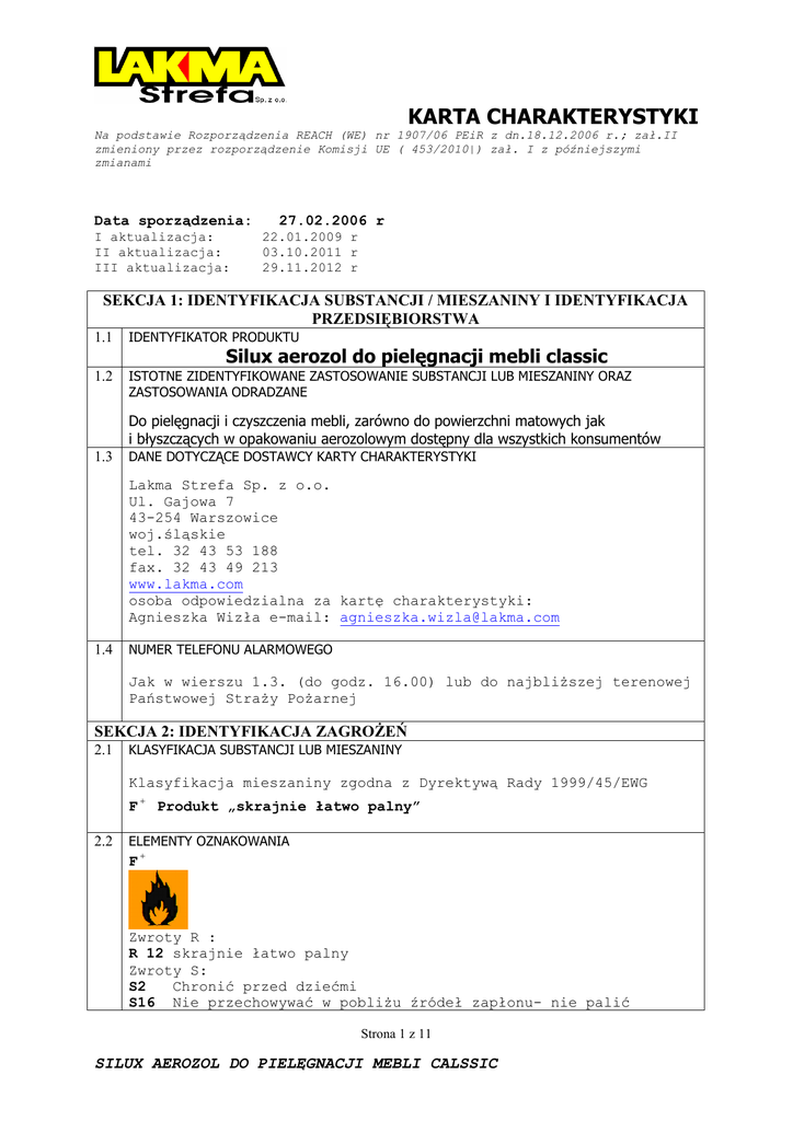 KARTA CHARAKTERYSTYKI Na podstawie Rozporządzenia REACH (WE) nr 1907/06 PEiR z dn.18.12.2006 r.; zał.II zmieniony przez rozporządzenie Komisji UE ( 453/2010|) zał. I z późniejszymi zmianami Data sporządzenia: I aktualizacja: II aktualizacja: III aktualizacja: 27.02.2006 r 22.01.2009 r 03.10.2011 r 29.11.2012 r SEKCJA 1: IDENTYFIKACJA SUBSTANCJI / MIESZANINY I IDENTYFIKACJA PRZEDSIĘBIORSTWA 1.1 IDENTYFIKATOR PRODUKTU 1.2 ISTOTNE ZIDENTYFIKOWANE ZASTOSOWANIE SUBSTANCJI LUB MIESZANINY ORAZ ZASTOSOWANIA ODRADZANE Silux aerozol do pielęgnacji mebli classic Do pielęgnacji i czyszczenia mebli, zarówno do powierzchni matowych jak i błyszczących w opakowaniu aerozolowym dostępny dla wszystkich konsumentów 1.3 DANE DOTYCZĄCE DOSTAWCY KARTY CHARAKTERYSTYKI Lakma Strefa Sp. z o.o. Ul. Gajowa 7 43-254 Warszowice woj.śląskie tel. 32 43 53 188 fax. 32 43 49 213 www.lakma.com osoba odpowiedzialna za kartę charakterystyki: Agnieszka Wizła e-mail: [email protected] 1.4 NUMER TELEFONU ALARMOWEGO Jak w wierszu 1.3. (do godz. 16.00) lub do najbliższej terenowej Państwowej Straży Pożarnej SEKCJA 2: IDENTYFIKACJA ZAGROŻEŃ 2.1 KLASYFIKACJA SUBSTANCJI LUB MIESZANINY Klasyfikacja mieszaniny zgodna z Dyrektywą Rady 1999/45/EWG F + Produkt „skrajnie łatwo palny” 2.2 ELEMENTY OZNAKOWANIA F+ Zwroty R : R 12 skrajnie łatwo palny Zwroty S: S2 Chronić przed dziećmi S16 Nie przechowywać w pobliżu źródeł zapłonu- nie palić Strona 1 z 11 SILUX AEROZOL DO PIELĘGNACJI MEBLI CALSSIC KARTA CHARAKTERYSTYKI Na podstawie Rozporządzenia REACH (WE) nr 1907/06 PEiR z dn.18.12.2006 r.; zał.II zmieniony przez rozporządzenie Komisji UE ( 453/2010|) zał. I z późniejszymi zmianami tytoniu S23 Nie wdychać gazu/pary/rozpylonej cieczy S51 Stosować wyłącznie w dobrze wentylowanych pomieszczeniach Składniki wg Rozporządzenia ( WE) nr 648/2004 w sprawie detergentów z późniejszymi zmianami: Kompozycja zapachowa ( Limonene), środek konserwujący (Methylchloroisothiazolione, Methylisothiazolinone) 2.3 INNE ZAGROŻENIA Pojemnik pod ciśnieniem: chronić przed słońcem i nagrzaniem powyżej 50°C. Nie przekłuwać ani nie spalać, także po zużyciu SEKCJA 3:SKŁAD/ INFORMACJA O SKŁADNIKACH 3.1 3.2 SUBSTANCJE Nie dotyczy MIESZANINY NIEBEZPIECZNE SKŁADNIKI MIESZANINY (WE) 1272/2008 Nazwa substancji/ INCI name Nr indeksowy Nr WE Nr CAS mieszanina gazów płynnych propan-butan- izobutan 100 % mieszanina gazów płynnych propan- butan- izobutan zawiera: Butan 601-004-00-0 203-448-7 106-97-8 Izobutan 601-004-00-0 200-857-2 75-28-5 Propan 601-003-00-5 200-827-9 74-98-6 Nr rejestru % wagowy Klasa zagrożenia Zwroty H ------- 10-15 % Flam gas 1 Press gas H 220 H 280 01211947469 1-32 01211948539 5-27 01211948694 4-21 0-100 % Flam gas 1 Press gas H 220 H 280 0-100 % Flam gas 1 Press gas H 220 H 280 0-100 % Flam gas 1 Press gas H 220 H 280 NIEBEZPIECZNE SKŁADNIKI MIESZANINY wg Dyrektywy 67/548 /EWG Nazwa substancji/ INCI Nr indeksowy Nr WE name mieszanina gazów płynnych propan-butan- izobutan Nr CAS 100 % mieszanina gazów płynnych propan- butan- izobutan zawiera: Butan 601-004-00-0 203-448-7 106-97-8 Izobutan 601-004-00-0 200-857-2 75-28-5 Propan 601-003-00-5 200-827-9 74-98-6 Nr rejestru % wagowy Symbol zagrożenia Zwroty R ------- 10-15 % F R12 01211947469 1-32 01211948539 5-27 01211948694 4-21 0-100 % F 0-100 % F 0-100 % F + + R12 + R12 + R12 SEKCJA 4: ŚRODKI PIERWSZEJ POMOCY 4.1 Opis środków pierwszej pomocy W przypadku wystąpienia jakichkolwiek niepokojących objawów wezwać natychmiast lekarza lub odwieźć poszkodowanego do szpitala, pokazać kartę charakterystyki, opakowanie produktu lub etykietę. Inhalacja W warunkach normalnych zagrożenie praktycznie nie istnieje. W warunkach awaryjnych wyprowadzić lub Strona 2 z 11 SILUX AEROZOL DO PIELĘGNACJI MEBLI CALSSIC KARTA CHARAKTERYSTYKI Na podstawie Rozporządzenia REACH (WE) nr 1907/06 PEiR z dn.18.12.2006 r.; zał.II zmieniony przez rozporządzenie Komisji UE ( 453/2010|) zał. I z późniejszymi zmianami Kontakt z oczami Kontakt ze skórą Połknięcie: 4.2 wynieść poszkodowanego na świeże powietrze. Przepłukać obficie wodą, jeżeli podrażnienie oczu utrzymuje się, skonsultować się ze specjalistą. Zapobiegawczo umyć wodą z mydłem. W przypadku podrażnienia skóry skonsultować się z lekarzem. Wypić 1-2 szklanki wody. W razie potrzeb skontaktować się z lekarzem, pokazać kartę charakterystyki, opakowanie produktu lub etykietę. Nieprzytomnej osobie nigdy nie podawać nic doustnie. NAJWAŻNIEJSZE OSTRE I OPÓŹNIONE OBJAWY ORAZ SKUTKI NARAŻENIA Patrz pkt 11. 4.3 WSKAZANIA DOTYCZĄCE WSZELKIEJ NATYCHMIASTOWEJ POMOCY LEKARSKIEJ I SZCZEGÓLNEGO POSTĘPOWANIA Z POSZKODOWANYM Brak danych SEKCJA 5: POSTĘPOWANIE W PRZYPADKU POŻARU 5.1 ŚRODKI GAŚNICZE dwutlenek węgla, proszki gaśnicze, gaśnica pianowa, prądy wodne rozproszone. 5.2 SZCZEGÓLNE ZAGROŻENIE ZWIĄZANE Z SUBSTANCJĄ LUB MIESZANINĄ podczas pożaru powstają niebezpieczne dla zdrowia pary i dymy, które mogą zawierać tlenki węgla, siarki oraz związki organiczne i nieorganiczne. Nie wdychać dymów. 5.3 INFORMACJE DLA STRAŻY POŻARNEJ: odzież gazoszczelna i aparaty izolujące drogi oddechowe niezależne od otaczającego powietrza. SEKCJA 6: POSTĘPOWANIE W PRZYPADKU NIEZAMIERZONEGO UWOLNIENIA DO ŚRODOWISKA 6.1 INDYWIDUALNE ŚRODKI OCHRONY, WYPOSAŻENIE OCHRONNE I PROCEDURY W SYTUACJACH AWARAYJNYCH Nie dopuszczać osób postronnych i nieupoważnionych. Unikać bezpośredniego kontaktu z produktem, zapewnić wentylację, stosować odpowiednie środki ochrony indywidualnej, patrz pkt.8. 6.2 ŚRODKI OSTROŻNOŚCI W ZAKRESIE OCHRONY ŚRODOWISKA Zapobiegać zanieczyszczeniu gleby i wody oraz przedostaniu się do kanalizacji, rowów lub rzek. 6.3 6.4 METODY I MATERIAŁY ZAPOBIEGAJĄCE ROZPRZESTRZENIANIU SIĘ SKAŻENIA I SŁUŻĄCE DO USUWANIA SKAŻENIA wchłaniać za pomocą materiałów neutralnych (ziemia, piasek) i umieścić w odpowiednio oznako