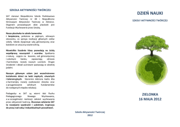 SZKOŁA AKTYWNOŚCI TWÓRCZEJ DZIEO NAUKI SAT stanowi Niepubliczna Szkoła Podstawowa Aktywności Twórczej nr 48 i Niepubliczne Gimnazjum Aktywności Twórczej w Zielonce. Organem prowadzącym obie placówki jest Fundacja Wychowanie przez Sztukę. SZKOŁY AKTYWNOŚCI TWÓRCZEJ Nasza placówka to szkoła kameralna i bezpieczna, położona w pięknym, zdrowym otoczeniu, co sprzyja realizacji głównych celów szkoły. Szkoła dysponuje salą gimnastyczną oraz boiskiem ze sztuczną nawierzchnią. Niewielkie liczebnie klasy pozwalają na ścisłą współpracę nauczycieli i uczniów. Spotkania z naturą, zajęcia na basenie, sali gimnastycznej i szkolnym boisku zapewniają zdrowie i harmonijny rozwój naszym uczniom. Drugie śniadanie i obiad uczniowie spożywają w szkolnej jadalni. Naszym głównym celem jest wszechstronne kształcenie dzieci na ludzi mądrych, otwartych i tolerancyjnych. Starannie dobrana kadra dba o harmonijny rozwój osobowości dziecka oraz o przygotowanie solidnych fundamentów do następnych etapów edukacji. Pedagodzy w SAT są wierni idei Ruchu Pedagogicznego Nowego Wychowania, a w szczególności realizacji założeo wychowania przez aktywnośd twórczą. Kluczowe założenia SAT to rozwijanie wyobraźni i uzdolnieo, inspiracja do pracy nad sobą i indywidualnych poszukiwao. ZIELONKA 16 MAJA 2012 Szkoła Aktywności Twórczej 2012 KILKA SŁÓW WSTĘPU Festiwal Naukowy Szkoły Aktywności Twórczej to cykliczna impreza organizowana od dziesięciu lat. Festiwal składa się z konkursu dla uczniów oraz imprezy naukowej, która towarzyszy rozstrzygnięciu konkursu i rozdaniu nagród. Temat tegorocznego festiwalu brzmi: „Rośliny podstawą życia na Ziemi”. Tegoroczny Festiwal Naukowy SAT objęli patronatem Wydział Matematyczno Przyrodniczy Szkoła Nauk Ścisłych Uniwersytetu Kardynała Stefana Wyszyoskiego, Burmistrz Miasta Zielonka, czasopismo Młody Technik oraz firma kosmetyczna Soraya. PROGRAM ROŚLINY PODSTAWĄ ŻYCIA NA ZIEMI 10 00 INAUGURACJA Powitanie gości, wystąpienia przedstawicieli partnerów, samorządu, organizatorów Prezentacja tematu festiwalu 2012 oraz programu warsztatów 10 20 WYKŁAD „ROŚLINY – ŻYWE AKUMULATORY ENERGII” dr Paweł Wąsowicz Wydział Biologii i Nauk o Środowisku UKSW 11 00 ROZSTRZYGNIĘCIE KONKURSU DLA UCZNIÓW Ogłoszenie wyników dla uczniów szkół podstawowych oraz rozdanie nagród Prezentacja prac zwycięzców w poszczególnych kategoriach 11 30 KONKURS DLA UCZNIOW GIMNAZJUM Fundatorami nagród w konkursie są: Burmistrz miasta Zielonka, czasopismo Młody Technik, firma kosmetyczna Soraya oraz Fundacja Wychowanie przez Sztukę. Uczniowie gimnazjum prezentują przygotowane na konkurs doświadczenia 11 30 PREZENTACJE DOŚWIADCZEO WARSZTATY NAUKOWE Mgr Maria Kuśmierek oraz studenci (Szkoła Nauk Ścisłych UKSW, Instytut Fizyki PAN) Warsztaty: „Eksperymenty z roślinami” Tegoroczny konkurs dla uczniów, który organizujemy w ramach X Festiwalu Naukowego SAT odbywa się pod hasłem: „Rośliny podstawą życia na Ziemi ”. Poprzez zadania konkursowe chcemy zwrócid uwagę uczniów na znaczenie roślin w życiu codziennym, sposoby ich pozyskiwania oraz szerokie zastosowanie roślin w otaczającym nas świecie. Rośliny to podstawa bioróżnorodności, fundament życia na Ziemi, dostawca czystego powietrza, wody, jedzenia i paliwa - wszystkie zwierzęta są od nich zależne. Czy tego chcemy, czy nie rośliny, mimo że nie są tak miluśkie jak misie panda czy charyzmatyczne jak wieloryby, pełnią w przyrodzie podstawową funkcję. Co więcej, rośliny konsumują produkowany przez przemysł dwutlenek węgla i ciągle są źródłem wielu leków. Rośliny odgrywają ważną rolę w życiu człowieka, który wykorzystuje je od zarania swoich dziejów. Nie tylko jako źródło energii, czy to w postaci kopalin, czy też odnawialnej. Bez roślin nie miałaby racji bytu w zasadzie cała gospodarka, a w szczególności przemysły: papierniczy, meblarski czy spożywczy. To, że można mieszkad w drewnianych domach jest dla wszystkich oczywiste. To, że każdy z nas w chwili czytania tych słów jest ubrany w roślinne ściany komórkowe, a tym są w istocie włoski nasienne bawełny lub włókna lnu, już takie oczywiste nie jest. Co więcej, gwałtowny wzrost populacji ludzkiej wymusza jeszcze silniejszy zwrot w kierunku roślin – naturalnego i najważniejszego źródła pożywienia, ale także nadziei na zapewnienie odnawialnej formy energii w postaci biopaliw.