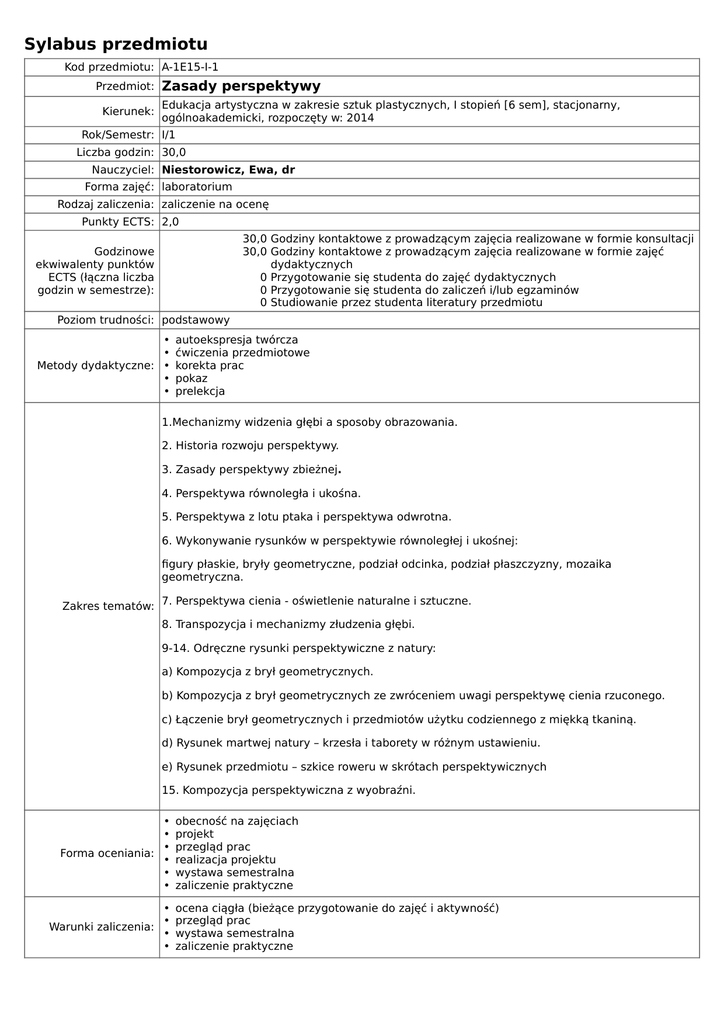 Sylabus przedmiotu Kod przedmiotu: A-1E15-I-1 Przedmiot: Kierunek: Zasady perspektywy Edukacja artystyczna w zakresie sztuk plastycznych, I stopień [6 sem], stacjonarny, ogólnoakademicki, rozpoczęty w: 2014 Rok/Semestr: I/1 Liczba godzin: 30,0 Nauczyciel: Niestorowicz, Ewa, dr Forma zajęć: laboratorium Rodzaj zaliczenia: zaliczenie na ocenę Punkty ECTS: 2,0 30,0 Godziny kontaktowe z prowadzącym zajęcia realizowane w formie konsultacji 30,0 Godziny kontaktowe z prowadzącym zajęcia realizowane w formie zajęć dydaktycznych 0 Przygotowanie się studenta do zajęć dydaktycznych 0 Przygotowanie się studenta do zaliczeń i/lub egzaminów 0 Studiowanie przez studenta literatury przedmiotu Godzinowe ekwiwalenty punktów ECTS (łączna liczba godzin w semestrze): Poziom trudności: podstawowy • • Metody dydaktyczne: • • • autoekspresja twórcza ćwiczenia przedmiotowe korekta prac pokaz prelekcja 1.Mechanizmy widzenia głębi a sposoby obrazowania. 2. Historia rozwoju perspektywy. 3. Zasady perspektywy zbieżnej. 4. Perspektywa równoległa i ukośna. 5. Perspektywa z lotu ptaka i perspektywa odwrotna. 6. Wykonywanie rysunków w perspektywie równoległej i ukośnej: figury płaskie, bryły geometryczne, podział odcinka, podział płaszczyzny, mozaika geometryczna. Zakres tematów: 7. Perspektywa cienia - oświetlenie naturalne i sztuczne. 8. Transpozycja i mechanizmy złudzenia głębi. 9-14. Odręczne rysunki perspektywiczne z natury: a) Kompozycja z brył geometrycznych. b) Kompozycja z brył geometrycznych ze zwróceniem uwagi perspektywę cienia rzuconego. c) Łączenie brył geometrycznych i przedmiotów użytku codziennego z miękką tkaniną. d) Rysunek martwej natury – krzesła i taborety w różnym ustawieniu. e) Rysunek przedmiotu – szkice roweru w skrótach perspektywicznych 15. Kompozycja perspektywiczna z wyobraźni. • • • Forma oceniania: • • • • • Warunki zaliczenia: • • obecność na zajęciach projekt przegląd prac realizacja projektu wystawa semestralna zaliczenie praktyczne ocena ciągła (bieżące przygotowanie do zajęć i aktywność) przegląd prac wystawa semestralna zaliczenie praktyczne Modułowe efekty kształcenia realizowane w ramach przedmiotu: 01W Student, który zaliczył moduł, posiada podstawową wiedzę dotyczącą zasad perspektywy, zna rodzaje perspektywy linearnej 02U potrafi poprawnie tworzyć konstrukcje perspektywiczne i wykorzystać tę wiedzę w rysunku i pracach projektowych 03U posiada umiejętność projektowania, konstruowania i analizowania form zarówno płaskich jak i trójwymiarowych 04U potrafi rysować elementy architektury oraz wnętrz w perspektywie czołowej i bocznej 05U potrafi tworzyć syntetyczne kompozycje plastyczne, w oparciu o poznaną wiedzę 1. 2. 3. 4. Literatura: 5. A. Cole ,Perspektywa ,Wrocław 1994. R. Gill ,Zasadyrysunkurealistycznego, Łódź 1997. J. Parramón , M. Calbo ,Perspektywa w rysunku i w malarstwie, Warszawa 1993. F. Roliński ,Perspektywaodręczna, Warszawa 1962. R. Thomae,Perspektywa i aksonometria, Warszawa 1998.
