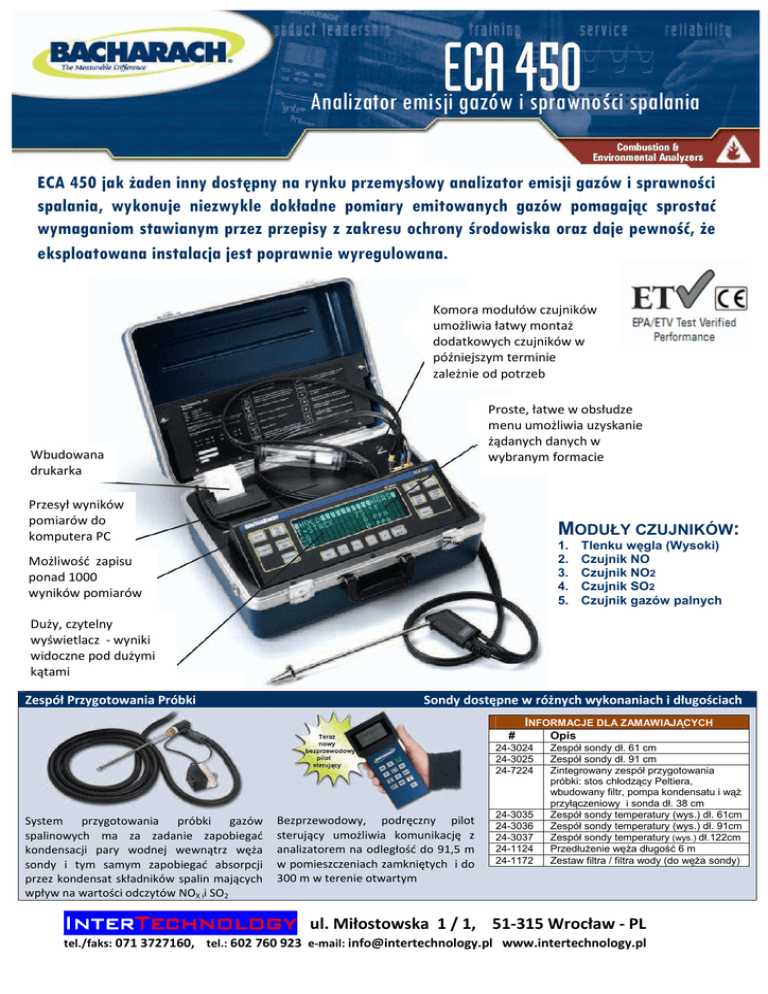 Analizator emisji gazów i sprawności spalania ECA 450 jak żaden inny dostępny na rynku przemysłowy analizator emisji gazów i sprawności spalania, wykonuje niezwykle dokładne pomiary emitowanych gazów pomagając sprostać wymaganiom stawianym przez przepisy z zakresu ochrony środowiska oraz daje pewność, że eksploatowana instalacja jest poprawnie wyregulowana. Komora modułów czujników umożliwia łatwy montaż dodatkowych czujników w późniejszym terminie zależnie od potrzeb Proste, łatwe w obsłudze menu umożliwia uzyskanie żądanych danych w wybranym formacie Wbudowana drukarka Przesył wyników pomiarów do komputera PC MODUŁY CZUJNIKÓW: 1. 2. 3. 4. 5. Możliwość zapisu ponad 1000 wyników pomiarów Tlenku węgla (Wysoki) Czujnik NO Czujnik NO2 Czujnik SO2 Czujnik gazów palnych Duży, czytelny wyświetlacz - wyniki widoczne pod dużymi kątami Zespół Przygotowania Próbki Sondy dostępne w różnych wykonaniach i długościach INFORMACJE DLA ZAMAWIAJĄCYCH # 24-3024 24-3025 24-7224 System przygotowania próbki gazów spalinowych ma za zadanie zapobiegać kondensacji pary wodnej wewnątrz węża sondy i tym samym zapobiegać absorpcji przez kondensat składników spalin mających wpływ na wartości odczytów NOX ii SO2 Bezprzewodowy, podręczny pilot sterujący umożliwia komunikację z analizatorem na odległość do 91,5 m w pomieszczeniach zamkniętych i do 300 m w terenie otwartym InterTechnology InterTechnology 24-3035 24-3036 24-3037 24-1124 24-1172 Opis Zespół sondy dł. 61 cm Zespół sondy dł. 91 cm Zintegrowany zespół przygotowania próbki: stos chłodzący Peltiera, wbudowany filtr, pompa kondensatu i wąŜ przyłączeniowy i sonda dł. 38 cm Zespół sondy temperatury (wys.) dł. 61cm Zespół sondy temperatury (wys.) dł. 91cm Zespół sondy temperatury (wys.) dł.122cm PrzedłuŜenie węŜa długość 6 m Zestaw filtra / filtra wody (do węŜa sondy) ul. Miłostowska 1 / 1, 51-315 Wrocław - PL tel./faks: 071 3727160, tel.: 602 760 923 e-mail: [email protected] www.intertechnology.pl DANE TECHNICZNE Mierzone wielkości i zakresy pomiarowe Tlen Tlenek węgla (z kompensacją dla wodoru) Tlenek węgla (wys. zakres) * Tlenek azotu NO * Dwutlenek azotu NO2 * Dwutlenek siarki SO2 * Gazy palne * Frakcja niedopalona Temperatura spalin Temperatura powietrza Ciśnienie/siła ciągu 0,1 do 20,9 % 0 do 4 000 ppm (z kompensacją dla wodoru) 4001 do 80000 ppm 0 do 3500 ppm 0 do 500 ppm 0 do 4 000 ppm 0 do 5,00% (zaleŜnie od rodzaju) -20 do 1315˚C -20 to 999˚C -703,58 to 703,58 mm H2O Wielkości wyliczane i ich zakresy Efektywność spalania Nadmiar powietrza Dwutlenek węgla (na bazie suchej) NOX (NOx=NO+NO2) NOX odniesione do % O2 CO odniesione do % O2 NO odniesione do % O2 NO2 odniesione do % O2 SOX odniesione do % O2 0.1 do 100.0% 1.0 do 250% ( lambda) 0 do maksimum zaleŜnie od rodzaju wprowadzonego paliwa 0 do 4000 ppm 0 do 17000 ppm 0 do 99999 ppm 0 do 14900 ppm 0 do 2100 ppm 0 do 17000 ppm ZASTOSOWANIE ECA 450 jest idealnym analizatorem dla profesjonalnych zastosowań związanych z analizą efektywności spalania i kontroli emisji spalin w celu sprostania wymaganiom stawianym przez przepisy z zakresu ochrony środowiska. UmoŜliwia on utrzymanie instalacji spalania na najwyŜszym poziomie sprawności oraz bieŜącą, jak i okresową kontrolę przez osoby odpowiedzialne za pomiary poziomu emisji spalin. INFORMACJE DLA ZAMAWIAJĄCYCH # 24-7221 24-7289 24-7223 Dokładność pomiaru Tlen Temperatura gazów spalinowych lub kominowych Temperatura podstawowa/ otoczenia Ciśnienie siły ciągu CO NO NO2 SO2 HC Zdefiniowane paliwa Zasilanie analizatora Pompa i sondy Wymiary analizatora Waga analizatora Gwarancja ± 0.3% O2 od rzeczywistego stęŜenia spalin (± 2°C pomi ędzy 0 a 124°C) (± 3°C pomi ędzy 125 a 249°C) (± 4°C pomi ędzy 250 a 400°C) ± 1°C pomi ędzy 0 a 100°C ± 2% odczytu lub ± 0,5 mm H2O zaleŜnie co wyŜsze ± 5% odczytu lub ± 10 ppm zaleŜnie co wyŜsze dla zakresu 0-2000 ppm CO ± 10% odczytu dla zakresu 2001 do 40000 ppm CO ± 5% odczytu lub ± 5 ppm zaleŜnie co wyŜsze dla zakresu 0-2000 ppm NO ± 5% odczytu lub ± 5 ppm zaleŜnie co wyŜsze dla zakresu 0-500 ppm NO2 ± 5% odczytu lub ± 10 ppm zaleŜnie co wyŜsze dla zakresu 0-2000 ppm SO2 ± 5% dla pełnej skali Gaz ziemny, olej opałowy #2, #4, #5, #6, propan, węgiel, drewno, nafta, wytłoki /biomasa Uniwersalny zasilacz AC i wewnętrzna bateria akumulatorów. Napięcie zasilania zasilacza 100-240V. W pełni naładawane akumulatory zapewniają minimum 8 godzin pracy analizatora. W skład zestawu wchodzą 2 pompki. Jedna dostarcza próbkę gazu do czujników. Druga pompa ma za zadanie dostarczyć świeŜe powietrze celem oczyszczenia niskozakresowego czujnika CO, gdy stęŜenie przekroczy 4000 ppm. W skład zestawu sondy wchodzi, sonda o dł. 30 cm i wąŜ podłączeniowy dł. 4,57m wraz z filtrem wody, filtrem cząstek, ogranicznik zagłębienia sondy. 34,3 cm H x 50 cm W x 23 cm D 11,34 kg 1 rok z moŜliwością przedłuŜenia Twój najbliŜszy Sprzedawca: 24-8400 24-8401 # 24-0788 24-0789 24-0997 24-0881 24-1055 24-1027 24-0998 # 24-3206 24-3207 24-3209 24-3030 24-3028 # 07-1644 24-7059 104-4027 24-0980 Opis Zestaw podstawowy (O2, CO, Ts, Ta, DP) Zestaw podstawowy (O2, CO, Ts, Ta, DP) z bezprzewodowym pilotem sterującym System przygotowania próbki w wykonaniu przemysłowym do pracy w cięŜkich warunkach (po testach EPA/ETV) ze stosem chłodzącym Peltiera z wbudowaną pompą kondensatu, i z układem podgrzewanego węŜa przyłączeniowego dł. 38 cm z sondą i wbudowanym kontrolerem temperatury. Zestaw NOx z czujnikami NO/NOx i kondycjonerem próbkowanych spalin Zestaw NOx i SOx z czujnikami NO, NOx i SO2 oraz kondycjonerem próbkowanych spalin Wymienne czujniki Czujnik O2 Czujnik CO (niski zakres) Czujnik CO (wysoki zakres) Czujnik NO Czujnik gazów palnych Czujnik NO2 Czujnik SO2 (wymagany opcjonalny NO2) Moduły czujników (fabrycznie instalowane w zest