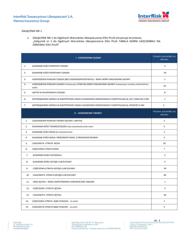 ZAŁĄCZNIK NR 1 1. ZAŁĄCZNIK NR 1 do Ogólnych Warunków Ubezpieczenia EDU PLUS otrzymuje brzmienie. „Załącznik nr 1 do Ogólnych Warunków Ubezpieczenia EDU PLUS TABELA NORM USZCZERBKU NA ZDROWIU EDU PLUS” I. USZKODZENIA GŁOWY Procent uszczerbku na zdrowiu 1. ZŁAMANIE KOŚCI POKRYWY CZASZKI 5 2. ZŁAMANIE KOŚCI PODSTAWY CZASZKI 10 3. USZKODZENIA POWŁOK CZASZKI (BEZ USZKODZEŃ KOSTNYCH) – RANY SKÓRY OWŁOSIONEJ GŁOWY 1 4. USZKODZENIA POWŁOK CZASZKI POWODUJĄCE UTRATAĘ SKÓRY OWŁOSIONEJ GŁOWY WYMAGAJĄCE LECZENIA PRZESZCZEPEM 10 SKÓRY 5. UBYTKI W SKLEPIENIACH CZASZKI 8 6. WSTRZĄSNIENIE MÓZGU W NASTEPSTWIE URAZU CZASZKOWO-MÓZKOWEGO Z HOSPITALIZACJĄ OD 1 DNIA DO 5 DNI 1 7. WSTRZĄSNIENIE MÓZGU W NASTEPSTWIE URAZU CZASZKOWO-MÓZKOWEGO Z HOSPITALIZACJĄ POWYŻEJ 5 DNI 3 II. USZKODZENIA TWARZY Procent uszczerbku na zdrowiu 1. USZKODZENIA POWŁOK TWARZY (BLIZNY I UBYTKI) 2 2. ZŁAMANIA KOŚCI TWARZOCZASZKI POZA ZŁAMANIAMI KOŚCI NOSA 3 3. ZŁAMANIE KOŚCI NOSA BEZ PRZEMIESZCZEŃ 2 4. ZŁAMANIE KOŚCI NOSA I PRZEGRODY NOSA Z PRZEMIESZCZENIEM 3 5. CAŁKOWITA UTRATA NOSA 20 6. CZĘŚCIOWA UTRATA NOSA 7 7. ZŁAMANIA KOŚCI OCZODOŁU 2 8. ZŁAMANIE KOŚCI SZCZĘKI LUB ŻUCHWY 2 9. CZĘŚCIOWA UTRATA SZCZĘKI LUB ŻUCHWY 10 10. CAŁKOWITA UTRATA SZCZĘKI LUB ŻUCHWY 40 11. URAZ JĘZYKA – RANA ZAOPATRZONA CHIRURGICZNIE SZWAMI 1 12. CZĘŚCIOWA UTRATA JĘZYKA 3 13. CAŁKOWITA UTRATA JĘZYKA 30 14. CZĘŚCIOWA UTRATA ZĘBA STAŁEGO - ZA KAŻDY 1 15. CAŁKOWITA UTRATA ZĘBA STAŁEGO - ZA KAŻDY 2 str. 1 III. USZKODZENIA NARZĄDU WZROKU Procent uszczerbku na zdrowiu 1. CAŁKOWITA UTRATA WZROKU W JEDNYM OKU 50 2. CAŁKOWITA UTRATA WZROKU W OBU OCZACH 100 3. USZKODZENIE GAŁKI OCZNEJ SPOWODOWANE POPRZEZ CIAŁA OBCE 5 4. USZKODZENIE GAŁKI OCZNEJ - WSKUTEK URAÓW TĘPYCH, DRĄŻĄCYCH, URAZÓW CHEMICZNYCH, TERMICZNYCH 2 5. ODWARSTWIENIE SIATKÓWKI JEDNEGO OKA W WYNIKU NIESZCZĘŚLIWEGO WYPADKU 15 6. UTRATA GAŁKI OCZNEJ 40 7. USZKODZENIE PRZEWODÓW ŁZOWYCH WYMAGAJĄCE LECZENIA OPERACYJNEGO W JEDNYM OKU 5 8. USZKODZENIE PRZEWODÓW ŁZOWYCH WYMAGAJĄCE LECZENIA OPERACYJNEGO W OBU OCZACH 15 IV. USZKODZENIA MOWY 1. Procent uszczerbku na zdrowiu CAŁKOWITA UTRATA MOWY 100 V. USZKODZENIA NARZĄDU SŁUCHU Procent uszczerbku na zdrowiu 1. UTRATA SŁUCHU W JEDNYM UCHU 30 2. CAŁKOWITA UTRATA SŁUCHU W OBU USZACH 70 3. USZKODZENIA MAŁŻOWINY USZNEJ LUB ZNIEKSZTAŁCENIE (BLIZNY, OPARZENIA, ODMROŻENIA, CZĘŚCIOWA UTRATA) 2 4. CAŁKOWITA UTRATA JEDNEJ MAŁZOWINY USZNEJ 8 5. CAŁKOWITA UTRATA OBU MAŁZOWIN USZNYCH 25 6. USZKODZENIA UCHA ŚRODKOWEGO, UCHA WEWNĘTRZNEGO, BŁONY BĘBENKOWEJ 2 VI. USZKODZENIA SZYI, KRTANI, TCHAWICY I PRZEŁYKU Procent uszczerbku na zdrowiu 1. USZKODZENIE LUB ZWĘŻENIE KRTANI 10 2. USZKODZENIE TCHAWICY - ZWĘŻENIE 2 3. USZKODZENIE PRZEŁYKU LECZONE OPERACYJNIE 7 4. USZKODZENIE TKANEK MIĘKKICH (SKÓRY I MIĘŚNI) SZYI 1 5. USZKODZENIE GARDŁA, 10 VII. USZKODZENIA KLATKI PIERSIOWEJ I JEJ NASTĘPSTWA Procent uszczerbku na zdrowiu 1. CZĘŚCIOWA UTRATA BRODAWKI SUTKOWEJ 1 2. CAŁKOWITA UTRATA BRODAWKI SUTKOWEJ 8 3. CZĘŚCIOWA UTRATA GRUCZOŁU PIERSIOWEGO 5 4. CAŁKOWITA UTRATA GRUCZOŁU PIERSIOWEGO 8 5. ZŁAMANIE ŻEBER - za każde, maksymalnie 10% 1 str. 2 6. ZŁAMANIE MOSTKA 3 7. USZKODZENIE SERCA LUB OSIERDZIA (POURAZOWE, POZAWAŁOWE) leczone wewnątrznaczyniowo (stenty, rozszerzanie) 10 8. POWIERZCHOWNE URAZY KLATKI PIERSIOWEJ (STŁUCZENIA, ZRANIENIA) bez uszkodzeń wymienionych poniżej 1 9. UTRATA CZĘŚCI PŁUCA 15 10. UTRATA CAŁEGO PŁUCA 30 11. KRWIAK OPŁUCNEJ 3 12. USZKODZENIA SERCA WYMAGAJĄCE NAKŁUCIA OSIERDZIA 10 13. USZKODZENIA SERCA LUB OSIERDZIA LECZONE OPERACYJNIE (BY-PASS) 30 VIII. USZKODZENIA BRZUCHA I ICH NASTĘPSTWA Procent uszczerbku na zdrowiu 1. USZKODZENIA POWŁOK JAMY BRZUSZNEJ – blizny nie będące następstwem zabiegów operacyjnych 1 2. USZKODZENIE ŻOŁĄDKA, JELIT, OTRZEWNEJ , KREZKI JELITA 2 3. USZKODZENIE ŻOŁĄDKA, JELIT - stałe odżywianie wyłącznie parenteralne 20 4. UTRATA CZĘŚCI ŻOŁĄDKA, JELITA CIENKIEGO LUB GRUBEGO 10 5. USZKODZENIA ODBYTNICY i ODBYTU 3 6. USZKODZENIA ZWIERACZA ODBYTU 5 7. USZKODZENIA PRZEWODU POKARMOWEGO WYMAGAJĄCE STAŁEGO WYŁONIENIA STOMII 20 8. USZKODZENIE ŚLEDZIONY (np. KRWIAK, PĘKNIĘCIE NARZĄDU) 2 9. USZKODZENIE ŚLEDZIONY (np. KRWIAK, PĘKNIĘCIE NARZĄDU) – LECZONE OPERACYJNIE 5 10. CAŁKOWITA UTRATA ŚLEDZIONY 10 11. USZKODZENIA WĄTROBY, PRZEWODÓW ŻÓŁCIOWYCH LUB TRZUSTKI LUB UTRATA PĘCHERZYKA ŻÓŁCIOWEGO 2 12. UTRATA, FRAGMENTU WĄTROBY LUB FRAGMENTU TRZUSTKI 10 13. CAŁKOWITA UTRATA WĄTROBY 100 14. CAŁKOWITA UTRATA TRZUSTKI 100 IX. USZKODZENIA NARZĄDÓW MOCZOPŁCIOWYCH Procent uszczerbku na zdrowiu 1. CAŁKOWITA UTRATA JEDNEJ NERKI 30 2. CAŁKOWITA UTRATA OBU NEREK 100 3. USZKODZENIE NERKI 2 4. USZKODZENIE NERKI LECZONE OPERACYJNIE 5 5. CZEŚCIOWA UTRATA NERKI 15 6. USZKODZENIE MOCZOWODU LECZONE OPERACYJNIE, 15 7. USZKODZENIE MOCZOWODU LECZONE ENDOSKOPOWO 5 8. USZKODZENIE CEWKI MOCZOWEJ 5 str. 3 9. CAŁKOWITA UTRATA PRĄCIA 30 10. CZĘŚCIOWA UTRATA PRĄCIA 10 11. CAŁKOWITA UTRATA JEDNEGO JĄDRA LUB JAJNIKA 10 12. CAŁKOWITA UTRATA OBU JĄDER LUB JAJNIKÓW 30 13. CZĘŚCIOWA UTRATA JAJNIKA LUB JĄDRA 10 14. USZKODZENIE JĄDRA LUB JAJNIKA – LECZONE OPERACYJNIE 5 15. USZKODZENIE JĄDRA LUB JAJNIKA – WODNIAK, KRWIAK, PĘKNIĘCIE NARZĄDU 2 16. CAŁKOWITA UTRATA MACICY 40 17. USZKODZENIE ZEWNĘTRZNYCH NARZĄDÓW PŁCIOWYCH LUB OKOLICY KROCZA 3 18. USZKODZENIE ZEWNĘTRZNYCH NARZĄDÓW PŁCIOWYCH LUB OKOLICY KROCZA (USZKODZENIA SKÓRY, MIĘŚNI LUB POWIĘZI) WYMAGAJĄCE LECZENIA OPERACYJNEGO 5 19. USZKODZENIE MACICY 10 X. USZKODZENIA KRĘGOSŁUPA Procent uszczerbku na zdrowiu 1. USZKODZENIA KRĘGOSŁUPA - SKRĘCENIE, ZWICHNIĘCIE 2 2. ZŁAMANIA TRZONÓW KRĘGÓW I ŁUKÓW KRĘGÓW - za każdy 5 3. ZŁAMANIA TRZONÓW KRĘGÓW I ŁUKÓW KRĘGÓW – LECZONE OPERACYJNIE - za każdy 7 4. ZŁAMANIA WYROSTKÓW POPRZECZNYCH, KOLCZYSTYCH – ZA KAŻDY 1 XI. USZKODZENIA MI