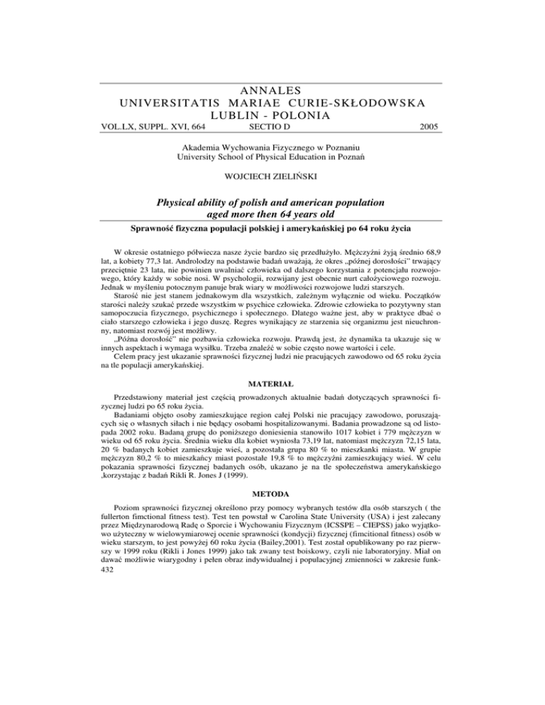 ANNALES UNIVERSITATIS MARIAE CURIE-SKŁODOWSKA LUBLIN - POLONIA VOL.LX, SUPPL. XVI, 664 SECTIO D 2005 Akademia Wychowania Fizycznego w Poznaniu University School of Physical Education in Poznań WOJCIECH ZIELIŃSKI Physical ability of polish and american population aged more then 64 years old Sprawność fizyczna populacji polskiej i amerykańskiej po 64 roku życia W okresie ostatniego półwiecza nasze życie bardzo się przedłużyło. Mężczyźni żyją średnio 68,9 lat, a kobiety 77,3 lat. Androlodzy na podstawie badań uważają, że okres „późnej dorosłości” trwający przeciętnie 23 lata, nie powinien uwalniać człowieka od dalszego korzystania z potencjału rozwojowego, który każdy w sobie nosi. W psychologii, rozwijany jest obecnie nurt całożyciowego rozwoju. Jednak w myśleniu potocznym panuje brak wiary w możliwości rozwojowe ludzi starszych. Starość nie jest stanem jednakowym dla wszystkich, zależnym wyłącznie od wieku. Początków starości należy szukać przede wszystkim w psychice człowieka. Zdrowie człowieka to pozytywny stan samopoczucia fizycznego, psychicznego i społecznego. Dlatego ważne jest, aby w praktyce dbać o ciało starszego człowieka i jego duszę. Regres wynikający ze starzenia się organizmu jest nieuchronny, natomiast rozwój jest możliwy. „Późna dorosłość” nie pozbawia człowieka rozwoju. Prawdą jest, że dynamika ta ukazuje się w innych aspektach i wymaga wysiłku. Trzeba znaleźć w sobie często nowe wartości i cele. Celem pracy jest ukazanie sprawności fizycznej ludzi nie pracujących zawodowo od 65 roku życia na tle populacji amerykańskiej. MATERIAŁ Przedstawiony materiał jest częścią prowadzonych aktualnie badań dotyczących sprawności fizycznej ludzi po 65 roku życia. Badaniami objęto osoby zamieszkujące region całej Polski nie pracujący zawodowo, poruszających się o własnych siłach i nie będący osobami hospitalizowanymi. Badania prowadzone są od listopada 2002 roku. Badaną grupę do poniższego doniesienia stanowiło 1017 kobiet i 779 mężczyzn w wieku od 65 roku życia. Średnia wieku dla kobiet wyniosła 73,19 lat, natomiast mężczyzn 72,15 lata, 20 % badanych kobiet zamieszkuje wieś, a pozostała grupa 80 % to mieszkanki miasta. W grupie mężczyzn 80,2 % to mieszkańcy miast pozostałe 19,8 % to mężczyźni zamieszkujący wieś. W celu pokazania sprawności fizycznej badanych osób, ukazano je na tle społeczeństwa amerykańskiego ,korzystając z badań Rikli R. Jones J (1999). METODA Poziom sprawności fizycznej określono przy pomocy wybranych testów dla osób starszych ( the fullerton fimctional fitness test). Test ten powstał w Carolina State University (USA) i jest zalecany przez Międzynarodową Radę o Sporcie i Wychowaniu Fizycznym (ICSSPE – CIEPSS) jako wyjątkowo użyteczny w wielowymiarowej ocenie sprawności (kondycji) fizycznej (fimcitional fitness) osób w wieku starszym, to jest powyżej 60 roku życia (Bailey,2001). Test został opublikowany po raz pierwszy w 1999 roku (Rikli i Jones 1999) jako tak zwany test boiskowy, czyli nie laboratoryjny. Miał on dawać możliwie wiarygodny i pełen obraz indywidualnej i populacyjnej zmienności w zakresie funk432 cjonalnych możliwości osób w starszym wieku. Zastosowane próby odzwierciedlają życie codzienne. W pracy zastosowano następujące elementy testu (wg Rikli i Jones ): • Usiądź na krześle i dosięgnij (Chair Sit and Reach Test). Celem testu była ocena gibkości dolnej części ciała (przede wszystkim- ścięgien podkolanowych). • Wstań i idź (8' Up and Go). Ocena zwinności ( dynamicznej równowagi ). • Wstawanie z krzesła w ciągu 30 sekund (30-second Chair Stand).Ocena siły dolnej części ciała. • Dwu minutowy marsz w miejscu (2 minute Step – in Place Test) Ocena wytrzymałości (tlenowej). WYNIKI Zgromadzony materiał podzielono podobnie jak w badaniach amerykańskich na 6 grup wieku po 5 lat. W wszystkich analizowanych przedziałach wieku w teście gibkości uzyskane wyniki przez kobiety i mężczyzn z Polski są znacznie gorsze od rówieśników amerykańskich. Jedynie w grupie najstarszych mężczyzn w obu krajach odnotowano podobne rezultaty. W kolejnych dwóch testach w ocenie zwinności i wytrzymałości badani obywatele polski uzyskali wyniki znacznie słabsze we wszystkich przedziałach wieku. W ocenie siły dolnej części ciała uzyskane rezultaty są również korzystne dla kobiet i mężczyzn z Ameryki, choć różnice te są mniejsze. Największe podobieństwo wyników zaobserwowano w grupie najstarszych mężczyzn w testach gibkości i siły dolnej części ciała. Graficzny obraz omawianych wyników przedstawia Ryc. 1 i 2. Ryc.1. Wyniki testów sprawności fizycznej kobiet polskich i amerykańskich 433 Ryc.2. Wyniki testów sprawności fizycznej mężczyzn polskich i amerykańskich OMÓWIENIE Określenie poziomu sprawności fizycznej ludzi starych wydaje się bardzo ważne, chociażby z faktu stale starzejącego się społeczeństwa. Znalezienie odpowiednich narzędzi określających poziom sprawności fizycznej odzwierciedlających życie codzienne i czynności dni powszednich pozwoli na kontrolę i określenie stanu faktycznego sprawności fizycznej ludzi starych. Takimi testami określającymi omawianą sprawność są testy zaproponowane przez Rikli R., Jones J. z Uniwersytetu w Californi. Oceniają te wszystkie fizjologiczne właściwości, które wspierają i są konieczne do utrzymania niezależności i bezpiecznej codziennej aktywności (wydolność tlenowa, gibkość, siła, zwinność, dynamiczna równowaga). Przedstawione wyniki badań są jedną z pierwszych prób odpowiedzi na pytanie : Jaką sprawnością charakteryzuje się polskie społeczeństwo? Dotychczas badania polskie dotyczące sprawności fizycznej ludzi starych, ograniczały się do badań ankietowych, kwestionariuszy wywiadu itp. Badane osoby deklarowały poziom aktywności fizycznej i o