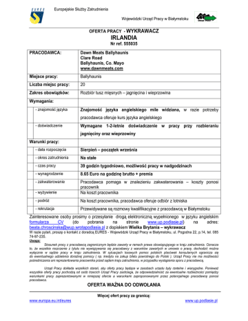 Europejskie SłuŜby Zatrudnienia Wojewódzki Urząd Pracy w Białymstoku OFERTA PRACY - WYKRAWACZ IRLANDIA Nr ref. 555035 PRACODAWCA: Dawn Meats Ballyhaunis Clare Road Ballyhaunis, Co. Mayo www.dawnmeats.com Miejsce pracy: Ballyhaunis Liczba miejsc pracy: 20 Zakres obowiązków: Rozbiór tusz mięsnych – jagnięcina i wieprzowina Wymagania: - znajomość języka Znajomość języka angielskiego mile widziana, w razie potrzeby pracodawca oferuje kurs języka angielskiego - doświadczenie Wymagane 1-2-letnie doświadczenie w pracy przy rozbieraniu jagnięciny oraz wieprzowiny Warunki pracy: - data rozpoczęcia Sierpień – początek września - okres zatrudnienia Na stałe - czas pracy 39 godzin tygodniowo, moŜliwość pracy w nadgodzinach - wynagrodzenie 8.65 Euro na godzinę brutto + premia - zakwaterowanie - wyŜywienie Pracodawca pomaga w znalezieniu zakwaterowania – koszty ponosi pracownik Na koszt pracownika - podróŜ Na koszt pracownika, pracodawca oferuje odbiór z lotniska - rekrutacja Przewidywane są rozmowy kwalifikacyjne z pracodawcą w Białymstoku Zainteresowane osoby prosimy o przesyłanie drogą elektroniczną wypełnionego w języku angielskim formularza CV (do pobrania na stronie www.up.podlasie.pl) na adres: [email protected] z dopiskiem Wielka Brytania – wykrawacz W razie pytań, proszę o kontakt z doradcą EURES - Wojewódzki Urząd Pracy w Białymstoku, ul. Pogodna 22, p.14, tel. 085 74-97-235. Uwaga: Stosunek pracy z pracodawcą zagranicznym będzie zawarty w ramach prawa obowiązującego w kraju zatrudnienia. Oznacza to, Ŝe wszelkie roszczenie z tytułu nie wywiązywania się pracodawcy z warunków zawartych w umowie o pracę, dochodzić moŜna wyłącznie w sądzie pracy w kraju zatrudnienia. W sytuacjach losowych pomoc polskich placówek konsularnych ogranicza się do ewentualnego udzielenia doraźnej pomocy ( np. kredytu na zakup biletu powrotnego do Polski ). Urząd Pracy nie ma moŜliwości pośredniczenia ani reprezentowania pracownika przed sądem kraju zatrudnienia, w przypadku wystąpienia sporu z pracodawcą. Urząd Pracy dokłada wszelkich starań, aby oferty pracy będące w zasobach urzędu były rzetelne i wiarygodne. PoniewaŜ wszystkie oferty pracy pochodzą od osób trzecich Urząd Pracy zastrzega, Ŝe odpowiedzialność za ewentualne rozbieŜności pomiędzy warunkami pracy zaprezentowanymi w niniejszej ofercie a warunkami zaproponowanymi przez potencjalnego pracodawcę ponosi pracodawca. OFERTA WAśNA DO ODWOŁANIA Więcej ofert pracy za granicą: www.europa.eu.int/eures www.up.podlasie.pl