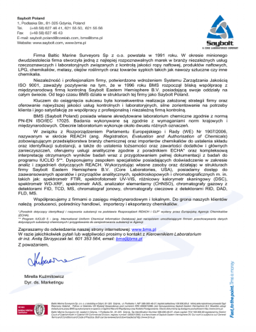 Firma Baltic Marine Surveyors Sp z o.o. powstała w 1991 roku. W okresie minionego dwudziestolecia firma stworzyła jedną z najlepiej rozpoznawalnych marek w branży niezależnych usług rzeczoznawczych i laboratoryjnych związanych z kontrolą jakości ropy naftowej, produktów naftowych, LPG, chemikaliów, melasy, olejów roślinnych oraz towarów sypkich takich jak nawozy sztuczne czy inne chemikalia. Niezależność i profesjonalizm firmy, potwierdzone wdrożeniem Systemu Zarządzania Jakością ISO 9001, zaważyły pozytywnie na tym, że w 1996 roku BMS rozpoczął bliską współpracę z międzynarodową firmą kontrolną Saybolt Eastern Hemisphere B.V. posiadającą swoje oddziały na całym świecie. Od tego czasu BMS działa w strukturach tej firmy jako Saybolt Poland. Kluczem do osiągnięcia sukcesu była konsekwentna realizacja założonej strategii firmy oraz oferowanie najwyższej jakości usług kontrolnych i laboratoryjnych, silne zorientowanie na potrzeby klienta i jego satysfakcję ze współpracy z profesjonalną i niezależną firmą kontrolną. BMS (Saybolt Poland) posiada własne akredytowane laboratorium chemiczne zgodnie z normą PN-EN ISO/IEC 17025. Badania wykonywane są zgodnie z wymaganiami norm krajowych i międzynarodowych. Obecnie laboratorium wykonuje około dwustu różnych oznaczeń. W związku z Rozporządzeniem Parlamentu Europejskiego i Rady (WE) Nr 1907/2006, nazywanym w skrócie REACH (ang. Registration, Evaluation and Authorisation of Chemicals) zobowiązującym przedsiębiorstwa branży chemicznej oraz importerów chemikaliów do ustalenia składu oraz identyfikacji substancji, a także do ustalenia tożsamości oraz zawartości dodatków i głównych zanieczyszczeń, oferujemy usługi analityczne zgodnie z poradnikiem ECHA* oraz kompleksową interpretację otrzymanych wyników badań wraz z przygotowaniem pełnej dokumentacji z badań do programu IUCLID 5**. Dysponujemy zespołem specjalistów posiadających doświadczenie w zakresie analiz i zagadnień dotyczących REACH. Wykorzystując własne zasoby oraz działając w strukturach firmy Saybolt Eastern Hemisphere B.V. (Core Laboratories, USA), posiadamy dostęp do zaawansowanych aparatów i przyrządów analitycznych, spektroskopowych i chromatograficznych m. in. takich jak: spektrometr FTIR, spektrofotometr UV-VIS, różnicowy kalorymetr skaningowy (DSC), spektrometr WD-XRF, spektrometr AAS, analizator elementarny (CHNSO), chromatografy gazowy z detektorami FID, TCD, MS, chromatograf jonowy, chromatografy cieczowe z detektorami RID, DAD, FLD, MS. Współpracujemy z firmami o zasięgu międzynarodowym i lokalnym. Do grona naszych klientów należą producenci, pośrednicy handlowi, importerzy i eksporterzy chemikaliów. *„Poradnik dotyczący identyfikacji i nazywania substancji na podstawie Rozporządzeń REACH i CLP” wydany przez Europejską Agencje Chemikaliów (ECHA). ** Program IUCLID 5 - (ang. International Uniform Chemical Information Database) jest narzędziem umożliwiającym firmom przechowywanie danych dotyczących substancji chemicznych i przygotowanie do zarejestrowania substancji w Agencji. Zapraszamy do odwiedzenia naszej strony internetowej: www.bms.pl W razie jakichkolwiek pytań lub wątpliwości prosimy o kontakt z Kierownikiem Laboratorium dr inż. Anitą Skrzypczak tel. 601 353 564, email: [email protected] Z poważaniem, Mirella Kuźmitowicz Dyr. ds. Marketingu