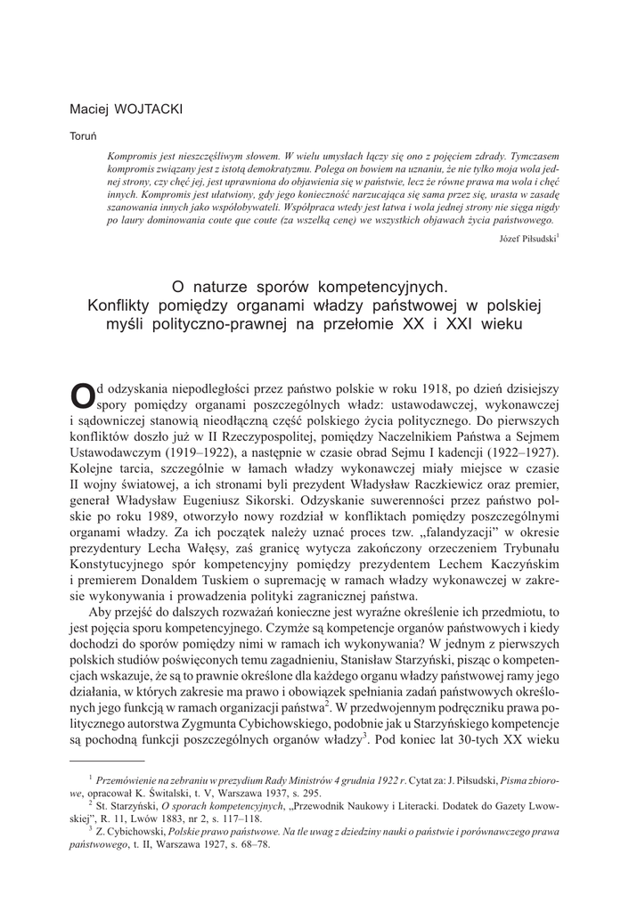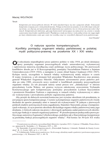 Maciej WOJTACKI Toruñ Kompromis jest nieszczêœliwym s³owem. W wielu umys³ach ³¹czy siê ono z pojêciem zdrady. Tymczasem kompromis zwi¹zany jest z istot¹ demokratyzmu. Polega on bowiem na uznaniu, ¿e nie tylko moja wola jednej strony, czy chêæ jej, jest uprawniona do objawienia siê w pañstwie, lecz ¿e równe prawa ma wola i chêæ innych. Kompromis jest u³atwiony, gdy jego koniecznoœæ narzucaj¹ca siê sama przez siê, urasta w zasadê szanowania innych jako wspó³obywateli. Wspó³praca wtedy jest ³atwa i wola jednej strony nie siêga nigdy po laury dominowania coute que coute (za wszelk¹ cenê) we wszystkich objawach ¿ycia pañstwowego. Józef Pi³sudski1 O naturze sporów kompetencyjnych. Konflikty pomiêdzy organami w³adzy pañstwowej w polskiej myœli polityczno-prawnej na prze³omie XX i XXI wieku O d odzyskania niepodleg³oœci przez pañstwo polskie w roku 1918, po dzieñ dzisiejszy spory pomiêdzy organami poszczególnych w³adz: ustawodawczej, wykonawczej i s¹downiczej stanowi¹ nieod³¹czn¹ czêœæ polskiego ¿ycia politycznego. Do pierwszych konfliktów dosz³o ju¿ w II Rzeczypospolitej, pomiêdzy Naczelnikiem Pañstwa a Sejmem Ustawodawczym (1919–1922), a nastêpnie w czasie obrad Sejmu I kadencji (1922–1927). Kolejne tarcia, szczególnie w ³amach w³adzy wykonawczej mia³y miejsce w czasie II wojny œwiatowej, a ich stronami byli prezydent W³adys³aw Raczkiewicz oraz premier, genera³ W³adys³aw Eugeniusz Sikorski. Odzyskanie suwerennoœci przez pañstwo polskie po roku 1989, otworzy³o nowy rozdzia³ w konfliktach pomiêdzy poszczególnymi organami w³adzy. Za ich pocz¹tek nale¿y uznaæ proces tzw. „falandyzacji” w okresie prezydentury Lecha Wa³êsy, zaœ granicê wytycza zakoñczony orzeczeniem Trybuna³u Konstytucyjnego spór kompetencyjny pomiêdzy prezydentem Lechem Kaczyñskim i premierem Donaldem Tuskiem o supremacjê w ramach w³adzy wykonawczej w zakresie wykonywania i prowadzenia polityki zagranicznej pañstwa. Aby przejœæ do dalszych rozwa¿añ konieczne jest wyraŸne okreœlenie ich przedmiotu, to jest pojêcia sporu kompetencyjnego. Czym¿e s¹ kompetencje organów pañstwowych i kiedy dochodzi do sporów pomiêdzy nimi w ramach ich wykonywania? W jednym z pierwszych polskich studiów poœwiêconych temu zagadnieniu, Stanis³aw Starzyñski, pisz¹c o kompetencjach wskazuje, ¿e s¹ to prawnie okreœlone dla ka¿dego organu w³adzy pañstwowej ramy jego dzia³ania, w których zakresie ma prawo i obowi¹zek spe³niania zadañ pañstwowych okreœlonych jego funkcj¹ w ramach organizacji pañstwa2. W przedwojennym podrêczniku prawa politycznego autorstwa Zygmunta Cybichowskiego, podobnie jak u Starzyñskiego kompetencje s¹ pochodn¹ funkcji poszczególnych organów w³adzy3. Pod koniec lat 30-tych XX wieku 1 Przemówienie na zebraniu w prezydium Rady Ministrów 4 grudnia 1922 r. Cytat za: J. Pi³sudski, Pisma zbiorowe, opracowa³ K. Œwitalski, t. V, Warszawa 1937, s. 295. 2 St. Starzyñski, O sporach kompetencyjnych, „Przewodnik Naukowy i Literacki. Dodatek do Gazety Lwowskiej”, R. 11, Lwów 1883, nr 2, s. 117–118. 3 Z. Cybichowski, Polskie prawo pañstwowe. Na tle uwag z dziedziny nauki o pañstwie i porównawczego prawa pañstwowego, t. II, Warszawa 1927, s. 68–78. 156 Maciej WOJTACKI PP 2 ’12 Wac³aw Komarnicki w syntetycznym wyk³adzie ewolucji ustroju politycznego II Rzeczypospolitej dzieli³ kompetencje na ogólne i nadzwyczajne. W pierwsze wyposa¿one by³y wszystkie organy w³adzy pañstwowej w ramach funkcji zastrze¿onych dla nich w konstytucji. Za kompetencje nadzwyczajne uznane zosta³y natomiast uprawnienia przys³uguj¹ce Prezydentowi w okresie wojny4. Co nale¿y zatem rozumieæ pod pojêciem sporu kompetencyjnego? W art. 53 ust. 1 ustawy o Trybunale Konstytucyjnym ustawodawca wyraŸnie wskazuje, ¿e Trybuna³ rozstrzyga spory kompetencyjne, gdy dwa lub wiêcej centralne konstytucyjne organy pañstwa uzna³y siê za w³aœciwe do rozstrzygniêcia tej samej sprawy lub wyda³y w niej rozstrzygniêcie (spór kompetencyjny pozytywny) albo gdy organy te uzna³y siê za niew³aœciwe do rozstrzygniêcia okreœlonej sprawy (spór kompetencyjny negatywny)5. Podobnie genezê sporów kompetencyjnych widzia³ Starzyñski, dla którego by³y one pochodn¹ sytuacji, w których jeden z organów pañstwowych, w ramach podejmowanych przez siebie dzia³añ wkracza³ w sferê uprawnieñ innego organu6. Opieraj¹c siê na powy¿szych definicjach, mo¿emy przyj¹æ, ¿e za spór kompetencyjny uznajemy stan konfliktu pomiêdzy organami pañstwa, wywo³any wykonywaniem lub domniemaniem przez jeden z nich uprawnieñ przynale¿nych drugiemu z nich. Co w odniesieniu do powy¿szego pojêcia autor rozumie pod stwierdzeniem: natura sporów kompetencyjnych, u¿ytym w tytule artyku³u? Wydaje siê, ¿e pojêciem tym nale¿y okreœliæ zespó³ czynników tak obiektywnych, jak i subiektywnych wp³ywaj¹cych na powstawanie napiêæ w ramach w³adz ustawodawczych, wykonawczych i s¹downiczych oraz podejmowane równolegle próby regulacji prawnych maj¹cych na celu rozwi¹zanie pojawiaj¹cych siê konfliktów. Do uwarunkowañ obiektywnych autor zalicza przede wszystkim obowi¹zuj¹ce ustawodawstwo, czyli w pierwszym rzêdzie kolejne konstytucje reguluj¹ce stosunki pomiêdzy w³adzami. Poza tym, patrz¹c na genezê sporu kompetencyjnego pomiêdzy Prezydentem Lechem Kaczyñskim i premierem Donaldem Tuskiem do czynników obiektywnych, nale¿y zaliczyæ równie¿ wp³ywaj¹ce na funkcjonowanie i ewolucjê polskiego systemu politycznego akty prawa miêdzynarodowego, w tym wypadku unijne prawo pierwotne. Czynnikami subiektywnymi, w ocenie autora by³y i s¹ polityczne uwarunkowania sporów pomiêdzy poszczególnymi organami w³adzy wykonawczej i ustawodawczej, które stanowi³y w omawianym okresie g³ówne Ÿród³o powstawania napiêæ, szczególnie w ramach legislatywy i egzekutywy. G³ównym celem niniejszego artyku³u jest przed