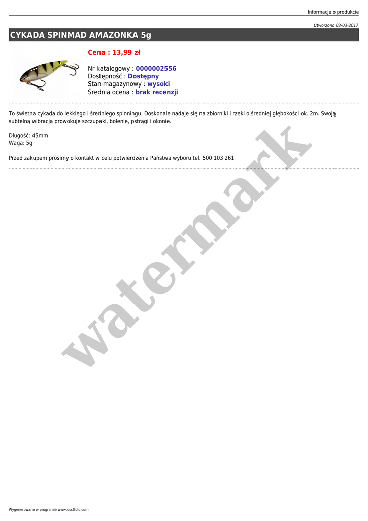 Informacje o produkcie Utworzono 03-03-2017 CYKADA SPINMAD AMAZONKA 5g Cena : 13,99 zł Nr katalogowy : 0000002556 Dostępność : Dostępny Stan magazynowy : wysoki Średnia ocena : brak recenzji To świetna cykada do lekkiego i średniego spinningu. Doskonale nadaje się na zbiorniki i rzeki o średniej głębokości ok. 2m. Swoją subtelną wibracją prowokuje szczupaki, bolenie, pstrągi i okonie. er m ar k Długość: 45mm Waga: 5g w at Przed zakupem prosimy o kontakt w celu potwierdzenia Państwa wyboru tel. 500 103 261 Wygenerowano w programie www.oscGold.com