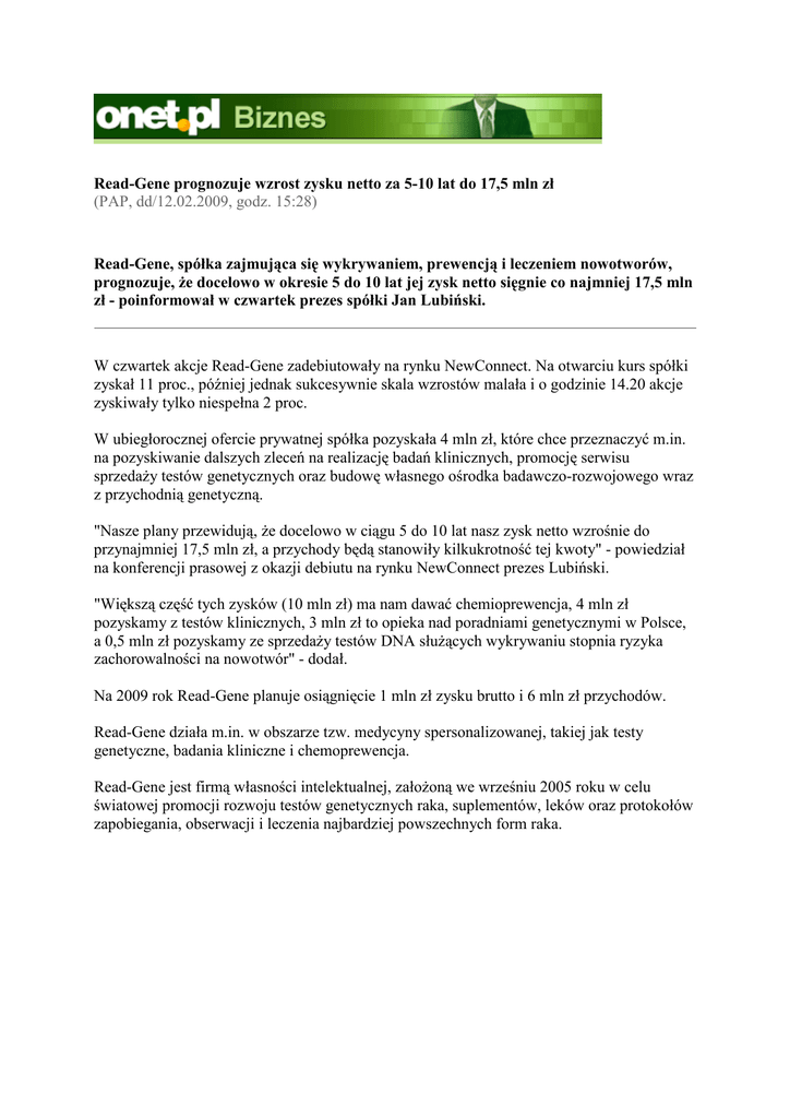 Onet.pl Biznes - Read-Gene prognozuje wzorst zysku netto za 5