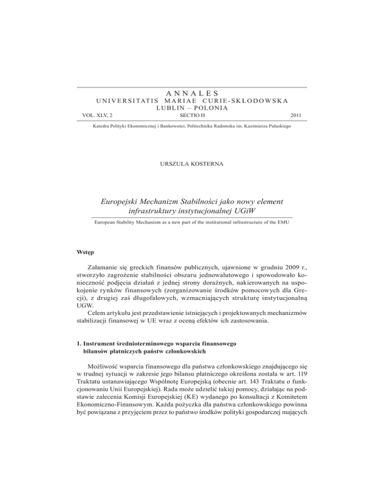 ANNALES U N I V E R S I TAT I S M A R I A E C U R I E - S K à O D O W S K A L UB L IN – POL ON IA VOL. XLV, 2 SECTIO H 2011 Katedra Polityki Ekonomicznej i BankowoĞci, Politechnika Radomska im. Kazimierza Puáaskiego URSZULA KOSTERNA Europejski Mechanizm StabilnoĞci jako nowy element infrastruktury.. instytucjonalnej UGiW European Stability Mechanism as a new part of the institutional infrastructure of the EMU WstĊp Zaáamanie siĊ greckich finansów publicznych, ujawnione w grudniu 2009 r., stworzyáo zagroĪenie stabilnoĞci obszaru jednowalutowego i spowodowaáo koniecznoĞü podjĊcia dziaáaĔ z jednej strony doraĨnych, nakierowanych na uspokojenie rynków finansowych (zorganizowanie Ğrodków pomocowych dla Grecji), z drugiej zaĞ dáugofalowych, wzmacniających strukturĊ instytucjonalną UGW. Celem artykuáu jest przedstawienie istniejących i projektowanych mechanizmów stabilizacji finansowej w UE wraz z oceną efektów ich zastosowania. 1. Instrument Ğrednioterminowego wsparcia finansowego bilansów páatniczych paĔstw czáonkowskich MoĪliwoĞü wsparcia finansowego dla paĔstwa czáonkowskiego znajdującego siĊ w trudnej sytuacji w zakresie jego bilansu páatniczego okreĞlona zostaáa w art. 119 Traktatu ustanawiającego WspólnotĊ Europejską (obecnie art. 143 Traktatu o funkcjonowaniu Unii Europejskiej). Rada moĪe udzieliü takiej pomocy, dziaáając na podstawie zalecenia Komisji Europejskiej (KE) wydanego po konsultacji z Komitetem Ekonomiczno-Finansowym. KaĪda poĪyczka dla paĔstwa czáonkowskiego powinna byü powiązana z przyjĊciem przez to paĔstwo Ğrodków polityki gospodarczej mających 18 URSZULA KOSTERNA przywróciü lub zapewniü trwaáą sytuacjĊ w zakresie bilansu páatniczego. OkreĞlenie instrumentarium pomocy znalazáo siĊ w rozporządzeniu Rady (EWG) nr 1969/88 ustanawiającym jednolity instrument Ğrednioterminowego wsparcia finansowego bilansów páatniczych paĔstw czáonkowskich. Wraz z wejĞciem w Īycie idei wspólnej waluty, od 1 stycznia 1999 r. wiĊkszoĞü paĔstw czáonkowskich przestaáa byü uprawniona do korzystania z takiej pomocy. Jednak ze wzglĊdu na potencjalne potrzeby tych paĔstw, które nie przyjĊáy euro, a takĪe potrzeby przyszáych nowych paĔstw czáonkowskich, dopóki nie przyjmą wspólnej waluty, rozporządzeniem Rady (WE) nr 332/2002 okreĞlono sposób funkcjonowania zmodyfikowanego instrumentarium pomocowego. Górny limit áącznie udostĊpnionych Ğrodków obniĪono z 16 mld € do 12 mld €. W celu sfinansowania poĪyczek KE zostaáa upowaĪniona do zaciągania w imieniu Wspólnoty poĪyczek i kredytów na rynkach kapitaáowych lub od instytucji finansowych. Pod wpáywem ogólnoĞwiatowego kryzysu finansowego górny limit áącznej wartoĞci poĪyczek podniesiono w grudniu 2008 r. do 25 mld €, a nastĊpnie, w maju 2009 r., do 50 mld €. Uruchamianie instrumentu w praktyce ostatnich lat odbywaáo siĊ przy wspóáudziale MFW, innych instytucji miĊdzynarodowych oraz paĔstw. I tak na pakiet pomocowy dla WĊgier, uzgodniony w listopadzie 2008 r., w kwocie 20 mld €, skáadaáy siĊ Ğrodki UE (6,5 mld €), MFW (12,5 mld €) oraz Banku ĝwiatowego (1 mld €). Wsparcie dla àotwy, w kwocie 7,5 mld €, uzgodnione w grudniu 2008 r., obejmowaáo udziaá UE (3,1 mld €), MFW (1,7 mld €), paĔstw nordyckich (1,9 mld €), Banku ĝwiatowego (0,4 mld €), EBOiR, Czech i Polski (0,4 mld €). Wreszcie pakiet dla Rumunii, z maja 2009 r., w kwocie 20 mld €, skáadaá siĊ ze Ğrodków UE (5 mld €), MFW (13 mld €), Banku ĝwiatowego (1 mld €) oraz EBI i EBOiR (1 mld €). 2. Pomoc finansowa dla Grecji Od grudnia 2009 r., kiedy nowy premier Grecji ujawniá rzeczywisty stan finansów publicznych paĔstwa, pogarszaáy siĊ warunki rynkowego finansowania dáugu greckiego. Narastanie obaw przed zaistnieniem niewypáacalnoĞci Grecji spowodowaáo, Īe juĪ w lutym 2010 r. przywódcy UE uzgodnili koniecznoĞü podjĊcia „zdecydowanych i skoordynowanych” dziaáaĔ pomocowych. 23 kwietnia rząd Grecji zwróciá siĊ z oficjalną proĞbą o uruchomienie pomocy finansowej. W ciągu weekendu 1-2 maja 2010 r. zakoĔczone zostaáy negocjacje Grecji w sprawie pomocy finansowej. Na posiedzeniu ministrów finansów strefy euro w Brukseli zapadáa decyzja o przyznaniu 110 mld € do 2012 r. Czáonkowie strefy euro zobowiązali siĊ zapewniü 80 mld €1, w tym 30 mld € w 2010 r., 30 mld € ma udostĊpniü MFW. 1 Udziaá poszczególnych paĔstw w pomocy dla Grecji okreĞlono proporcjonalnie do udziaáu w kapitale EBC. EUROPEJSKI MECHANIZM STABILNOĝCI JAKO NOWY ELEMENT INFRASTRUKTURY... 19 Grecki plan, zaakceptowany przez EBC i MFW, zakáadaá oszczĊdnoĞci budĪetowe w wysokoĞci 34,5 mld € w ciągu trzech lat oraz spadek deficytu budĪetowego w 2010 r. do 8,1% PKB. Zgodnie z planem, dáug publiczny Grecji miaá osiągnąü 149% PKB w 2013 r. i zacząü obniĪaü siĊ od roku 2014. Dotychczasowo udostĊpnione Ğrodki finansowe dla Grecji ujĊto w tabeli 1. Tabela 1. Wypáaty z pakietu pomocowego dla Grecji (mld €) PaĔstwa strefy euro MFW Razem maj 2010 14,5 5,5 20,0 wrzesieĔ 2010 6,5 2,5 9,0 grudzieĔ 2010/styczeĔ 2011 6,5 2,5 9,0 marzec 2011 10,9 4,1 15,0 ħródáo: http://ec.europa.eu/economy_finance/eu_borrower/greek_loan_facility/index_en.htm Wypáaty z pakietu pomocowego miaáy pokryü potrzeby finansowania deficytu budĪetowego i obsáugi dáugu publicznego do koĔca 2011 r. Oczekiwano, Īe Grecja stopniowo powróci do rynkowego finansowania swych potrzeb poĪyczkowych w 2012 r. Jednak pakiet nie przyniósá oczekiwanych efektów – po roku od jego uruchomienia, 13 czerwca 2011 r. Standard & Poor’s obniĪyá rating Grecji z B do CCC, wskazując na „znaczny wzrost prawdopodobieĔstwa”, Īe kraj ten utraci zdolnoĞü spáacania przynajmniej czĊĞci dáugów. PaĔstwo wciąĪ pogrąĪone jest w gáĊbokim kryzysie. Szacuje siĊ, Īe zadáuĪenie Grecji w latach 2012-2014 osiągnie 170% PK