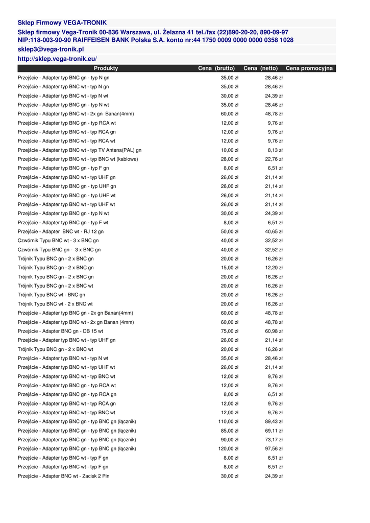 Sklep Firmowy VEGA-TRONIK Sklep firmowy Vega-Tronik 00-836 Warszawa, ul. Żelazna 41 tel./fax (22)890-20-20, 890-09-97 NIP:118-003-90-90 RAIFFEISEN BANK Polska S.A. konto nr:44 1750 0009 0000 0000 0358 1028 [email protected] http://sklep.vega-tronik.eu/ Produkty Cena (brutto) Cena (netto) Przejście - Adapter typ BNC gn - typ N gn 35,00 zł 28,46 zł Przejście - Adapter typ BNC wt - typ N gn 35,00 zł 28,46 zł Przejście - Adapter typ BNC wt - typ N wt 30,00 zł 24,39 zł Przejście - Adapter typ BNC gn - typ N wt 35,00 zł 28,46 zł Przejście - Adapter typ BNC wt - 2x gn Banan(4mm) 60,00 zł 48,78 zł Przejście - Adapter typ BNC gn - typ RCA wt 12,00 zł 9,76 zł Przejście - Adapter typ BNC wt - typ RCA gn 12,00 zł 9,76 zł Przejście - Adapter typ BNC wt - typ RCA wt 12,00 zł 9,76 zł Przejście - Adapter typ BNC wt - typ TV Antena(PAL) gn 10,00 zł 8,13 zł Przejście - Adapter typ BNC wt - typ BNC wt (kablowe) 28,00 zł 22,76 zł 8,00 zł 6,51 zł Przejście - Adapter typ BNC wt - typ UHF gn 26,00 zł 21,14 zł Przejście - Adapter typ BNC gn - typ UHF gn 26,00 zł 21,14 zł Przejście - Adapter typ BNC gn - typ UHF wt 26,00 zł 21,14 zł Przejście - Adapter typ BNC wt - typ UHF wt 26,00 zł 21,14 zł Przejście - Adapter typ BNC gn - typ N wt 30,00 zł 24,39 zł Przejście - Adapter typ BNC gn - typ F gn Przejście - Adapter typ BNC gn - typ F wt 8,00 zł 6,51 zł Przejście - Adapter BNC wt - RJ 12 gn 50,00 zł 40,65 zł Czwórnik Typu BNC wt - 3 x BNC gn 40,00 zł 32,52 zł Czwórnik Typu BNC gn - 3 x BNC gn 40,00 zł 32,52 zł Trójnik Typu BNC gn - 2 x BNC gn 20,00 zł 16,26 zł Trójnik Typu BNC gn - 2 x BNC gn 15,00 zł 12,20 zł Trójnik Typu BNC gn - 2 x BNC gn 20,00 zł 16,26 zł Trójnik Typu BNC gn - 2 x BNC wt 20,00 zł 16,26 zł Trójnik Typu BNC wt - BNC gn 20,00 zł 16,26 zł Trójnik Typu BNC wt - 2 x BNC wt 20,00 zł 16,26 zł Przejście - Adapter typ BNC gn - 2x gn Banan(4mm) 60,00 zł 48,78 zł Przejście - Adapter typ BNC wt - 2x gn Banan (4mm) 60,00 zł 48,78 zł Przejście - Adapter BNC gn - DB 15 wt 75,00 zł 60,98 zł Przejście - Adapter typ BNC wt - typ UHF gn 26,00 zł 21,14 zł Trójnik Typu BNC gn - 2 x BNC wt 20,00 zł 16,26 zł Przejście - Adapter typ BNC wt - typ N wt 35,00 zł 28,46 zł Przejście - Adapter typ BNC wt - typ UHF wt 26,00 zł 21,14 zł Przejście - Adapter typ BNC wt - typ BNC wt 12,00 zł 9,76 zł Przejście - Adapter typ BNC gn - typ RCA wt 12,00 zł 9,76 zł Przejście - Adapter typ BNC gn - typ RCA gn 8,00 zł 6,51 zł Przejście - Adapter typ BNC wt - typ RCA gn 12,00 zł 9,76 zł Przejście - Adapter typ BNC wt - typ BNC wt 12,00 zł 9,76 zł Przejście - Adapter typ BNC gn - typ BNC gn (łącznik) 110,00 zł 89,43 zł Przejście - Adapter typ BNC gn - typ BNC gn (łącznik) 85,00 zł 69,11 zł Przejście - Adapter typ BNC gn - typ BNC gn (łącznik) 90,00 zł 73,17 zł Przejście - Adapter typ BNC gn - typ BNC gn (łącznik) 120,00 zł 97,56 zł Przejście - Adapter typ BNC wt - typ F gn 8,00 zł 6,51 zł Przejście - Adapter typ BNC wt - typ F gn 8,00 zł 6,51 zł Przejście - Adapter BNC wt - Zacisk 2 Pin 30,00 zł 24,39 zł Cena promocyjna Przejście - Adapter typ BNC wt - typ N gn 35,00 zł 28,46 zł Przejście - Adapter typ BNC gn - typ F wt 8,00 zł 6,51 zł Przejście - Adapter typ BNC gn - typ N wt 35,00 zł 28,46 zł Przejście - Adapter typ BNC gn - typ RCA gn 12,00 zł 9,76 zł Przejście - Adapter typ BNC gn - typ UHF gn 26,00 zł 21,14 zł Przejście - Adapter typ BNC wt - typ UHF gn 26,00 zł 21,14 zł Przejście - Adapter typ BNC gn - typ RCA wt 12,00 zł 9,76 zł Przejście - Adapter typ BNC gn - typ BNC gn 10,00 zł 8,13 zł Przejście - Adapter typ BNC wt - typ BNC gn (Kątowy) 28,00 zł 22,76 zł Przejście - Adapter typ BNC gn - typ UHF wt 45,00 zł 36,59 zł Przejście - Adapter typ BNC wt - Zacisk 2pin 30,00 zł 24,39 zł Przejście typ BNC wt - typ BNC gn 20,00 zł 16,26 zł Przejście typ BNC wt - typ F wt 20,00 zł 16,26 zł Przejście typ BNC wt - typ Banan gn 40,00 zł 32,52 zł Przejście typ BNC wt - 2x Banan wt 75,00 zł 60,98 zł Przejście - Adapter typ BNC gn - Terminal 2 pin 50,00 zł 40,65 zł Przejście - Adapter typ BNC wt - Terminal 2 pin 50,00 zł 40,65 zł Przejście - Adapter typ BNC gn - BNC gn (Keystone) 40,00 zł 32,52 zł Przejście - Adapter typ BNC wt - typ RCA wt 12,00 zł 9,76 zł Przejście - Adapter typ BNC wt - typ RCA gn 12,00 zł 9,76 zł Przejście typ BNC gn - 2x Banan wt 75,00 zł 60,98 zł 120,00 zł 97,56 zł Przejście wt BNC - Antena (IEC) wt 20,00 zł 16,26 zł Przejście gn BNC - Antena (IEC) gn 20,00 zł 16,26 zł Czwórnik Typu BNC gn - 3 x BNC gn 45,00 zł 36,59 zł Czwórnik Typu BNC wt - 3 x BNC gn 45,00 zł 36,59 zł Przejście - Adapter typ BNC gn - typ UHF wt Proste 26,00 zł 21,14 zł Przejście Przesyłowe BNC/RCA/DC/RJ45