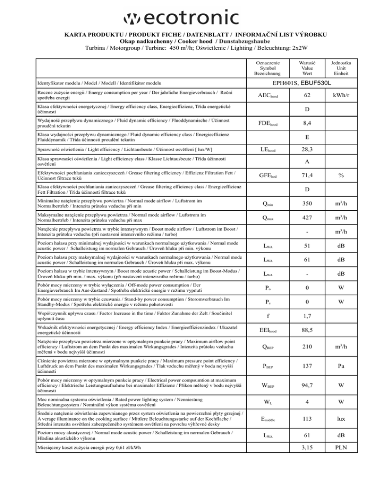 KARTA PRODUKTU / PRODUKT FICHE / DATENBLATT / INFORMAČNÍ LIST VÝROBKU Okap nadkuchenny / Cooker hood / Dunstabzugshaube Turbina / Motorgroup / Turbine: 450 m3/h; Oświetlenie / Lighting / Beleuchtung: 2x2W Oznaczenie Symbol Bezeichnung AEChood Klasa efektywności energetycznej / Energy efficiency class, Energieeffizienz, Třída energetické účinnosti Wydajność przepływu dynamicznego / Fluid dynamic efficiency / Fluoddynamische / Účinnost proudění tekutin FDEhood kWh/r 8,4 E LEhood Klasa sprawności oświetlenia / Light efficiency class / Klasse Lichtausbeute / Třída účinnosti osvětlení Efektywności pochłaniania zanieczyszczeń / Grease filtering efficiency / Effizienz Filtration Fett / Účinnost filtrace tuků 62 D Klasa wydajności przepływu dynamicznego / Fluid dynamic efficiency class / Energieeffizienz Fluiddynamik / Třída účinnosti proudění tekutin Sprawność oświetlenia / Light efficiency / Lichtausbeute / Účinnost osvětlení [ lux/W] Jednostka Unit Einheit EPH601S, EBUF530L Identyfikator modelu / Model / Modell / Identifikátor modelu Roczne zużycie energii / Energy consumption per year / Der jahrliche Energieverbrauch / Roční spotřeba energii Wartość Value Wert 28,3 A GFEhod Klasa efektywności pochłaniania zanieczyszczeń / Grease filtering efficiency class / Energieeffizienz Fett Filtration / Třída účinnosti filtrace tuků 71,4 % D Minimalne natężenie przepływu powiertza / Normal mode airflow / Luftstrom im Normalbertrleb / Intenzita průtoku vzduchu při min Qmin 350 m3/h Maksymalne natężenie przepływu powietrza / Normal mode airflow / Luftstrom im Normalbertrleb / Intenzita průtoku vzduchu při max Qmax 427 m3/h - m3/h Natężenie przepływu powietrza w trybie intensywnym / Boost mode airflow / Luftstrom im Boost / Intenzita průtoku vzduchu (při nastavení intenzivního režimu / turbo) Poziom hałasu przy minimalnej wydajności w warunkach normalnego użytkowania / Normal mode acustic power / Schalleistung im normalen Gebrauch / Úroveň hluku při min. výkonu LWA 51 dB Poziom hałasu przy maksymalnej wydajności w warunkach normalnego użytkowania / Normal mode acustic power / Schalleistung im normalen Gebrauch / Úroveň hluku při max. výkonu LWA 61 dB Poziom hałasu w trybie intensywnym / Boost mode acustic power / Schalleistung im Boost-Modus / Úroveň hluku při min. / max. výkonu (při nastavení intenzivního režimu / turbo) LWA - dB Pobór mocy mierzony w trybie wyłączenia / Off-mode power consumption / Der Energieverbrauch Im Aus-Zustand / Spotřeba elektrické energie v režimu vypnutí Po 0 W Pobór mocy mierzony w trybie czuwania / Stand-by power consumption / Storomverbrauch Im Standby-Modus / Spotřeba elektrické energie v režimu pohotovosti Ps 0 W Współczynnik upływu czasu / Factor Increase in the time / Faktor Zunahme der Zelt / Součinitel uplynutí času f 1,7 Wskaźnik efektywności energetycznej / Energy efficiency Index / Energieeffizienzindex / Ukazatel energetické účinnosti EEIhood 88,5 Natężenie przepływu powietrza mierzone w optymalnym punkcie pracy / Maximum airflow point efficiency / Luftstrom an dem Punkt des maximalen Wirkungsgrades / Intenzita průtoku vzduchu měřená v bodu nejvyšší účinnosti QBEP 210 m3/h Ciśnienie powietrza mierzone w optymalnym punkcie pracy / Maximum pressure point efficiency / Luftdruck an dem Punkt des maximalen Wirkungsgrades / Tlak vzduchu měřený v bodu nejvyšší účinnosti PBEP 137 Pa Pobór mocy mierzony w optymalnym punkcie pracy / Electrical power compsumtion at maximum efficiency / Elektrische Leistungsaufnahme bei maximaler Effizienz / Příkon měřený v bodu nejvyšší účinnosti WBEP 94,7 W WL 4 W Emiddle 113 lux LWA 61 dB 3,15 PLN Moc nominalna systemu oświetlenia / Rated power lighting system / Nenniestung Beleuchtungssystem / Nominální výkon systému osvětlení Średnie natężenie oświetlenia zapewnianego przez system oświetlenia na powierzchni płyty grzejnej / A verage illuminance on the cooking surface / Mittlere Beleuchtungsstarke auf der Kochflache / Střední intenzita osvětlení zabezpečeného systémem osvětlení na povrchu výhřevné desky Poziom mocy akustycznej / Normal mode acustic power / Schalleistung im normalen Gebrauch / Hladina akustického výkonu Miesięczny koszt zużycia energii przy 0,61 zł/kWh *** Wyniki ustalono zgodnie z metodami pomiaru i obliczeń według: • Dyrektywa PEiR 2010/30/UE; Rozporządzenie nr 65/2014, • Dyrektywa PEiR 2009/125/WE; Rozporządzenie nr 66/2014, • EN 50564 – Elektryczny sprzęt domowy – pomiar poboru mocy sprzętu w stanie gotowości do pracy. • EN 60704-2-13 – Elektryczne przyrządy do użytku domowego i podobnego – Procedura badania hałasu – Wymagania szczegółowe dla okapów nadkuchennych. • EN 61591 – Domowe okapy nadkuchenne i inne wyciągi oparów kuchennych – Metody badań cech funkcjonalnych. Aby zmniejszyć wpływ użytkowania okapu na środowisko należy: • używać maksymalnych prędkości silnika tylko przy intensywnym gotowaniu, • po zakończeniu gotowania wyłączyć silnik, • po zakończeniu użytkowania okapu wyłączyć oświetlenie. *** To determine the results, and in accordance with the requirements in ralation to the requirements in relation to the labeling of energyrelated products and with regard to ecodesign requiremants, the following calculation and measurement methods were applied: • Directive of the European Parliament and of the Council 2010/30/EU; Regulation No 65/2014 • Directive of the European Parliament and of the Council 2009/125/EC; Regulation No 66/2014 • EN 50564 Electrical and electronic household and office equipment. Measurement of low power consumption • EN 60704-2-13 Household and similar electrical appliances. Test code for the determination of airbome acoustical noise. Particular requirements for range hoods. • EN 61591 – Household range hoods and other cooking fume ex