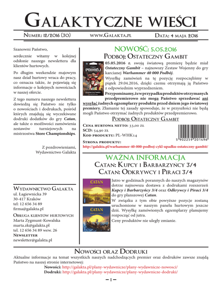 Galaktyczne Numer: 12/2016 (30) www.Galakta.pl Po długim weekendzie majowym nasz dział hurtowy wraca do pracy, co oznacza także, że pojawiają się informacje o kolejnych nowościach w naszej ofercie. Z tego numeru naszego newslettera dowiedzą się Państwo nie tylko o nowościach i dodrukach, pośród których znajdują się wyczekiwane dodruki dodatków do gry Catan, ale także o możliwości zamówienia zestawów turniejowych na mistrzostwa Store Championships. Z pozdrowieniami, Wydawnictwo Galakta Data: 4 maja 2016 Nowość: 5.05.2016 Podbój: Ostateczny Gambit Szanowni Państwo, serdecznie witamy w kolejnej odsłonie naszego newslettera dla klientów hurtowych. wieści 05.05.2016 r. swoją światową premierę będzie miał Ostateczny Gambit – najnowszy Zestaw Wojenny do gry karcianej Warhammer 40 000 Podbój. Wysyłkę zamówień na tę pozycję rozpoczęliśmy w piątek 29.04.2016, dzięki czemu otrzymają ją Państwo z odpowiednim wyprzedzeniem. Przypominamy, że w przypadku produktów otrzymanych przedpremierowo nie mogą Państwo sprzedawać ani wysyłać żadnych egzemplarzy produktu przed dniem jego światowej premiery. Złamanie tej zasady spowoduje, że w przyszłości nie będą mogli Państwo otrzymać żadnych produktów przedpremierowo. Podbój: Ostateczny Gambit Cena hurtowa netto: 33,00 zł SCD: 54,90 zł Kod produktu: PL-WHK14 Strona produktu: http://galakta.pl/warhammer-40-000-podboj-cykl-upadku-ostateczny-gambit/ Ważna informacja Catan: Kupcy i Barbarzyńcy 3/4 Catan: Odkrywcy i Piraci 3/4 Jutro w godzinach porannych do naszych magazynów dotrze najnowsza dostawa z dodrukami rozszerzeń Kupcy i Barbarzyńcy 3/4 oraz Odkrywcy i Piraci 3/4 do gry planszowej Catan. W związku z tym obie powyższe pozycje zostaną uruchomione w naszym panelu hurtowym jeszcze dziś. Wysyłkę zamówionych egzemplarzy planujemy rozpocząć od jutra. Ceny produktów nie uległy zmianie. Wydawnictwo Galakta ul. Łagiewnicka 39 30-417 Kraków tel: 12 656 34 89 [email protected] Obsługa klientów hurtowych Marta Zygmunt-Kowalska [email protected] tel. 12 656 34 89 wew. 26 Newsletter [email protected] Nowości oraz Dodruki Aktualne informacje na temat wszystkich naszych nadchodzących premier oraz dodruków zawsze znajdą Państwo na naszej stronie internetowej: Nowości: http://galakta.pl/plany-wydawnicze/plany-wydawnicze-nowosci/ Dodruki: http://galakta.pl/plany-wydawnicze/plany-wydawnicze-dodruki/ 1 Ważna Ważna informacja Store Championships 2016 informacja Majowe dodruki Tak jak wspominaliśmy w poprzedni wydaniu naszego newslettera, w II połowie miesiąca spodziewamy się dostawy z następującymi dodrukami: Zgodnie z posiadanymi przez nas obecnie informacjami, wysyłkę powyższych pozycji powinniśmy rozpocząć 16.05.2016. Talisman: Magia i Miecz Cena hurtowa netto: 114,00 zł SCD: 189,90 zł Anioł Śmierci Cena hurtowa netto: 54,00 zł SCD: 89,90 zł CENY! MIANA Z Cytadela Cena hurtowa netto: 54,00 zł SCD: 89,90 zł Jak zapewne Państwu wiadomo, niedawno na oficjalnej stronie internetowej Fantasy Flight Games opublikowana została informacja o tegorocznych turniejach, odbywających się w ramach cyklu Store Championships 2016. Tak jak w przypadku wszystkich podobnych wydarzeń, za naszym pośrednictwem mogą Państwo składać zamówienia na przygotowane przez FFG zestawy promocyjne, dostępne w ramach wspomnianego programu. Program ten obejmuje gry LCG: Gra o Tron 2. edycja, Android: Netrunner, oraz Warhammer 40 000: Podbój. W ramach programu Store Championships 2016 każdy sklep ma możliwość zorganizowania jednego turnieju w dany tytuł, jednak nie ma limitu odnośnie do liczby różnych gier, w które sklep może zorganizować swoje mistrzostwa. Ponadto, jeśli sklep posiada kilka oddziałów, każdy oddział może zorganizować swoje mistrzostwa sklepu w każdy tytuł. Do wszystkich gier dostępne będą zestawy w języku polskim, natomiast w przypadku gry LCG Android: Netrunner mają Państwo możliwość wyboru pomiędzy polską i angielską wersją językową zestawu. Warunkiem udziału w powyższym programie jest zakup zestawu turniejowego do danej gry oraz zorganizowanie w okresie 7.11.2016 (14.11.2016 w przypadku Gry o Tron LCG)- 28.02.2017 turnieju w zgłoszoną grę. Koszt jednego zestawu to 300,00 zł netto. W każdym takim zestawie znajdować się będą: • plakat • 32 sztuki karty promo • 8 pudełek na karty • 4 maty, 1 akrylowe trofeum • 1 plastikowa karta „bye” • 2 sztuki karty dostępnej na mistrzostwach świata. Państwa szczególnej uwadze polecamy zestaw turniejowy do Gry o Tron LCG, bowiem, poza nagrodami wyszczególnionymi powyżej, znajdować się w nim będą także specjalne nagrody przeznaczone na dodatkowe turnieje odbywające się na całym świecie w dniach 1213.11.2016, w trakcie których gracze będą mogli wpłynąć na karty, które ukażą się w przyszłych dodatkach! Turnieje te będą przeznaczone dla maksymalnie 32 graczy, a wyniki ich głosowania należy przekazać do nas, abyśmy mogli odesłać je do FFG. Nowości oraz Dodruki Najnowsze informacje na temat wszystkich naszych nadchodzących premier oraz dodruków zawsze znajdą Państwo na naszej stronie internetowej: Nowości: http://galakta.pl/plany-wydawnicze/plany-wydawnicze-nowosci/ Dodruki: http://galakta.pl/plany-wydawnicze/plany-wydawnicze-dodruki/ 2 Ważna informacja Store Championships 2016 (kontynuacja) Więcej informacji na temat wspomnianego programu znajdą Państwo na stronie internetowej Fantasy Flight Games: https://www.fantasyflightgames.com/en/news/2016/4/20/orderyour-store-championship-kits-by-may-17th/ Jeśli jesteście Państwo zainteresowani wzięciem udziału w tym programie, prosimy o przesłanie Państwa zgłoszenia najpóźniej 17.05.2016 (zgłoszenia przesłane po tym terminie nie będą uwzględniane). Zgłoszenia proszę wysyłać na adres [email protected] Zgłoszenie powinno zawierać następujące informacje: • Nazwę sklepu
