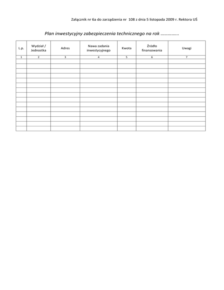Załącznik nr 6a do zarządzenia nr 108 z dnia 5 listopada 2009 r. Rektora UŚ Plan inwestycyjny zabezpieczenia technicznego na rok …………... L.p. Wydział / Jednostka Adres Nawa zadania inwestycyjnego Kwota Źródło finansowania Uwagi 1 2 3 4 5 6 7