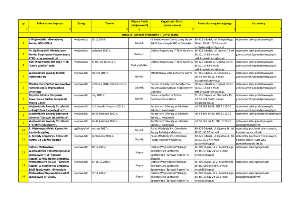 Lp. Pełna nazwa imprezy 1 Zasięg Miejsce finału (miejscowość) Termin 2 3 Organizator finału (pełna nazwa) Adres biura organizacyjnego 5 4 Uczestnicy 6 7 DZIAŁ III- IMPREZY SPORTOWE I TURYSTYCZNE V Wojewódzki Mikołajkowy Turniej UNIHOKEJA wojewódzki wojewódzki 3 45. Ogólnopolski Młodzieżowy Turniej Turystyczno-Krajoznawczy PTTK - etap wojewódzki XXXI Wojewódzki Zlot SKKT PTTK "Cedry Wielkie" 2016 Wojewódzkie Zawody Modeli Halowych F1N wojewódzki 4 Młodzieżowy Puchar Wojewóztwa Pomorskiego w Imprezach na Orientacje Gdyńska Szkolna Olimpiada Rowerowa o Puchar Prezydenta Miasta Gdyni Wojewódzkie Zawody Strzeleckie z okazji "Dnia Niepodległości" Wojewódzkie Zawody SportowoObronne "Sprawni jak żołnierze". Wojewódzkie Zawody Strzeleckie o "Srebrne Muszkiety". 6. Mistrzostwa Polski Kyokushin Karate Grappling 7. Zawody Grapplingu Kyokushin Karate-Do Gdański Neptun wojewódzki 1 2 5 6 7 8 9 10 11 12 13 14 Halowe Mistrzostwa Województwa Pomorskiego Szkół Specjalnych PTSS "Sprawni Razem" w Piłce Nożnej Chłopców Mistrzostwa Polski ZSS "Sprawni Razem" w Koszykówce Chłopców Szkół Specjalnych - Gimnazjum Mistrzostwa Województwa Szkół Specjalnych w Futsalu. 09.12.2016 r. Gdańsk kwiecień 2017 r. Kwidzyn wojewódzki 31.09.-02.10.2016 r. Cedry Wielkie marzec 2017 r. Gdynia wojewódzki wrzesień 2016-czerwiec 2017 r. Gdańsk maj 2017 r. Gdynia wojewódzki II,III dekada listopada 2016 r. wojewódzki do 30 kwietnia 2017 r. wojewódzki do 30 kwietnia 2017 r. ogólnopolski marzec 2017 r. wojewódzki Gdańsk październik 2016 r. Gdańsk wojewódzki 10.12.2015 r. Słupsk wojewódzki 14-16.10.2016 r. Słupsk wojewódzki 09.11.2016 r. Słupsk III Podstawowo-Gimnazjalny Zespół 80-422 Gdańsk, ul. Waryńskiego Szkół Społecznych STO w Gdańsku 36 tel. 58 341 70 25 e-mail: [email protected] Oddział Regionalny PTTK w Gdańsku 80-826 Gdańsk, ul. Ogarna 72 tel. 58 301 14 88 e-mail: [email protected] Oddział Regionalny PTTK w Gdańsku 80-826 Gdańsk ul. Ogarna 72 tel. 58 301 14 88 e-mail: [email protected] Młodzieżowy Dom Kultury w Gdyni 81-265 Gdynia, ul. Grabowo 2, tel. 58 698 86 18, e-mail: [email protected] Polskie Towarzystwo Turystyczno- 80-826 Gdańsk ul. Ogarna 82 tel. Krajoznawcze Oddział Regionalny w 58 301 14 88 e-mail: Gdańsku [email protected] Pierwsza Społeczna Szkoła 81-616 Gdynia, ul. Strażacka 15, Podstawowa w Gdyni tel. 58 624 05 09, e-mail: [email protected] Kuratorium Oświaty w Gdańsku, tel. 58 669 34 39; 609 31 10 20 Szkoły, J. Kwidziński Kuratorium Oświaty w Gdańsku, tel. 58 669 34 39; 609 31 10 20 Szkoły, J. Kwidziński Kuratorium Oświaty w Gdańsku, tel. 58 669 34 39; 609 31 10 20 Szkoły, J. Kwidziński Pałac Młodzieży im. Obrońców 80-826 Gdańsk, ul. Ogarna 56, tel. Poczty Polskiej w Gdańsku 58 301 60 07, e-mail: Pałac Młodzieży im. Obrońców 80-826 Gdańsk, ul. Ogarna 56, tel. Poczty Polskiej w Gdańsku 58 301 60 07, e-mail: [email protected] Oddział Wojewódzki Polskiego 76-200 Słupsk, ul. Z. Krasińskiego Towarzystwa Społeczno19, tel. 59 842 24 92, e-mail: Sportowego "Sprawni Razem" w [email protected] Słupsku Oddział Wojewódzki Polskiego 76-200 Słupsk, ul. Z. Krasińskiego Towarzystwa Społeczno19, tel. 606 646 687, e-mail: Sportowego "Sprawni Razem" w [email protected] Oddział Wojewódzki Polskiego 76-200 Słupsk, ul. Z. Krasińskiego Towarzystwa Społeczno19, tel. 59 842 24 92, e-mail: Sportowego "Sprawni Razem" w [email protected] uczniowie szkół podstawowych uczniowie szkół podstawowych, gimnazjalych i ponadgimnazjalych uczniowie szkół podstawowych, gimnazjalych i ponadgimnazjalych uczniowie szkół podstawowych, gimnazjalych i ponadgimnazjalych uczniowie szkół podstawowych, gimnazjalych i ponadgimnazjalych uczniowie szkół podstawowych, gimnazjalych i ponadgimnazjalych uczniowie szkół podstawowych, gimnazjalych i ponadgimnazjalych uczniowie szkół ponadgimnazjamnych uczniowie szkół gimnazjalnych i ponadgimnazjalnych uczestnicy placówek oświatowych, klubów karate z Polski uczestnicy placówek oświatowych, klubów karate i judo woj. pomorskiego do lat 18 uczniowie szkół specjalnych uczniowie szkół specjalnych uczniowie szkół specjalnych ponadgimnazjalnych 15 16 17 18 19 20 21 Mistrzostwa Województwa wojewódzki 16.03.2017 r. Pomorskiego w Koszykówce Dziewcząt i Chłopców Szkół Specjalnych. Mistrzostwa Województwa wojewódzki 01.06.2017 r. Pomorskiego Szkół Specjalnych w TENISIE ZIEMNYM. Ogólnopolski Halowy Turniej Piłki ogólnopolski 8-10.04.2017 r. Nożnej Dziewcząt Szkół Specjalnych. XXIII Wojewódzki Turniej Gier i wojewódzki 07.06.2017 r. Zabaw Ruchowych dla osób niepełnosprawnych. XII Międzynarodowy Festiwal międzynarodowy marzec 2017 r. Formacji GimnastycznoTanecznych "Gim-Show" XVI rozgrywki sportowe wojewódzki 24.11.2016 r. wychowanków burs i internatów województwa pomorskiego Czwórbój lekkoatletyczny. wojewódzki maj 2017 r. Słupsk Słupsk Słupsk Żukowo Gdynia Chojnice Gdańsk Oddział Wojewódzki Polskiego Towarzystwa SpołecznoSportowego "Sprawni Razem" w Słupsku Oddział Wojewódzki Polskiego Towarzystwa SpołecznoSportowego "Sprawni Razem" w Oddział Wojewódzki Polskiego Towarzystwa SpołecznoSportowego "Sprawni Razem" w Specjalny Ośrodek SzkolnoWychowawczy w Żukowie 76-200 Słupsk, ul. Z. Krasińskiego uczniowie szkół specjalnych 19, tel. 606 646 687, e-mail: [email protected] 76-200 Słupsk, ul. Z. Krasińskiego 19, tel. 606 646 687, e-mail: [email protected] 76-200 Słupsk, ul. Z. Krasińskiego 19, tel. 606 646 687, e-mail: [email protected] 83-330 Żukowo, ul. Gdyńska 7a, tel. 58 681 83 71, e-mail: [email protected] Młodzieżowy Dom Kultury w Gdyni 81-265 Gdynia, ul. Grabowo 2, tel. 58 698 86 18, e-mail: [email protected] Powiatowa Bursa dla Młodzieży 89-600 Chojnice ul. Świętopełka 1, Szkolnej w Chojnicach tel. 59 397 29 96, e-mail: [email protected] Szkoła Podstawowa nr 17 w 80-239 Gdańsk ul. Czarnieckiego Gdańsku 2, t