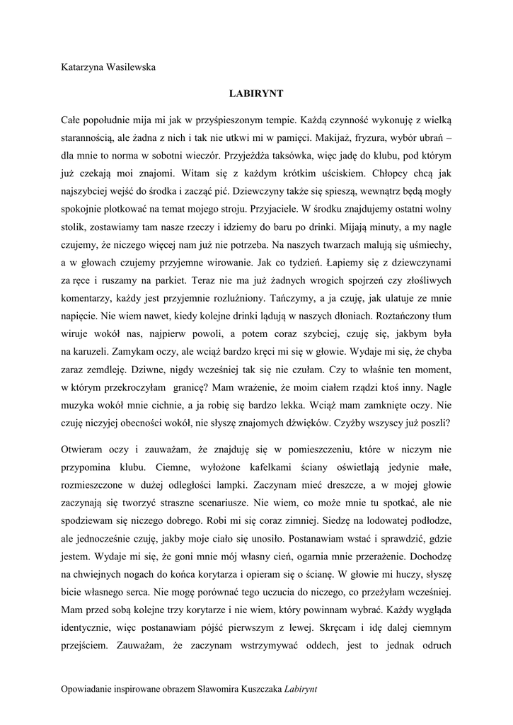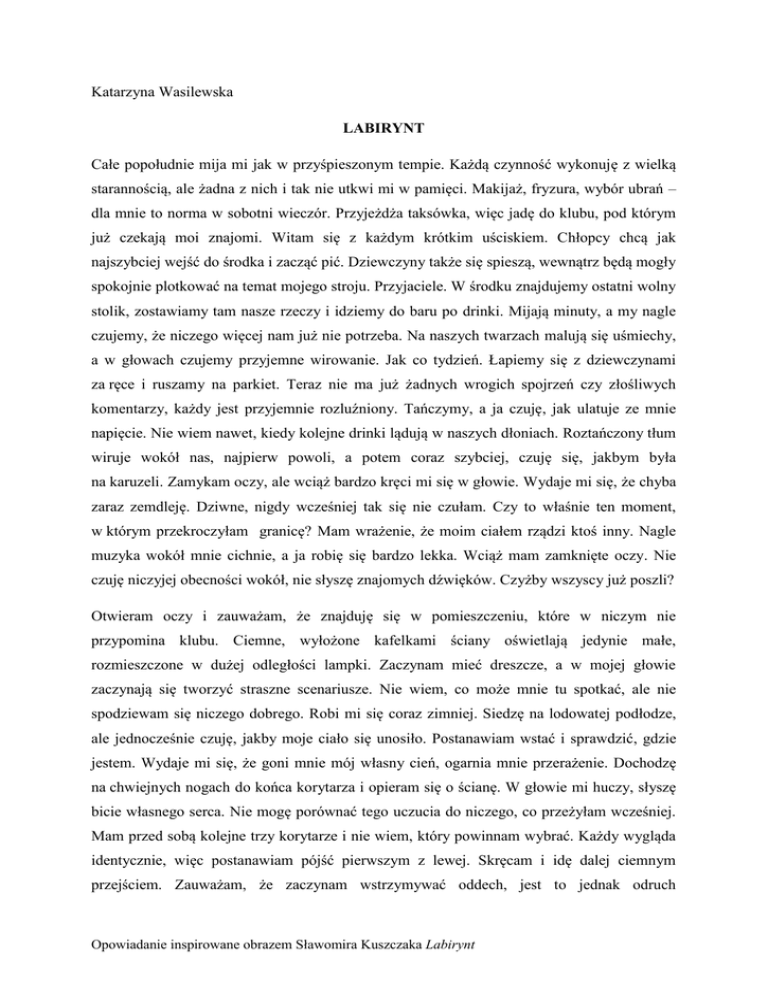 Katarzyna Wasilewska LABIRYNT Całe popołudnie mija mi jak w przyśpieszonym tempie. Każdą czynność wykonuję z wielką starannością, ale żadna z nich i tak nie utkwi mi w pamięci. Makijaż, fryzura, wybór ubrań – dla mnie to norma w sobotni wieczór. Przyjeżdża taksówka, więc jadę do klubu, pod którym już czekają moi znajomi. Witam się z każdym krótkim uściskiem. Chłopcy chcą jak najszybciej wejść do środka i zacząć pić. Dziewczyny także się spieszą, wewnątrz będą mogły spokojnie plotkować na temat mojego stroju. Przyjaciele. W środku znajdujemy ostatni wolny stolik, zostawiamy tam nasze rzeczy i idziemy do baru po drinki. Mijają minuty, a my nagle czujemy, że niczego więcej nam już nie potrzeba. Na naszych twarzach malują się uśmiechy, a w głowach czujemy przyjemne wirowanie. Jak co tydzień. Łapiemy się z dziewczynami za ręce i ruszamy na parkiet. Teraz nie ma już żadnych wrogich spojrzeń czy złośliwych komentarzy, każdy jest przyjemnie rozluźniony. Tańczymy, a ja czuję, jak ulatuje ze mnie napięcie. Nie wiem nawet, kiedy kolejne drinki lądują w naszych dłoniach. Roztańczony tłum wiruje wokół nas, najpierw powoli, a potem coraz szybciej, czuję się, jakbym była na karuzeli. Zamykam oczy, ale wciąż bardzo kręci mi się w głowie. Wydaje mi się, że chyba zaraz zemdleję. Dziwne, nigdy wcześniej tak się nie czułam. Czy to właśnie ten moment, w którym przekroczyłam granicę? Mam wrażenie, że moim ciałem rządzi ktoś inny. Nagle muzyka wokół mnie cichnie, a ja robię się bardzo lekka. Wciąż mam zamknięte oczy. Nie czuję niczyjej obecności wokół, nie słyszę znajomych dźwięków. Czyżby wszyscy już poszli? Otwieram oczy i zauważam, że znajduję się w pomieszczeniu, które w niczym nie przypomina klubu. Ciemne, wyłożone kafelkami ściany oświetlają jedynie małe, rozmieszczone w dużej odległości lampki. Zaczynam mieć dreszcze, a w mojej głowie zaczynają się tworzyć straszne scenariusze. Nie wiem, co może mnie tu spotkać, ale nie spodziewam się niczego dobrego. Robi mi się coraz zimniej. Siedzę na lodowatej podłodze, ale jednocześnie czuję, jakby moje ciało się unosiło. Postanawiam wstać i sprawdzić, gdzie jestem. Wydaje mi się, że goni mnie mój własny cień, ogarnia mnie przerażenie. Dochodzę na chwiejnych nogach do końca korytarza i opieram się o ścianę. W głowie mi huczy, słyszę bicie własnego serca. Nie mogę porównać tego uczucia do niczego, co przeżyłam wcześniej. Mam przed sobą kolejne trzy korytarze i nie wiem, który powinnam wybrać. Każdy wygląda identycznie, więc postanawiam pójść pierwszym z lewej. Skręcam i idę dalej ciemnym przejściem. Zauważam, że zaczynam wstrzymywać oddech, jest to jednak odruch Opowiadanie inspirowane obrazem Sławomira Kuszczaka Labirynt bezwarunkowy. Skupiam się na tym, by oddychać, i przechodzę jeszcze kilkadziesiąt metrów. Dochodzą do mnie odgłosy zabawy, muzyka i śmiech, które z każdym krokiem robią się coraz głośniejsze. Za rogiem dostrzegam moich znajomych, mnóstwo innych ludzi, a pośród nich także mnie. Oszołomiona, nie mogę się poruszyć. Jest to niezwykle zdumiewające uczucie, mam wrażenie, że patrzę w lustro. Przez chwilę zastanawiam się, czy nie umarłam, ale uznaję, że to zbyt niewiarygodne. Stoję i patrzę na samą siebie bawiącą się w klubie. W ciągu kilku minut moje „ja” z imprezy wypija tyle alkoholu, że przestaję już liczyć. Zauważam dwóch chłopaków kręcących się koło mojego ledwo trzymającego się na nogach sobowtóra. Patrzą łakomym wzrokiem i powoli podchodzą coraz bliżej. Jeden z nich bierze tę „drugą mnie” pod rękę i ciągnie w stronę drzwi. Gdzie są moi koledzy? Chcę coś zrobić, poprosić kogoś o pomoc, ale mój niemy krzyk ginie pośród odgłosów zabawy. Mam wrażenie, że nawet gdyby wokół panowała cisza i tak nikt by go nie usłyszał. Nie chcę już tego obserwować, odwracam się i zaczynam biec. Próbuję wymazać z pamięci to, co przed chwilą zobaczyłam, ale jest to niemożliwe. Docieram do rozstaju dróg znowu nie wiem, co mam zrobić. Postanawiam wejść do środkowego tunelu, ale po tym, co zobaczyłam w pierwszym, boję się jeszcze bardziej. Zaczynam dygotać, przez co jest mi trudniej iść, ale wiem, że muszę wytrwale podążać dalej. Droga trwa kilka minut, ale dla mnie wydaje się, że były to godziny. Odrętwiała i wycieńczona dochodzę do kolejnego pomieszczenia. Znów mogę obserwować samą siebie, tym razem w innej sytuacji. Siedzę za biurkiem w ładnym gabinecie, domyślam się więc, że jestem w pracy. Widzę, na twarzy sobowtóra zdenerwowanie, krzyczę na swojego asystenta i uderzam w biurko. Moje alter ego zabiera z biurka jakąś teczkę, chwyta płaszcz i wychodzi. Podążamy razem ulicą, w powietrzu można wyczuć unoszącą się złość. Zmierzamy do jednego z bloków. Otwiera jedno z mieszkań i razem wchodzimy do środka. Źle czuję się w tym pomieszczeniu, przenika mnie chłód. Wszędzie królują odcienie szarości i ciemnego brązu. Na ścianach nie ma żadnych zdjęć czy pamiątek, zupełnie nie w moim stylu. Mój sobowtór siada na kanapie z kieliszkiem wina w dłoni. Po twarzy zaczynają mu płynąć łzy. Mam ochotę podejść i pocieszyć samą siebie, ale uświadamiam sobie, jakie to bezsensowne. Gdzie są wszyscy moi znajomi? Przecież jestem taka lubiana. Nie mogę uwierzyć, że w przyszłości mogę spędzać takie ładne popołudnie samotnie w domu. Czy możliwe, że całkowicie poświęciłam się karierze? Ta wizja działa na mnie tak przygnębiająco, że chcę jak najszybciej opuścić to miejsce. Wychodzę z mieszkania i zauważam, że znów jestem w ciemnym korytarzu, w którym byłam wcześniej. Apatycznie Opowiadanie inspirowane obrazem Sławomira Kuszczaka Labirynt podążam przed siebie, moje kroki są coraz wolniejsze. Koncepcje 