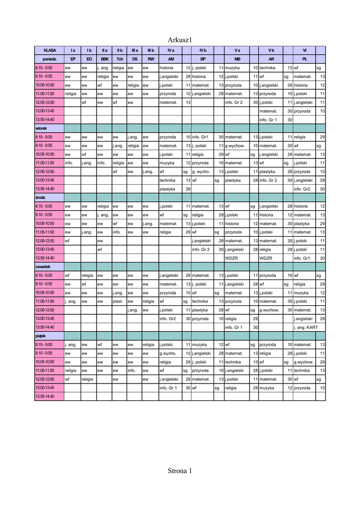 Arkusz1 KLASA Ia poniedz. Ib EP II b III a BBK Tch DS III b IV a RW IV b Va Vb VI AM BP MB 8.15 - 9.00 ew ew j. ang. religia ew ew historia 12 j. polski 11 muzyka 10 technika 9.10 - 9.55 ew ew religia ew ew ew j.angielski 28 historia 12 j.polski 11 wf 10.05-10.50 ew ew wf ew religia ew j.polski 11 matemat. 13 przyroda 10 j.angielski 28 historia 12 11.05-11.50 religia ew ew ew ew przyroda 12 j.angielski 28 matemat. 13 przyroda 10 j.polski 11 wf ew wf ew matemat. 13 30 j.polski 11 j.angielski 11 10 12.05-12.50 EO II a ew info. Gr 2 AR PŁ 13 wf sg sg matemat. 13.00-13.45 matemat. 30 przyroda 13.55-14.40 info. Gr 1 30 13 wtorek 8.15 - 9.00 ew ew ew ew j.ang. ew przyroda 10 info. Gr1 30 matemat. 13 j.polski 11 religia 9.10 - 9.55 ew ew ew j.ang. religia ew matemat. 13 j. polski 11 g.wychow. 10 matemat. 30 wf 10.05-10.50 ew wf ew ew ew ew j.polski 11 religia 29 wf 11.05-11.50 info. j.ang. info. religia ew ew muzyka 12 przyroda 10 matemat. 13 wf wf j.ang. wf 13 j.polski 11 plastyka 28 przyroda 10 28 info. Gr 2 30 j.angielski 28 12.05-12.50 ew sg g. wycho. 13.00-13.45 technika 13 wf 13.55-14.40 plastyka 28 11 matemat. sg plastyka sg j.angielski 29 sg 28 matemat. sg 13 j.polski 11 info. Gr2 30 środa 8.15 - 9.00 ew ew religia ew ew ew j.polski 9.10 - 9.55 ew ew j. ang. ew ew ew wf 10.05-10.50 ew ew ew wf ew j.ang. matemat. 13 j.polski 11.05-11.50 ew j.ang. ew info. ew ew religia 29 wf 12.05-12.50 wf 13.00-13.45 sg religia 13 wf sg j.angielski 28 historia 12 29 j.polski 11 historia 12 matemat. 13 11 historia 12 matemat. 30 plastyka 29 10 j.polski 11 matemat. 13 sg przyroda ew j.angielski 28 matemat. 13 matemat. 30 j.polski 11 wf info. Gr 2 30 j.angielski 28 religia 29 j.polski 11 13.55-14.40 WDZR WDZR info. Gr1 30 czwartek 8.15 - 9.00 wf religia ew ew ew ew j.angielski 28 matemat. 13 j.polski 11 przyroda 9.10 - 9.55 ew wf ew ew ew ew matemat. 13 j. polski 11 j.angielski 28 wf 10.05-10.50 ew ew ew j.ang. ew ew przyroda 10 wf 11.05-11.50 j. ang. ew ew plast. ew religia wf j.ang. ew j.polski 11 plastyka 28 wf info. Gr2 30 przyroda 10 religia 12.05-12.50 13.00-13.45 sg technika sg matemat. 13 przyroda 13.55-14.40 info. Gr 1 10 wf sg sg religia 29 13 j.polski 11 muzyka 12 10 matemat. 30 j.polski 11 30 matemat. 13 29 j.angielski 28 30 j. ang. KART sg g.wychow. piątek 8.15 - 9.00 j. ang. ew wf ew ew religia j.polski 11 muzyka 12 wf 9.10 - 9.55 ew ew ew ew ew ew g.wycho. 12 j.angielski 28 matemat. 13 religia 10.05-10.50 ew ew ew ew ew ew religia 29 j. polski 11 technika 13 wf 11.05-11.50 religia ew ew ew info. ew wf 10 j.angielski 28 j.polski 11 technika 12.05-12.50 wf religia ew j.angielski 28 matemat. 13 j.polski 11 matemat. 30 wf info. Gr 1 30 wf 29 muzyka 12 przyroda 13.00-13.45 ew sg przyroda 13.55-14.40 Strona 1 sg religia sg przyroda 10 matemat. 13 29 j.polski 11 sg g.wychow. 28 13 sg 10