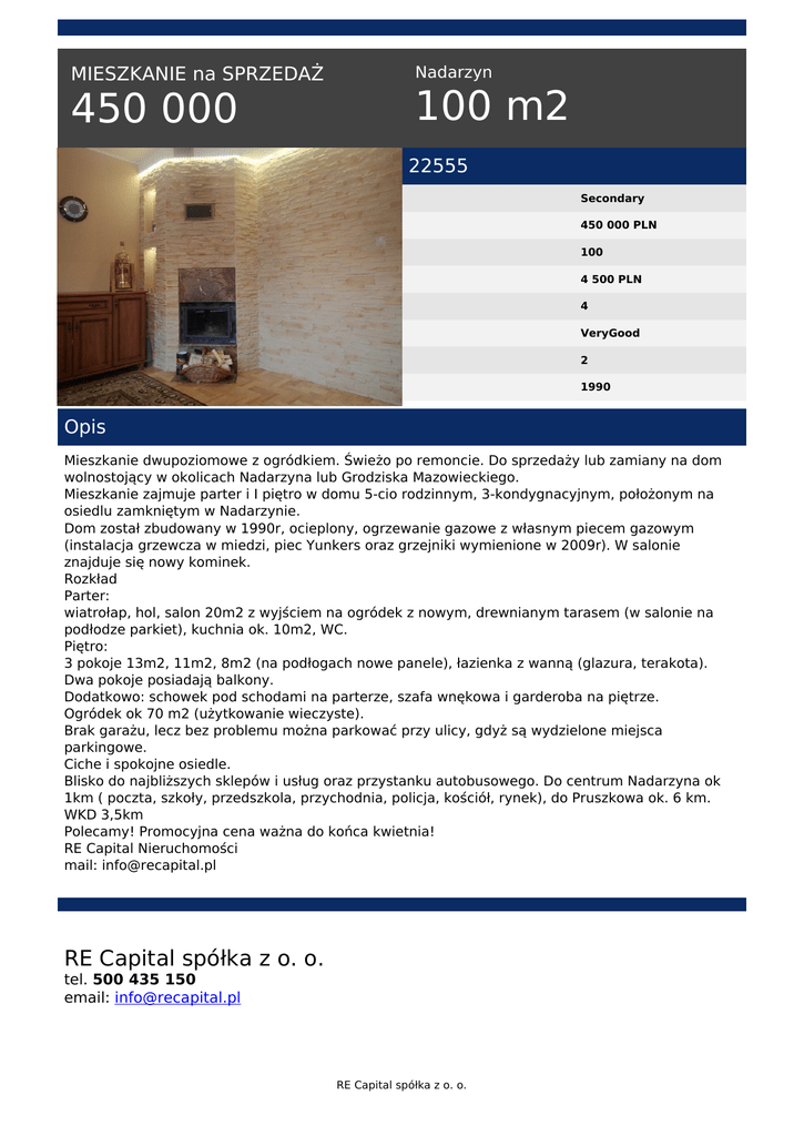 MIESZKANIE na SPRZEDAŻ 450 000 Nadarzyn 100 m2 22555 Secondary 450 000 PLN 100 4 500 PLN 4 VeryGood 2 1990 Opis Mieszkanie dwupoziomowe z ogródkiem. Świeżo po remoncie. Do sprzedaży lub zamiany na dom wolnostojący w okolicach Nadarzyna lub Grodziska Mazowieckiego. Mieszkanie zajmuje parter i I piętro w domu 5-cio rodzinnym, 3-kondygnacyjnym, położonym na osiedlu zamkniętym w Nadarzynie. Dom został zbudowany w 1990r, ocieplony, ogrzewanie gazowe z własnym piecem gazowym (instalacja grzewcza w miedzi, piec Yunkers oraz grzejniki wymienione w 2009r). W salonie znajduje się nowy kominek. Rozkład Parter: wiatrołap, hol, salon 20m2 z wyjściem na ogródek z nowym, drewnianym tarasem (w salonie na podłodze parkiet), kuchnia ok. 10m2, WC. Piętro: 3 pokoje 13m2, 11m2, 8m2 (na podłogach nowe panele), łazienka z wanną (glazura, terakota). Dwa pokoje posiadają balkony. Dodatkowo: schowek pod schodami na parterze, szafa wnękowa i garderoba na piętrze. Ogródek ok 70 m2 (użytkowanie wieczyste). Brak garażu, lecz bez problemu można parkować przy ulicy, gdyż są wydzielone miejsca parkingowe. Ciche i spokojne osiedle. Blisko do najbliższych sklepów i usług oraz przystanku autobusowego. Do centrum Nadarzyna ok 1km ( poczta, szkoły, przedszkola, przychodnia, policja, kościół, rynek), do Pruszkowa ok. 6 km. WKD 3,5km Polecamy! Promocyjna cena ważna do końca kwietnia! RE Capital Nieruchomości mail: [email protected] RE Capital spółka z o. o. tel. 500 435 150 email: [email protected] RE Capital spółka z o. o. RE Capital spółka z o. o. Powered by TCPDF (www.tcpdf.org)