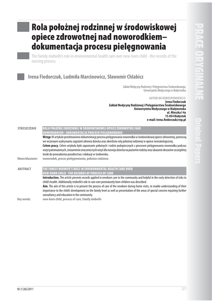 Rola położnej rodzinnej w środowiskowej opiece zdrowotnej nad noworodkiem– dokumentacja procesu pielęgnowania The family midwife’s role in environmental health care over new-born child - the records of the nursing process. Irena Fiedorczuk, Ludmiła Marcinowicz, Sławomir Chlabicz Zakład Medycyny Rodzinnej i Pielęgniarstwa Środowiskowego, Uniwersytetu Medycznego w Białymstoku AUTOR DO KORESPONDENCJI: Irena Fiedorczuk Zakład Medycyny Rodzinnej i Pielęgniarstwa Środowiskowego Uniwersytetu Medycznego w Białymstoku ul. Mieszka I 4a 15-054 Białystok e-mail: [email protected] STRESZCZENIE Słowa kluczowe: ABSTRACT Key words: Nr 3 (36)/2011 ROLA POŁOŻNEJ RODZINNEJ W ŚRODOWISKOWEJ OPIECE ZDROWOTNEJ NAD NOWORODKIEM DOKUMENTACJA PROCESU PIELĘGNOWANIA Wstęp: W artykule przedstawiono dokumentację procesu pielęgnowania noworodka w środowiskowej opiece zdrowotnej, pomocną we wczesnym wykrywaniu zagrożeń zdrowia dziecka oraz określono rolę położnej rodzinnej w opiece neonatologicznej. Celem pracy. Celem artykułu było zapoznanie położnych i rodzin podopiecznych z procesem pielęgnowania noworodka podczas wizyt patronażowych, zrozumienie znaczenia tych wizyt dla rozwoju dziecka na poziomie rodziny oraz ukazanie obszarów szczególnej troski do prowadzenia poradnictwa i edukacji w środowisku. noworodek, proces pielęgnowania, położna rodzinna THE FAMILY MIDWIFE’S ROLE IN ENVIRONMENTAL HEALTH CARE OVER NEWBORN CHILD THE RECORDS OF PROCESS OF CARE Introduction. The article presents records applied in newborn care in the community and helpful in the early detection of risks to child’s health. Additionally midwife’s role in care over prematurely born children was described. Aim. The aim of this article is to present the process of care of the newborn during home visits, to enable understanding of their importance to the child’s development on the family level as well as presentation of the areas of special concern requiring further consultancy and education in the community. new-born child, process of care, family midwife 27 Rola położnej rodzinnej w środowiskowej opiece zdrowotnej ... WSTĘP x prowadzenia poradnictwa pielęgniarskiego, x oceniania jakości macierzyństwa (więzi matki z dzieckiem), Opiekę nad noworodkiem po wypisie ze szpitala należy zakwalifikować do niezwykle ważnych zagadnień medycz- x diagnozowania zaburzeń wydolności rodzicielskiej (krzywdzenie dzieci poniżej 6 miesiąca życia powoduje no-organizacyjnych z uwagi na obniżenie wieku noworodwysokie ryzyko uszkodzeń czy śmierci) [4]. ków wypisywanych z oddziałów położniczych. Czas pobytu zdrowych, donoszonych noworodków z fizjologicznych Tak ujęte umiejętności wskazują na położną jako na porodów w oddziale szpitalnym w Polsce wynosi średnio 2-4 dni, a na życzenie matki może być jeszcze krótszy. osobę wspomagającą pierwszy etap rozwoju i wychowania Wczesny okres noworodkowy (I tydzień życia) oraz mie- dziecka w rodzinie, w okresie najczulszego reagowania na sięczny okres adaptacji poszczególnych układów do ży- czynniki kształtujące jego osobowość. Proces pielęgnowania noworodka w środowisku cia pozałonowego (dalsze stadium noworodka) w życiu dziecka wymaga wnikliwej obserwacji, gdyż dobry prze- domowym wymaga wielkiej odpowiedzialności, dubieg tego okresu w dużej mierze zależy od prawidłowego żego zaangażowania, wnikliwego podejścia do każdew tym okresie postępowania i właściwego pielęgnowania. go problemu i wątpliwości rodziców, a przy tym jest Opiekę poporodową nad matką i noworodkiem sprawują niezwykle czasochłonny, w szczególności podczas równolegle lekarz rodzinny i położna rodzinna. Przebieg pierwszej wizyty patronażowej. Oczekiwania rodziców opieki uzależniony jest od aktualnych potrzeb zdrowotno uzależnione są od kolejności porodów i doświadczeń – rozwojowych dziecka i potrzeb rodziny, jej adaptacji do związanych z prokreacją - wyraźnie można zaobserról rodzicielskich. Zdrowie noworodka, zdrowie rodziny wować ich zmienność wraz ze stopniem rozwoju komna tym etapie rozwoju zależy od współdziałania lekarzy i petencji rodzicielskich. Wstępne działania rozpoznawcze należy rozpocząć od położnych [1, 2]. Położne rodzinne prowadzą szeroką gamę usług zapoznania się z dokumentacją medyczną ze szpitala (epimedycznych w domu kobiet po porodzie, w tym także kryza z oddziału noworodkowego) i Książeczką zdrowia promocję zdrowia i prewencję chorób poprzez wczesną dziecka. Istotne informacje obejmują: okres przedkoncepidentyfikację problemów zdrowotnych. Zakres zadań cyjny, prenatalny z wyodrębnieniem problemów zdrowotpozwala również na całościowe poznanie rodziny, stały nych w czasie ciąży oraz przebiegu porodu. Dane z dokukontakt z rodziną, możliwość określenia relacji wewnątrz- mentacji pozwolą również dokonać klasyfikacji noworodrodzinnych, problemów, potrzeb, a także pozwala na ka, wraz z oceną przebiegu stanów przystosowawczych do zindywidualizowanie opieki, co jest szczególnie ważne życia pozamacicznego (przebieg okresu noworodkowego w przygotowywaniu rodziców do sprawowania opieki podczas pobytu w szpitalu) – co stanowi podstawę planu opieki nad noworodkiem. nad noworodkiem. Wywiad z mamą/rodzicami i obserwacja środowiska Regularne wizyty patronażowe, podczas których realizowana jest kompleksowa pielęgnacyjna opieka dziecka pod kątem bezpieczeństwa i właściwej higiepołożniczo-neonatologiczna nad kobietą, noworodkiem ny noworodka to kolejny etap postępowania położnej. i niemowlęciem – do ukończenia drugiego miesiąca życia – Ogromne znaczenie w tym momencie ma umiejętne wymagają coraz większych kompetencji położnych, nie nawiązanie kontaktu z mamą i zdobycie jej zaufania. Właściwa realizacja tego etapu powinna zachęcić rodzitylko w aspektach ściśle medycznych. ców do aktywnego uczestnictwa w procesie oc