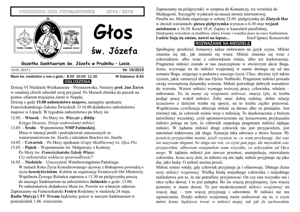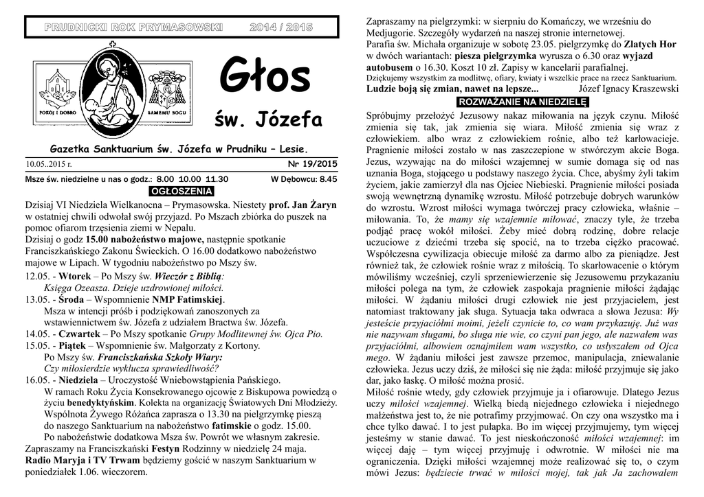 PRUDNICKI ROK PRYMASOWSKI 2014 / 2015 Głos św. Józefa Gazetka Sanktuarium św. Józefa w Prudniku – Lesie. 10.05..2015 r. Msze św. niedzielne u nas o godz.: 8.00 10.00 11.30 OGŁOSZENIA Nr 19/2015 W Dębowcu: 8.45 Dzisiaj VI Niedziela Wielkanocna – Prymasowska. Niestety prof. Jan Żaryn w ostatniej chwili odwołał swój przyjazd. Po Mszach zbiórka do puszek na pomoc ofiarom trzęsienia ziemi w Nepalu. Dzisiaj o godz 15.00 nabożeństwo majowe, następnie spotkanie Franciszkańskiego Zakonu Świeckich. O 16.00 dodatkowo nabożeństwo majowe w Lipach. W tygodniu nabożeństwo po Mszy św. 12.05. - Wtorek – Po Mszy św. Wieczór z Biblią: Księga Ozeasza. Dzieje uzdrowionej miłości. 13.05. - Środa – Wspomnienie NMP Fatimskiej. Msza w intencji próśb i podziękowań zanoszonych za wstawiennictwem św. Józefa z udziałem Bractwa św. Józefa. 14.05. - Czwartek – Po Mszy spotkanie Grupy Modlitewnej św. Ojca Pio. 15.05. - Piątek – Wspomnienie św. Małgorzaty z Kortony. Po Mszy św. Franciszkańska Szkoły Wiary: Czy miłosierdzie wyklucza sprawiedliwość? 16.05. - Niedziela – Uroczystość Wniebowstąpienia Pańskiego. W ramach Roku Życia Konsekrowanego ojcowie z Biskupowa powiedzą o życiu benedyktyńskim. Kolekta na organizację Światowych Dni Młodzieży. Wspólnota Żywego Różańca zaprasza o 13.30 na pielgrzymkę pieszą do naszego Sanktuarium na nabożeństwo fatimskie o godz. 15.00. Po nabożeństwie dodatkowa Msza św. Powrót we własnym zakresie. Zapraszamy na Franciszkański Festyn Rodzinny w niedzielę 24 maja. Radio Maryja i TV Trwam będziemy gościć w naszym Sanktuarium w poniedziałek 1.06. wieczorem. Zapraszamy na pielgrzymki: w sierpniu do Komańczy, we wrześniu do Medjugorie. Szczegóły wydarzeń na naszej stronie internetowej. Parafia św. Michała organizuje w sobotę 23.05. pielgrzymkę do Zlatych Hor w dwóch wariantach: piesza pielgrzymka wyrusza o 6.30 oraz wyjazd autobusem o 16.30. Koszt 10 zł. Zapisy w kancelarii parafialnej. Dziękujemy wszystkim za modlitwę, ofiary, kwiaty i wszelkie prace na rzecz Sanktuarium. Ludzie boją się zmian, nawet na lepsze... Józef Ignacy Kraszewski ROZWAŻANIE NA NIEDZIELĘ Spróbujmy przełożyć Jezusowy nakaz miłowania na język czynu. Miłość zmienia się tak, jak zmienia się wiara. Miłość zmienia się wraz z człowiekiem. albo wraz z człowiekiem rośnie, albo też karłowacieje. Pragnienie miłości zostało w nas zaszczepione w stwórczym akcie Boga. Jezus, wzywając na do miłości wzajemnej w sumie domaga się od nas uznania Boga, stojącego u podstawy naszego życia. Chce, abyśmy żyli takim życiem, jakie zamierzył dla nas Ojciec Niebieski. Pragnienie miłości posiada swoją wewnętrzną dynamikę wzrostu. Miłość potrzebuje dobrych warunków do wzrostu. Wzrost miłości wymaga twórczej pracy człowieka, właśnie – miłowania. To, że mamy się wzajemnie miłować, znaczy tyle, że trzeba podjąć pracę wokół miłości. Żeby mieć dobrą rodzinę, dobre relacje uczuciowe z dziećmi trzeba się spocić, na to trzeba ciężko pracować. Współczesna cywilizacja obiecuje miłość za darmo albo za pieniądze. Jest również tak, że człowiek rośnie wraz z miłością. To skarłowacenie o którym mówiliśmy wcześniej, czyli sprzeniewierzenie się Jezusowemu przykazaniu miłości polega na tym, że człowiek zaspokaja pragnienie miłości żądając miłości. W żądaniu miłości drugi człowiek nie jest przyjacielem, jest natomiast traktowany jak sługa. Sytuacja taka odwraca a słowa Jezusa: Wy jesteście przyjaciółmi moimi, jeżeli czynicie to, co wam przykazuję. Już was nie nazywam sługami, bo sługa nie wie, co czyni pan jego, ale nazwałem was przyjaciółmi, albowiem oznajmiłem wam wszystko, co usłyszałem od Ojca mego. W żądaniu miłości jest zawsze przemoc, manipulacja, zniewalanie człowieka. Jezus uczy dziś, że miłości się nie żąda: miłość przyjmuje się jako dar, jako łaskę. O miłość można prosić. Miłość rośnie wtedy, gdy człowiek przyjmuje ja i ofiarowuje. Dlatego Jezus uczy miłości wzajemnej. Wielką biedą niejednego człowieka i niejednego małżeństwa jest to, że nie potrafimy przyjmować. On czy ona wszystko ma i chce tylko dawać. I to jest pułapka. Bo im więcej przyjmujemy, tym więcej jesteśmy w stanie dawać. To jest nieskończoność miłości wzajemnej: im więcej daję – tym więcej przyjmuję i odwrotnie. W miłości nie ma ograniczenia. Dzięki miłości wzajemnej może realizować się to, o czym mówi Jezus: będziecie trwać w miłości mojej, tak jak Ja zachowałem przykazania Ojca mego i trwam w Jego miłości. Jezus daje nam przykazanie miłości wzajemnej, ponieważ chce udzielić nam daru życia pełnego, życia naprawdę. Człowiek bowiem rodzi się jako owoc miłości. Jezus który uczy nas dziś miłości wzajemnej pragnie, aby każdy człowiek rodził się jako owoc miłości. Kiedy życie ludzkie nie jest owocem miłości, wtedy jest zranione, nieraz bardzo głęboko. Jezus powie: Nikt nie ma większej miłości od tej, gdy ktoś życie swoje oddaje za przyjaciół swoich. Są różne rodzaje miłości. W każdej jednak jest coś zasadniczego, sedno, jednakowe dla wszystkich. W każdej miłości chodzi o jedno – o życie. Miłość to życie, to oddawanie życia za przyjaciół. Tam gdzie jest miłość, tam jest życie. Człowiek czuje głębię życia i żyje pełnią życia, kiedy jest kochany. Konsekwencje braku miłości wzajemnej są straszne: Za to, żeś nic nie kochał, nic nie czcił, prócz siebie, prócz siebie i myśli swoich, potępion jesteś, potępion na wieki – tak mówi Chór Głosów do hrabiego Henryka w Nie Boskiej Komedii Krasińskiego (cz. IV). człowiek czuje głębię życia wtedy, kiedy czuje się kochany. Dlatego Jezus zapewnia o Swojej bezgranicznej miłości do człowieka: Jak Mnie umiłował Ojciec, tak i Ja was umiłowałem. Wytrwajcie w miłości m