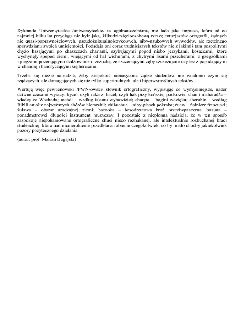 Dyktando Uniwersyteckie /uniwersyteckie/ to ogólnouczelniana, nie lada jaka impreza, która od co najmniej kilku lat przyciąga nie byle jaką, kilkudziesięcioosobową rzeszę entuzjastów ortografii, żądnych nie quasi-poprawnościowych, pseudokulturalnojęzykowych, niby-naukowych wywodów, ale rzetelnego sprawdzianu swoich umiejętności. Pożądają oni coraz trudniejszych tekstów nie z jakimiś tam pospolitymi chyżo hasającymi po chaszczach chartami, szybującymi popod niebo jerzykami, kosaćcami, które wychynęły spopod ziemi, wiejącymi od hal wichurami, z chytrymi lisami przecherami, z gżegżółkami i piegżami pożerającymi dżdżownice i rzeżuchę, ze szczerzącymi zęby szczeżujami czy też z popadającymi w chandrę i handryczącymi się herosami. Trzeba się nieźle natrudzić, żeby zaspokoić nienasycone żądze studentów nie wiadomo czym się rządzących, ale domagających się nie tylko supertrudnych, ale i hiperwymyślnych tekstów. Wertuję więc pewuenowski /PWN-owski/ słownik ortograficzny, wypisując co wymyślniejsze, nader dziwne czasami wyrazy: hycel, czyli rakarz; hacel, czyli hak przy końskiej podkowie; chan i maharadża – władcy ze Wschodu; mahdi – według islamu wybawiciel; charyta – bogini wdzięku; cherubin – według Biblii anioł z najwyższych chórów hierarchii; chihuahua – niby-piesek pokraka; żuaw – żołnierz francuski; żuława – obszar urodzajnej ziemi; bazooka – bezodrzutowa broń przeciwpancerna; bazuna – ponadmetrowej długości instrument muzyczny. I pozostaję z niepłonną nadzieją, że w ten sposób zaspokoję niepohamowane ortograficzne chuci nieco rozhukanej, ale intelektualnie rozbuchanej braci studenckiej, która nad nicnierobienie przedkłada robienie czegokolwiek, co by miało choćby jakiekolwiek pozory pożytecznego działania. (autor: prof. Marian Bugajski)