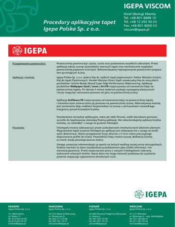 IGEPA VISCOM Procedury aplikacyjne tapet Igepa Polska Sp. z o.o. Dział Obsługi Klienta Tel. +48 801 8888 10 Tel. +48 12 292 40 23 Fax. +48 801 8000 53 [email protected] Przygotowanie powierzchni:Powierzchnia powinna być czysta, sucha oraz pozbawiona wszelkich zabrudzeń. Przed aplikacją należy usunąć pozostałości starszych tapet oraz mechanicznie wygładzić powierzchnię papierem ściernych. Rekomendujemy impregnowanie powierzchni preparatem gruntującym ściany. Aplikacja i montaż:Igepa Polska Sp. z o.o. poleca klej do ciężkich tapet papierowych: Pattex Metylan Instant; klej do tapet flizelinowych: Henkel Metylan Direct bądź uniwersalny klej do wszystkich produktów: Solvite Ready Mixed Super High Performance Wallcovering. Aplikację produktów Wallpaper Sand / Linen / Art FR rozpoczynamy od naniesienia kleju na powierzchnię tapety. Po okresie 5 minut materiał uzyskuje wymaganą elastyczność i bryty mogą być nanoszone pionowo od góry na powierzchnię ściany. Aplikację ArtFleece FR rozpoczynamy od naniesienia kleju na powierzchnię tapety i niezwłocznym umieszczeniu jej pionowo na powierzchnię ściany. Alternatywną metodą jest naniesienie kleju wałkiem bezpośrednio na ścianę z zachowaniem niewielkiego marginesu ponad krawędzie brytów. Standardowe narzędzia aplikacyjne, takie jak rakle filcowe, wałki dociskowe gumowe, szczotki do tapetowania ułatwiają finalną aplikację. Nie rekomendujemy aplikacji brytów metodą „na zakładkę” z uwagi na grubość fototapet. Pozostałe:Fototapety można zabezpieczyć przed uszkodzeniami mechanicznymi lakierem płynnym. Wygrzewanie bądź suszenie fototapet po aplikacji jest niebezpieczne z uwagi na możliwość delaminacji. Warto przygotować bryty dłuższe o 2-3cm celem precyzyjnego dopasowania grafiki do ściany. Pozostałości kleju można usunąć delikatną ścierką w chwili, kiedy pozostaje jeszcze mokry. Uwaga: powyższe rekomendacje są oparte na testach według naszej oceny wiarygodnych. Podane wartości to dane standardowe przedstawione jako źródło informacji i nie stanowią gwarancji. Przed rozpoczęciem pracy z naszymi Fototapetami zalecamy wykonanie własnych testów. Nasze dane nie mogą stanowić podstawy do uzyskania prawnie wiążącego zapewnienia określonych cech. KRAKÓW WARSZAWA POZNAŃ WROCŁAW 31-588 Kraków ul. Siwka 11 tel. 012 643 55 06 fax 012 643 55 07 [email protected] 05-270 Marki k/Warszawy ul. Słoneczna 3c tel. 022 771 25 08 fax 022 781 16 57 [email protected] 62-080 Tarnowo Podgórne k/Poznania ul. Sowia 6 tel. 061 657 10 00 fax 061 657 10 10 [email protected] 52-131 Wrocław ul. Buforowa 2 - woj. dolnośląskie tel. 071 363 86 47 fax 071 367 03 46 [email protected] Igepa Polska Sp. z o.o. Igepa Polska Sp. z o.o. Igepa Polska Sp. z o.o. Igepa Polska Sp. z o.o.